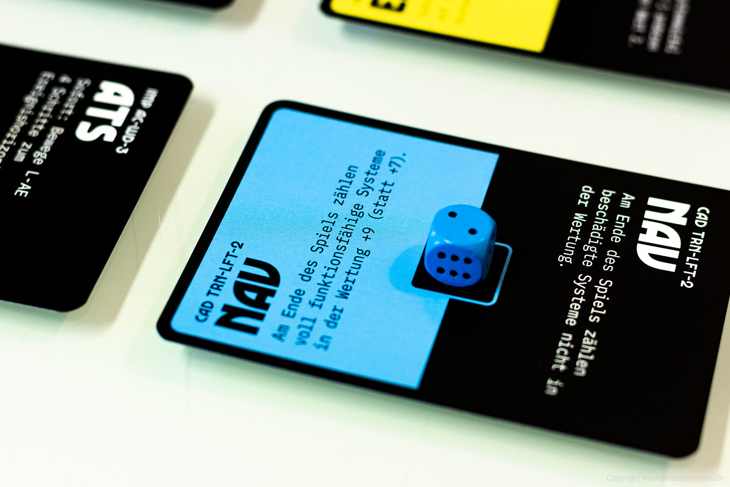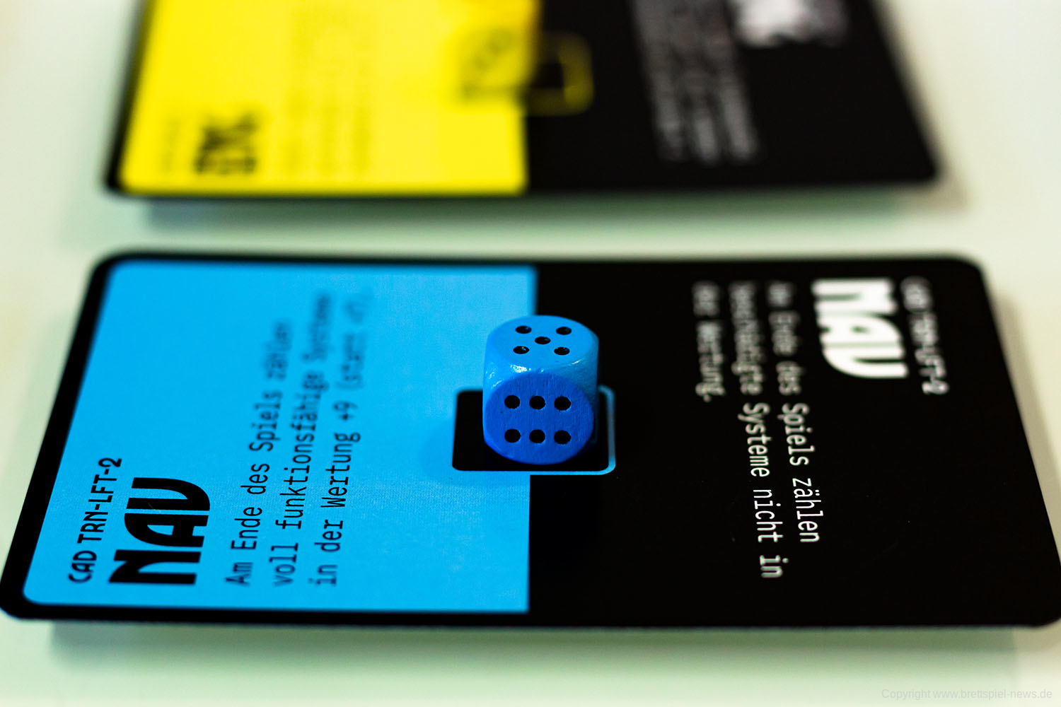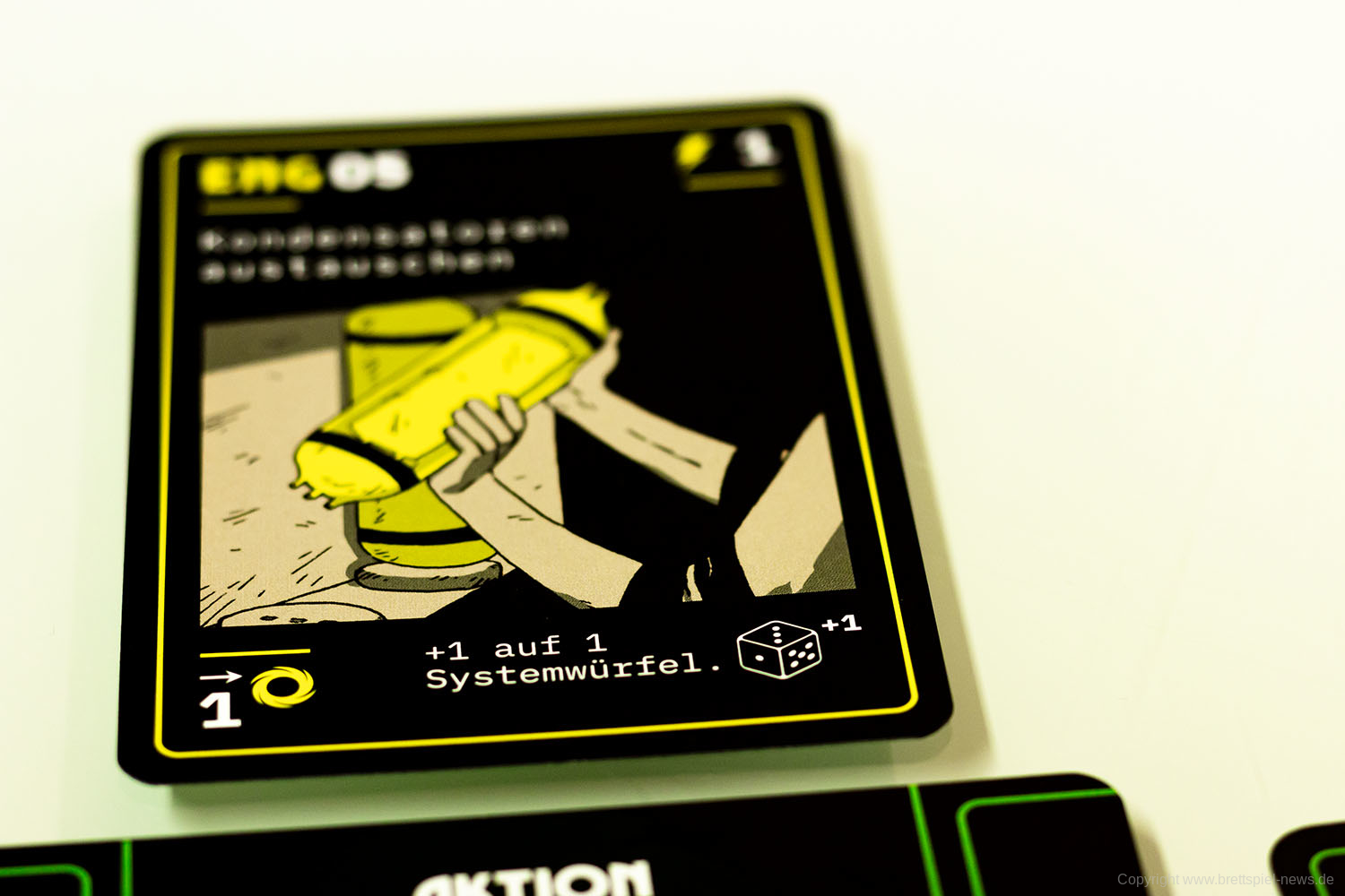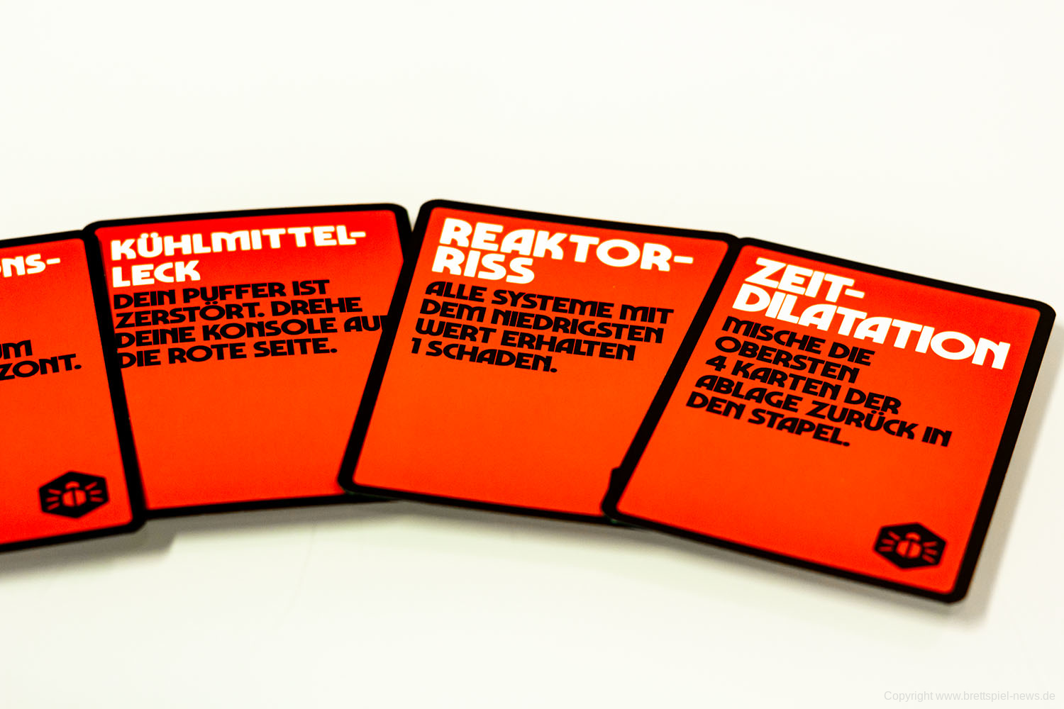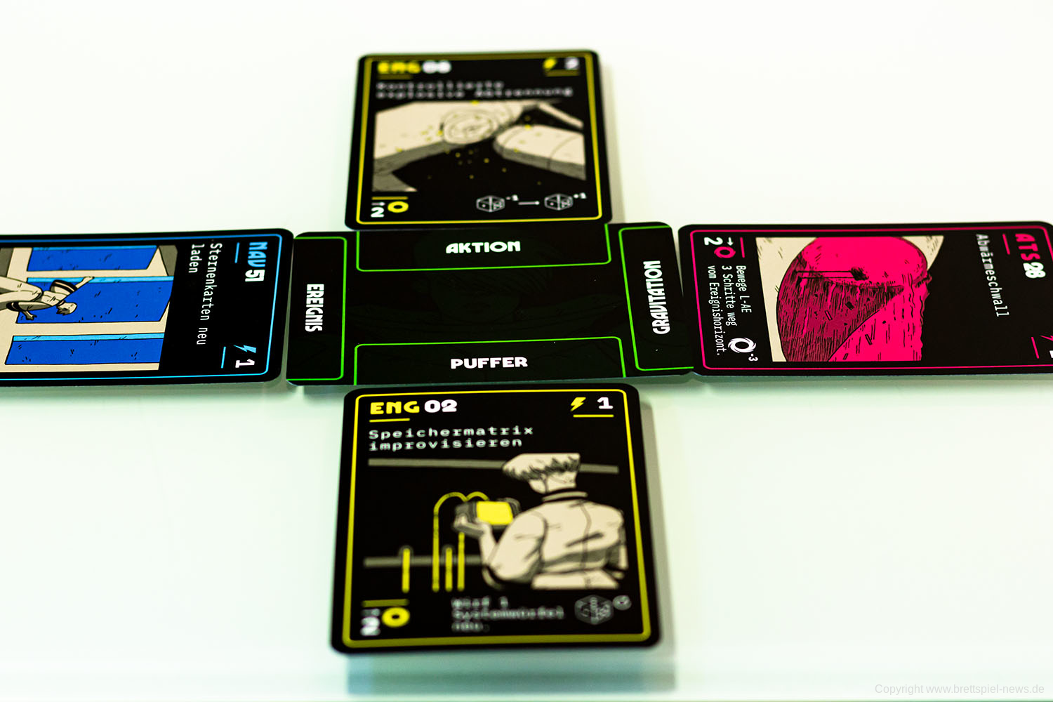 Zudem ist die Abstraktion der Karten in diesem Kontext tatsächlich sehr gut durchdacht und förderlich. Das Relevante an den Karten sind zwei Zahlenwerte und der Text. Durch die nüchterne Optik ist das Auge nicht abgelenkt, es werden keine opulenten Grafiken geliefert, die kaum jemand wertgeschätzt hätte. Sie hätten das Spiel nicht besser gemacht, sondern unter Umständen sogar gestört.