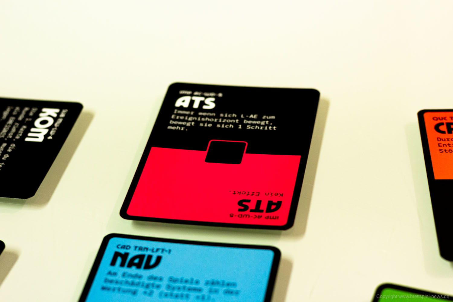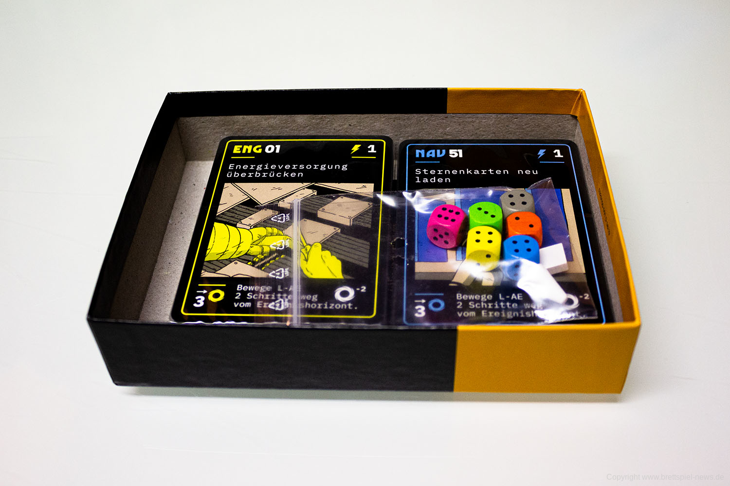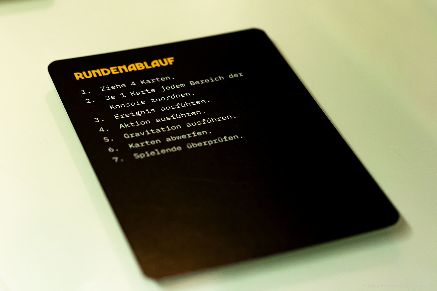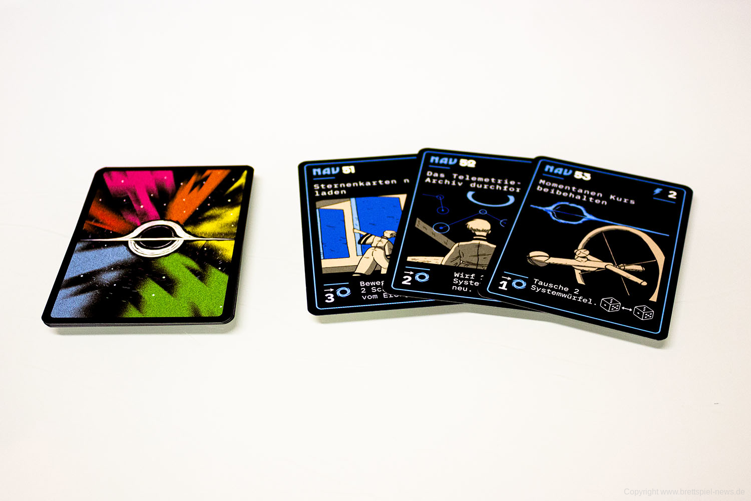 Ein Kartenspiel für eine Person? Ich wusste zunächst nicht so recht, was ich davon halten sollte. Die Optik ist abstrakt und ich fragte mich wirklich, was an dem Spiel, ein Raumschiff in ablaufender Zeit vor einem schwarzen Loch zu retten, reizen sollte. So landete es vorerst in der Schublade für ungespielte kleine Spiele.