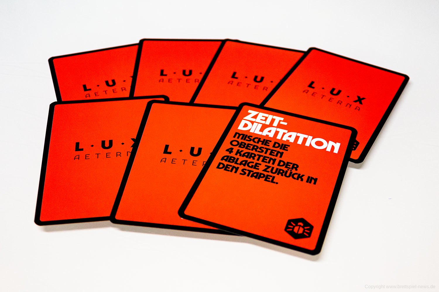 Das Spielgefühl ist bei LUX AETERNA wirklich gut: Das Auslegen der Karten muss schnell gehen und die Entscheidungen müssen zügig getroffen werden, dann alles abhandeln und zügig alles von vorne beginnen. Das erzeugt einen Flow und einen hohen Wiederspielreiz.