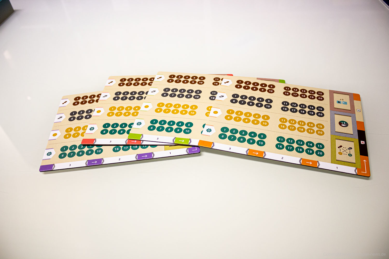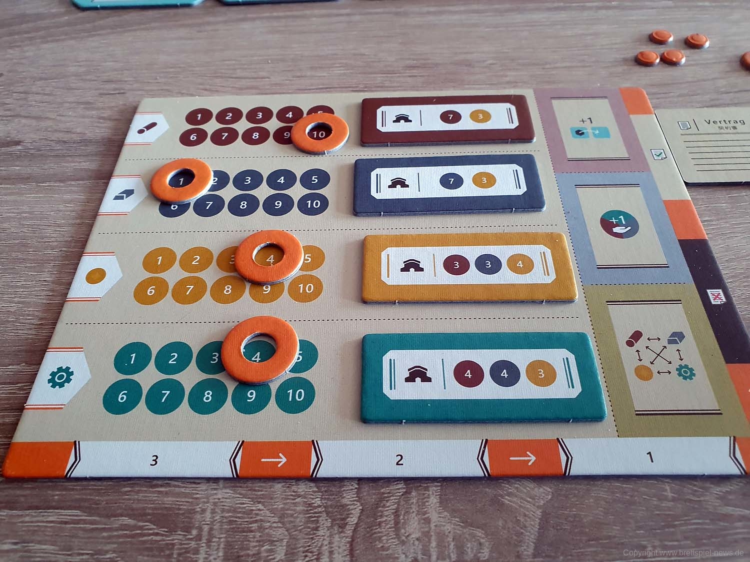 Besonders die „Getriebe“-Mechanik, die das Spielfeld ändert, bietet sehr viele Möglichkeiten für neue Strategien oder die Chance, dem Gegner seine Strategie zu verbauen. Das Artwork und das generelle Grafikdesign des Spiels sind dabei, wie so oft, Geschmackssache. Wie ich aber schon angesprochen habe, ist das Textdesign jedoch ein Problem für viele Spielergruppen. Ich persönlich hatte große Probleme, das Regelbuch in einem Anlauf zu lesen, da ich viele Pausen aufgrund der Textgröße machen musste. Da auch die Textgröße auf den Aktionsfeldern die gleiche ist, könnten Spieler mit größeren Spieltischen ebenso Probleme haben, die Texte eindeutig zu erkennen.