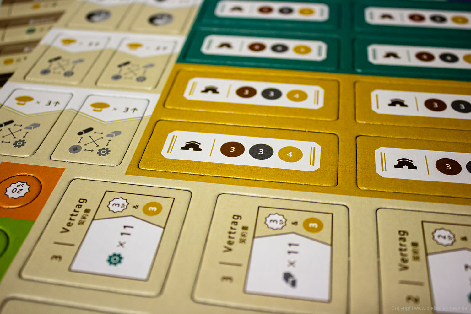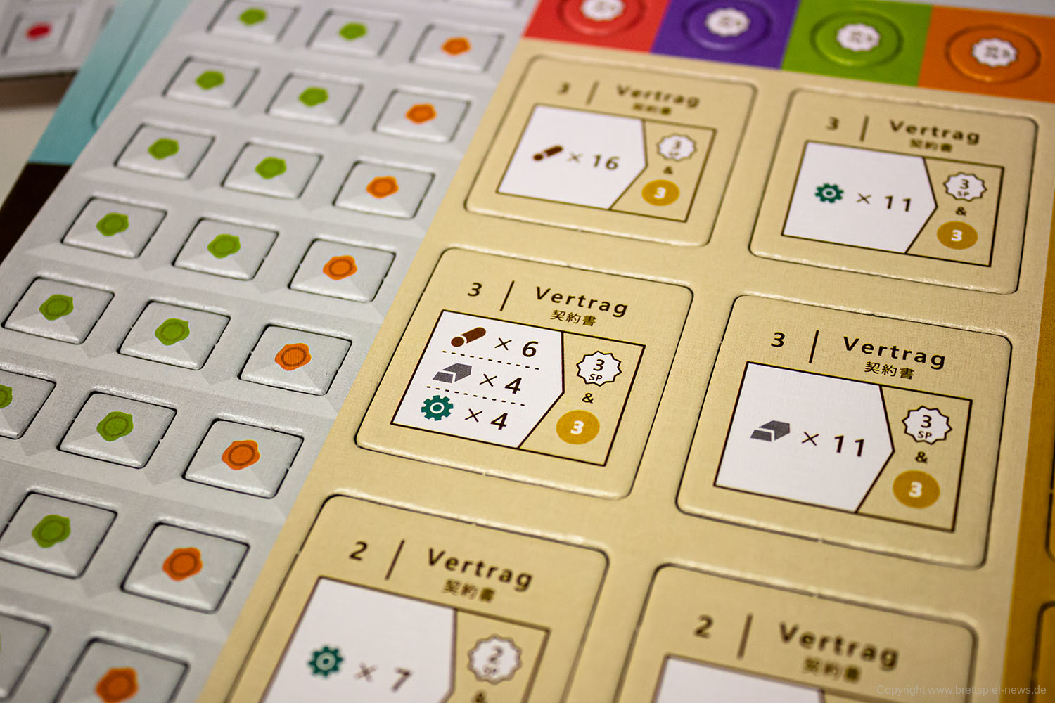 Dass das Spielmaterial hauptsächlich aus Pappe besteht, ist grundsätzlich kein Problem, jedoch empfanden wir es als etwas „too much“. Besonders die kleinen Marker für Siegpunkte werden durch kleine Pappscheiben dargestellt, die wir beinahe weggeworfen hätten, da sie Überresten aus Ausstanzbögen sehr ähnelten. Die Entscheidung, diese Textgröße und dieses Material zu wählen, ist mit hoher Wahrscheinlichkeit aufgrund des niedrig erwarteten Absatzes mit dem Ziel getroffen worden, den Preis so niedrig wie möglich zu halten. Für spätere Versionen wären aber vielleicht ein paar Holzmarker für die Siegpunkte und ein bis zwei Seiten im Regelbuch mehr, um die Textgröße wenigstens um einen Schritt zu vergrößern, wirklich hilfreich.