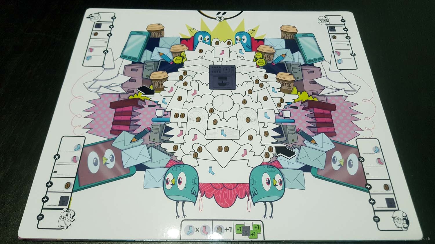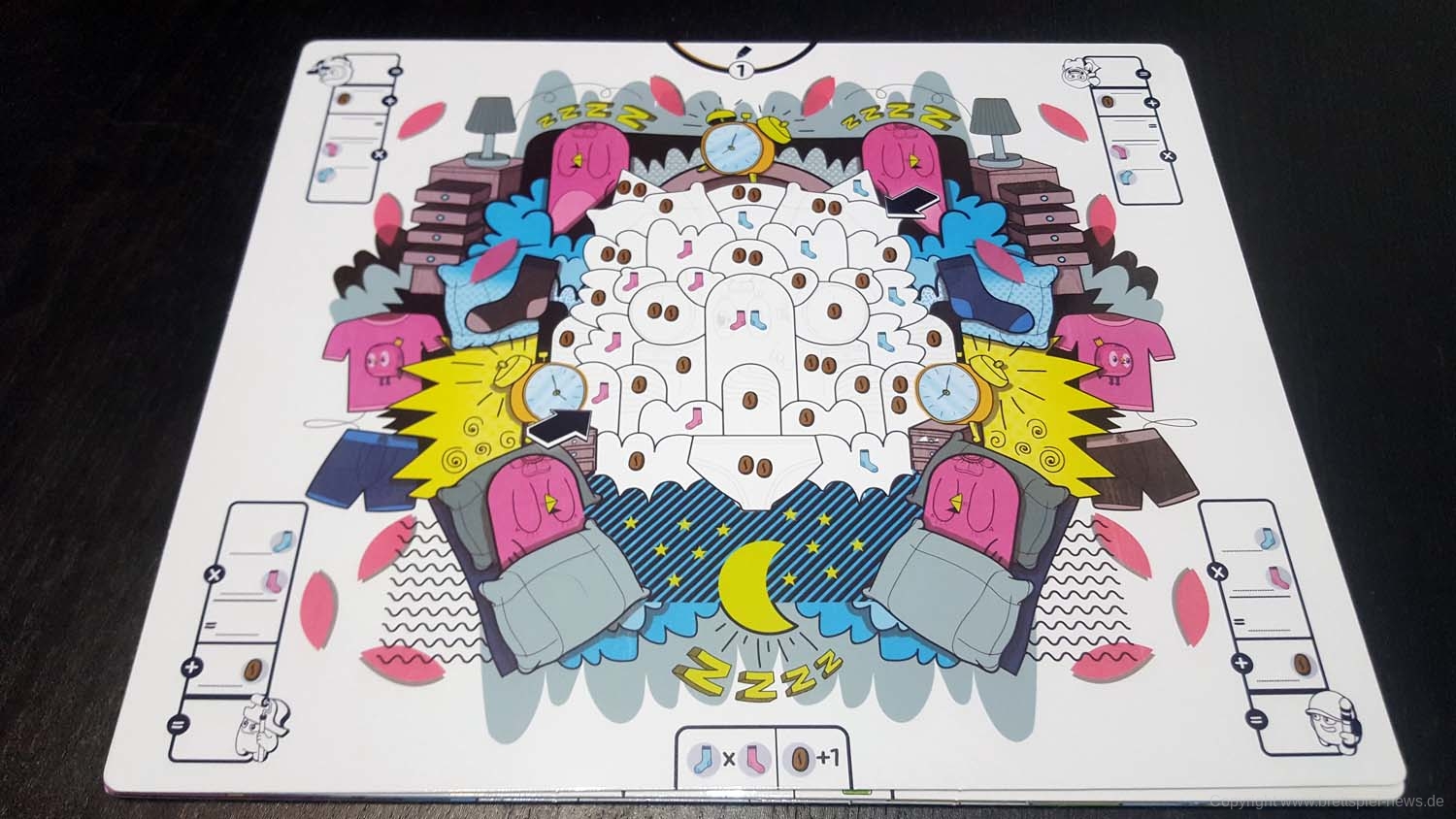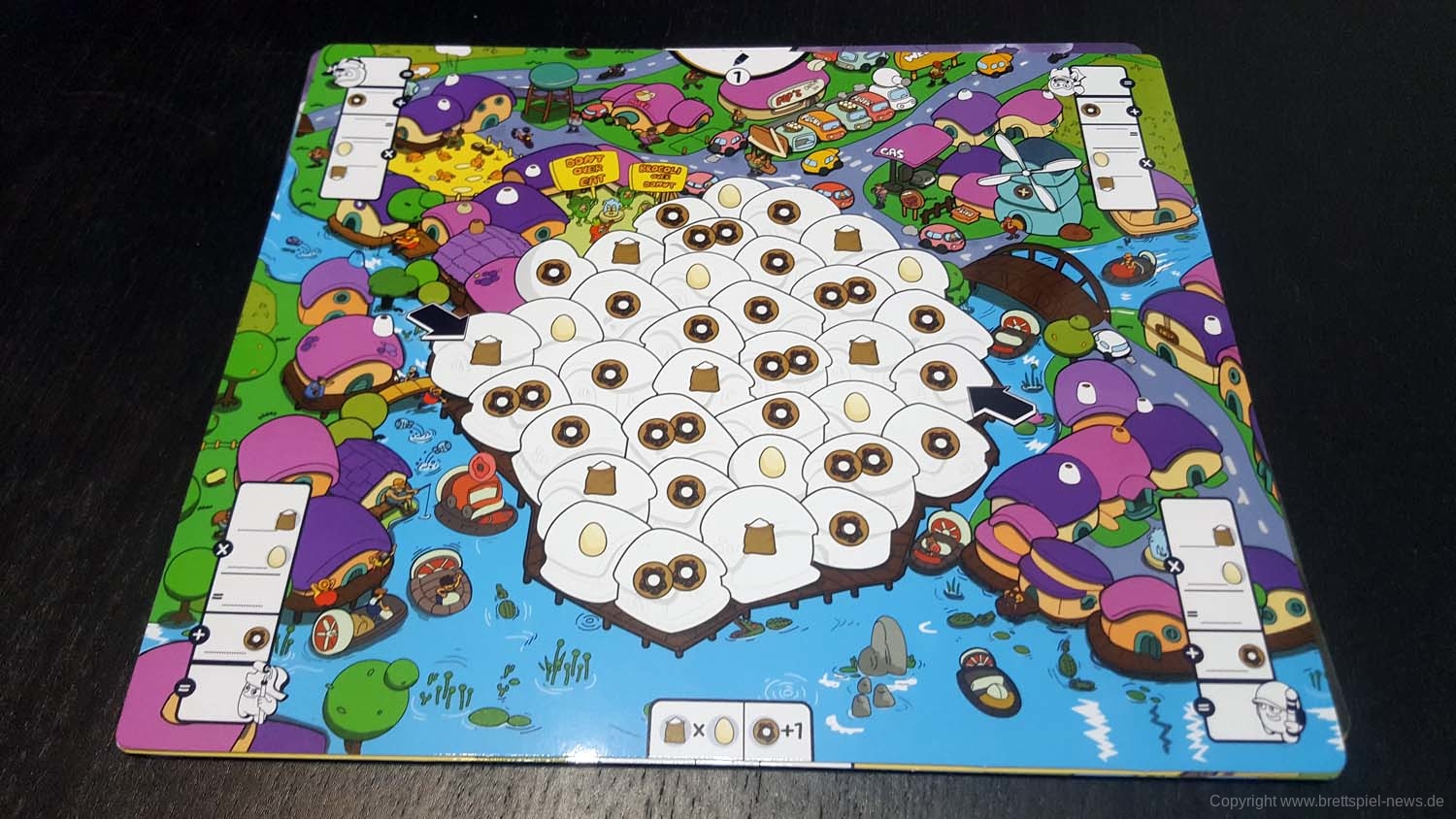 Das Spiel steckt in einer 33x30x6 cm großen Pappschachtel. Enthalten sind 4 abwischbare Folienstifte, 18 doppelseitige Spielpläne, 1 Radierer, die Anleitung und viel Luft. Das Design der Spielpläne ist eine Geschmacksfrage, da sie teilweise sehr überfrachtet wirken, aber passend zu diesem kunterbunten Spiel. Die bemalten Flächen lassen sich schnell und super leicht wieder abwischen, aber leider wird aus dem Hellgrün schnell ein leichtes Braun, wenn einmal über Rot gemalt wurde.