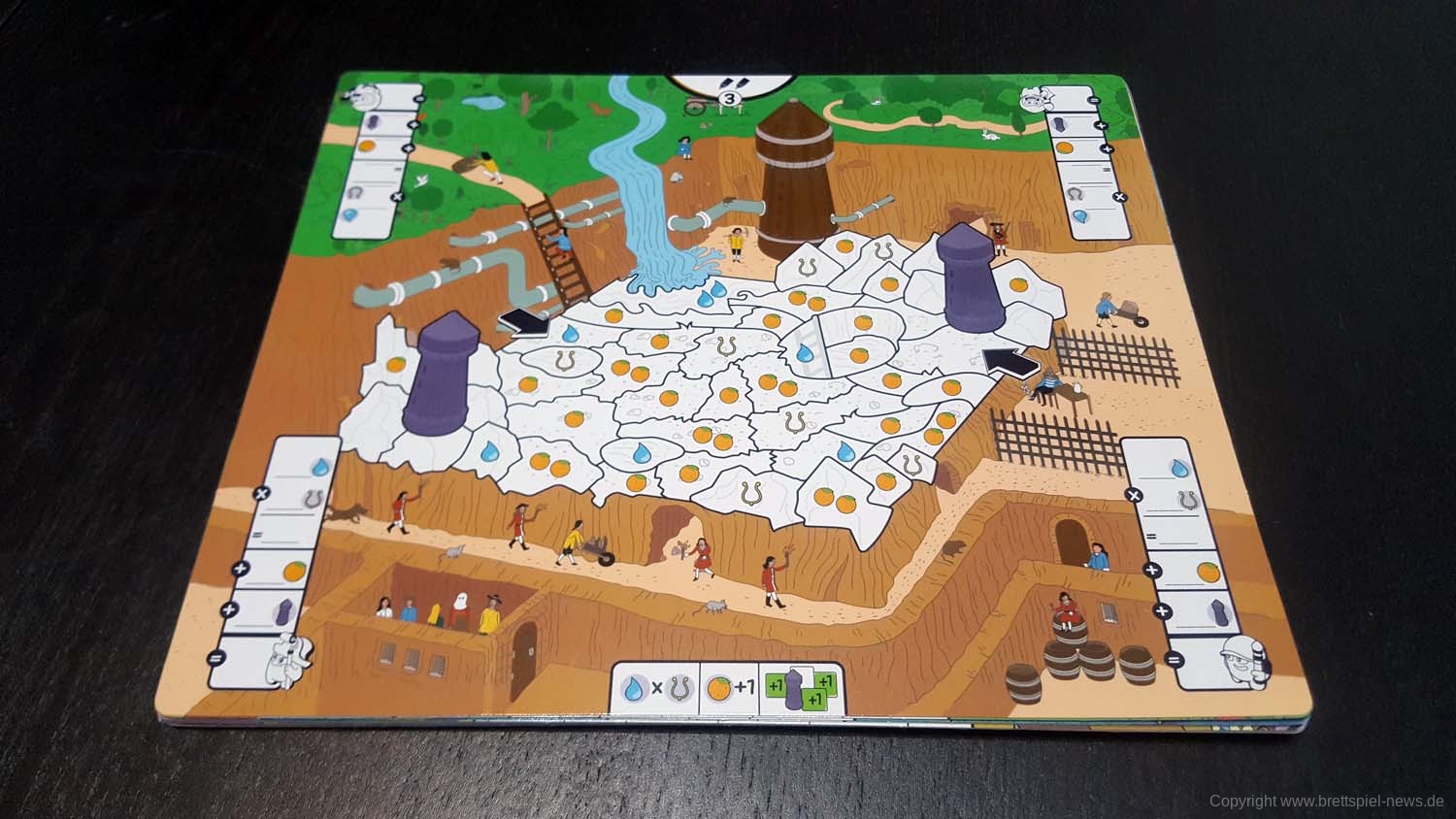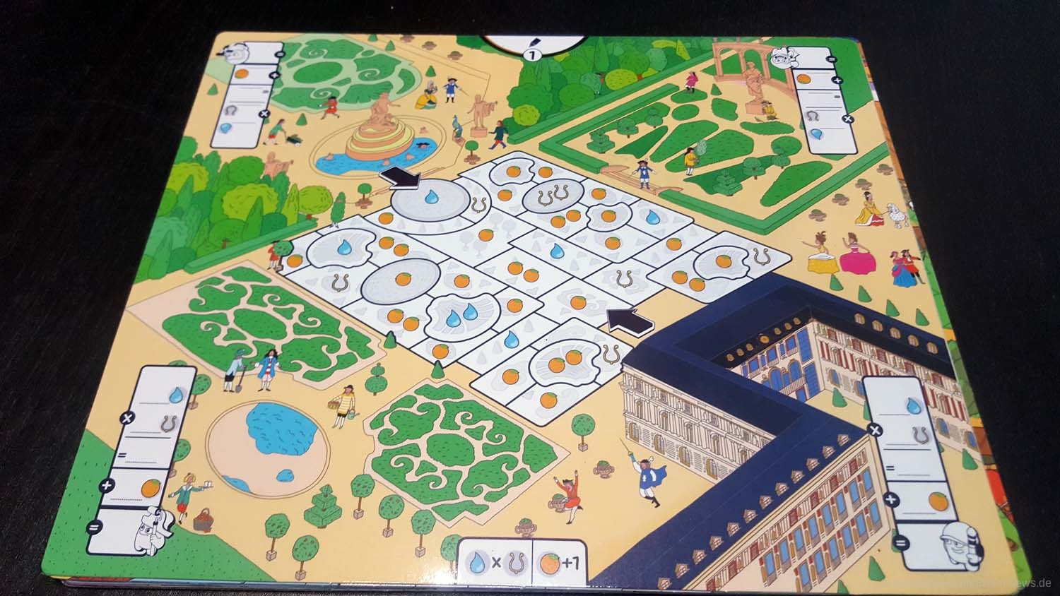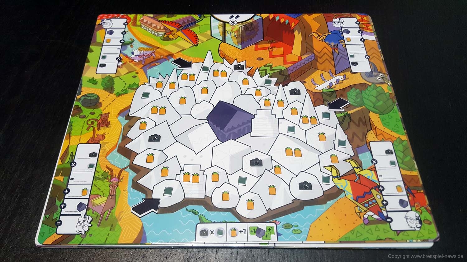 Das Spiel steckt in einer 33x30x6 cm großen Pappschachtel. Enthalten sind 4 abwischbare Folienstifte, 18 doppelseitige Spielpläne, 1 Radierer, die Anleitung und viel Luft. Das Design der Spielpläne ist eine Geschmacksfrage, da sie teilweise sehr überfrachtet wirken, aber passend zu diesem kunterbunten Spiel. Die bemalten Flächen lassen sich schnell und super leicht wieder abwischen, aber leider wird aus dem Hellgrün schnell ein leichtes Braun, wenn einmal über Rot gemalt wurde.