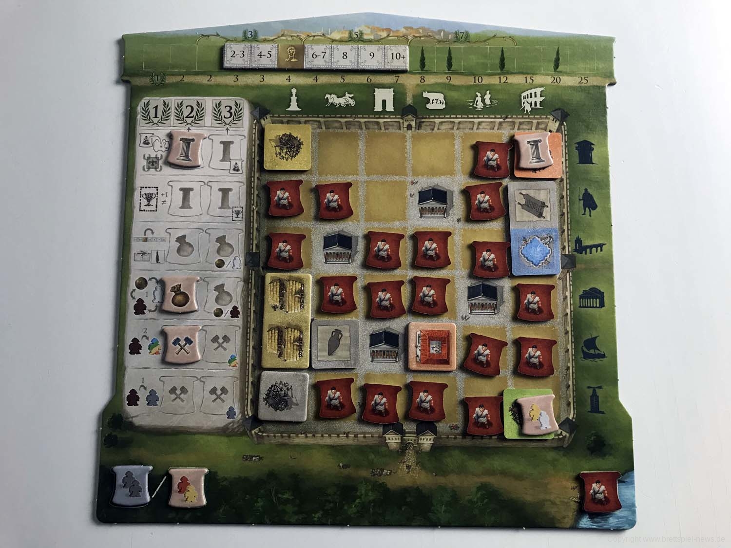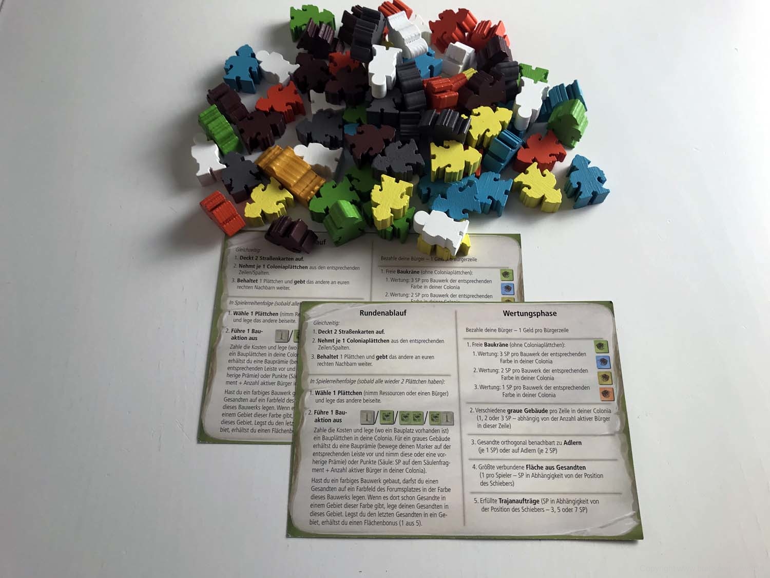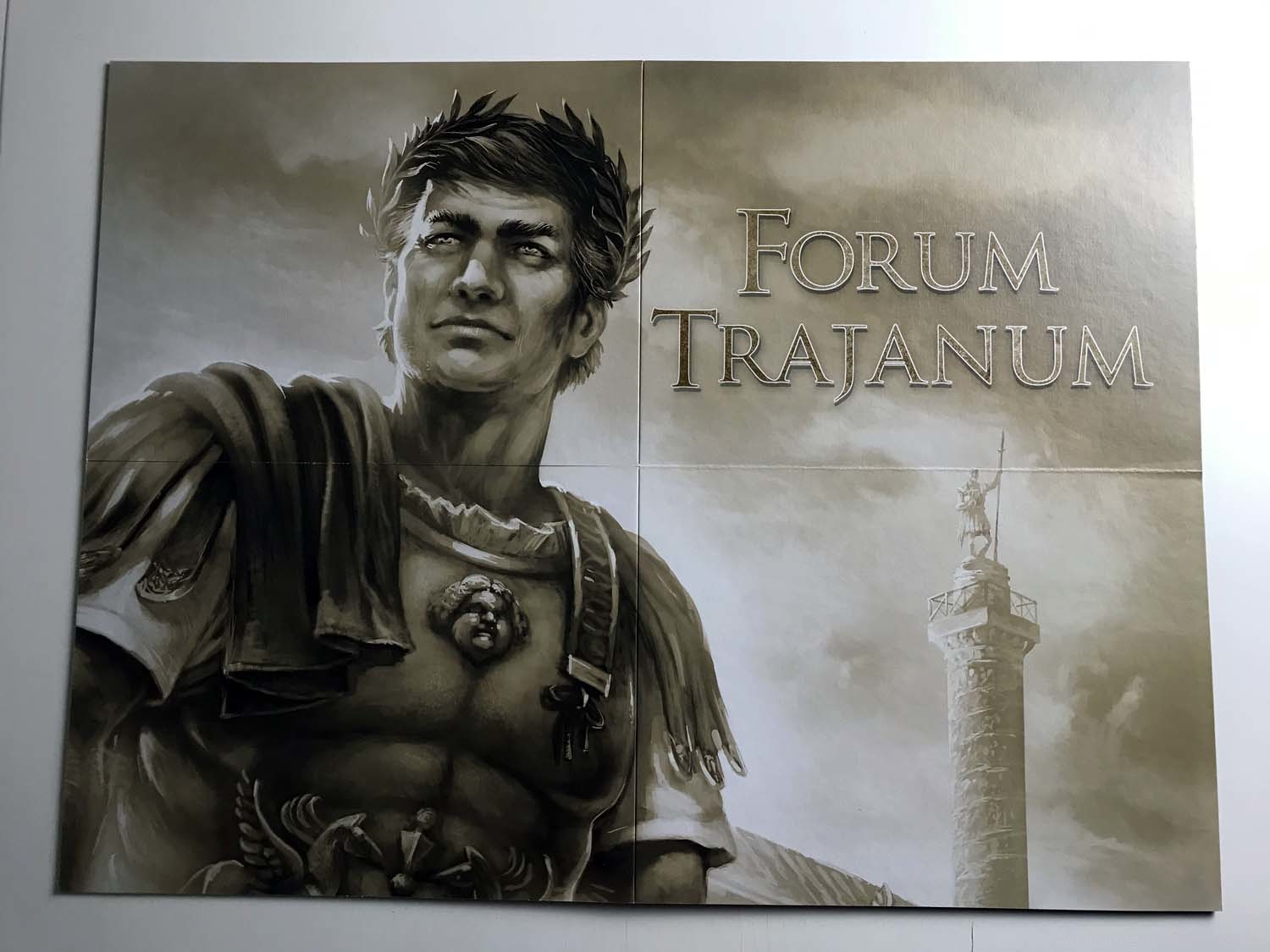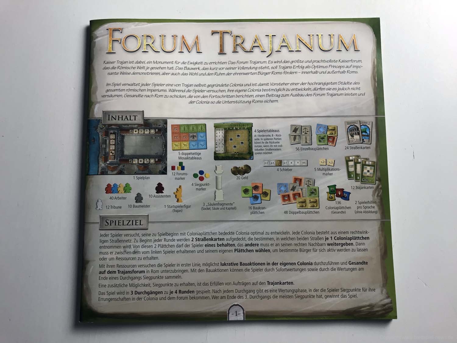 Dennoch handelt es sich bei FORUM TRAJANUM nicht um ein schlechtes Spiel. Die Regel ist verständlich geschrieben und wird auf kleinen Übersichtskarten sinnvoll zusammengefasst. Das Material ist von sehr guter Qualität. Die Downtime zwischen den Zügen ist gering. Wer dem Spiel den bereits erwähnten Glücksfaktor verzeiht, wird zudem aufgrund der zahlreichen Siegpunktmöglichkeiten viel experimentieren können.