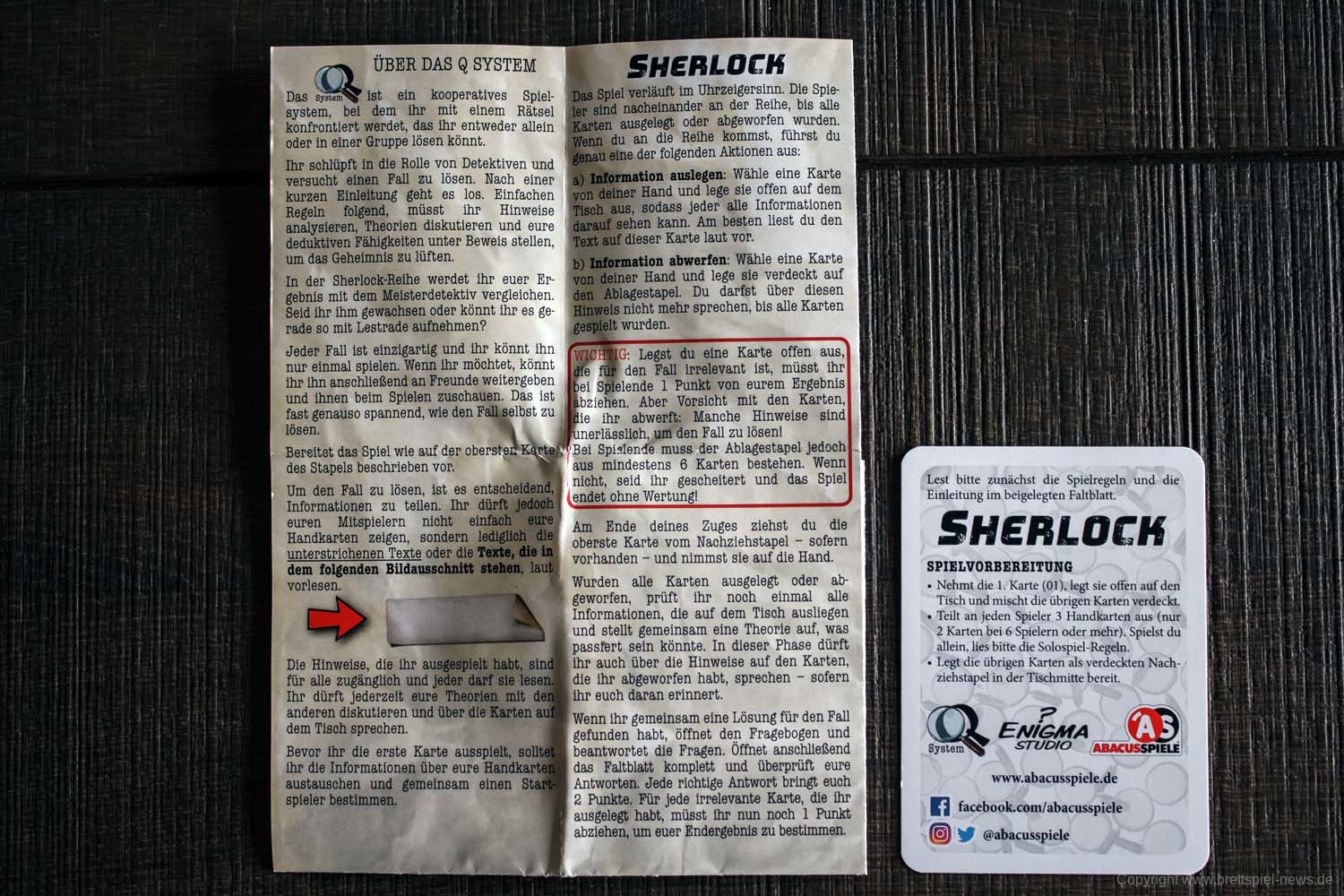 Auf den Faltzetteln mit der Anleitung finden sich, wie gewohnt, neben der Regelerklärung die Fragen und Antworten, bei denen mittels Aufkleber verhindert wird, dass sie aus Versehen zu früh eingesehen werden können. Die Erklärung der Regeln ist eindeutig und das nicht sonderlich komplizierte und sehr überschaubare Regelwerk wird gut erklärt.