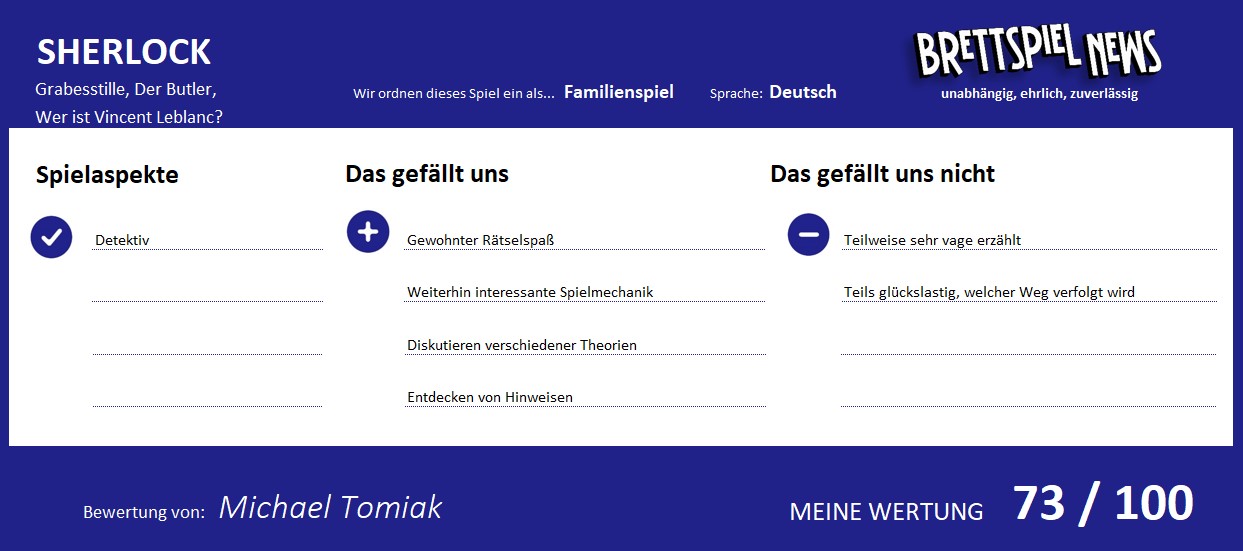 Bei DER BUTLER fühlten wir uns teils auch ein wenig alleingelassen. Hier haben wir den Kern des Ganzen zwar durchschauen können, am Ende blieben allerdings offene Fragen, wieso gerade diese Lösung die richtige ist, da nicht alles komplett schlüssig erschien. Am besten zu lösen war für unseren Geschmack noch WER IST VINCENT LEBLANC? Hier haben wir, wie bei den anderen beiden Fällen auch, zwar nur die Stufe eines Watson erreicht, allerdings konnten wir klar nachvollziehen, an welchen Stellen wir nicht aufmerksam genug waren und wieso wir Fragen falsch beantwortet haben.
