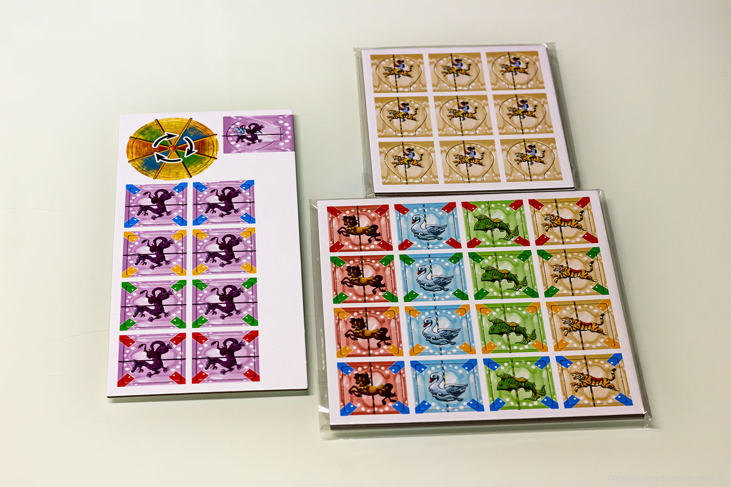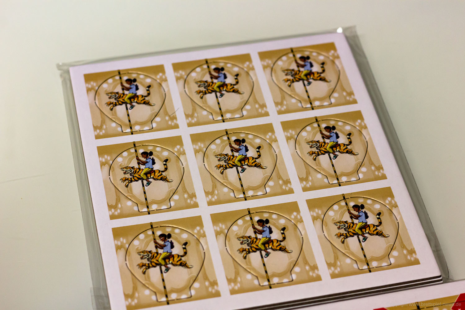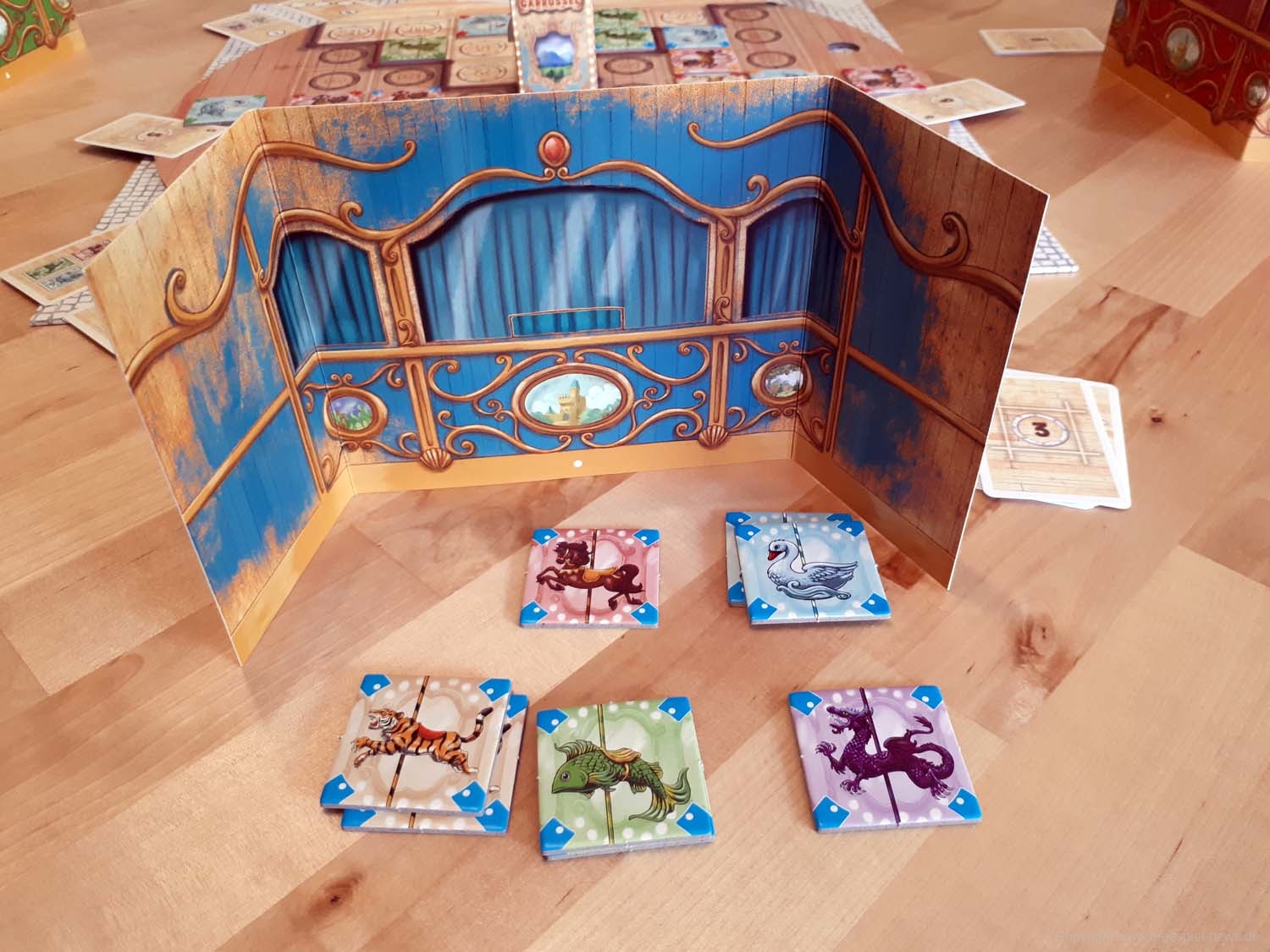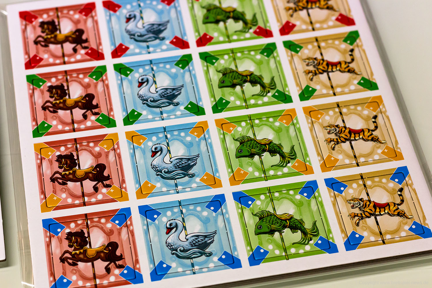 Das Spiel punktet außerdem mit seiner wunderschönen Aufmachung und dem wertigen Spielmaterial. Leider wurde bei CARROSSEL aber ausgerechnet an den zahllosen Standfüßen für die Kunden-Aufsteller gespart. Diese schließen nicht eng genug ab, was den Spielaufbau jedes Mal gravierend verlangsamt und dazu führt, dass die Pappen mit der Zeit kaputt gehen.