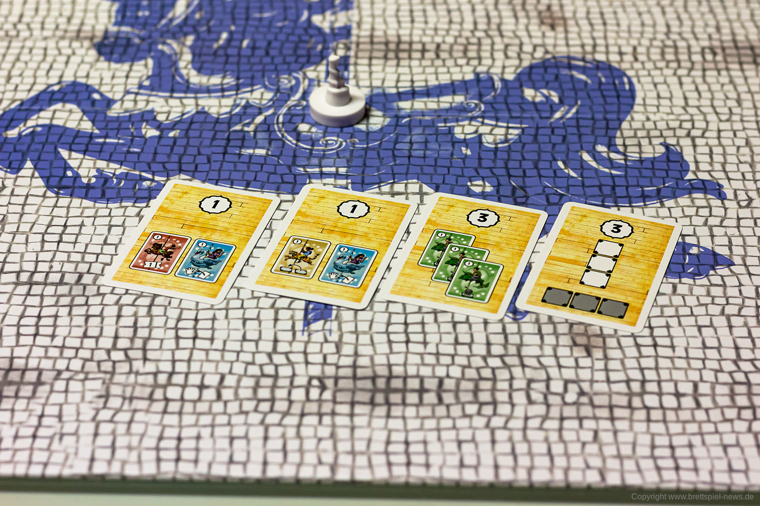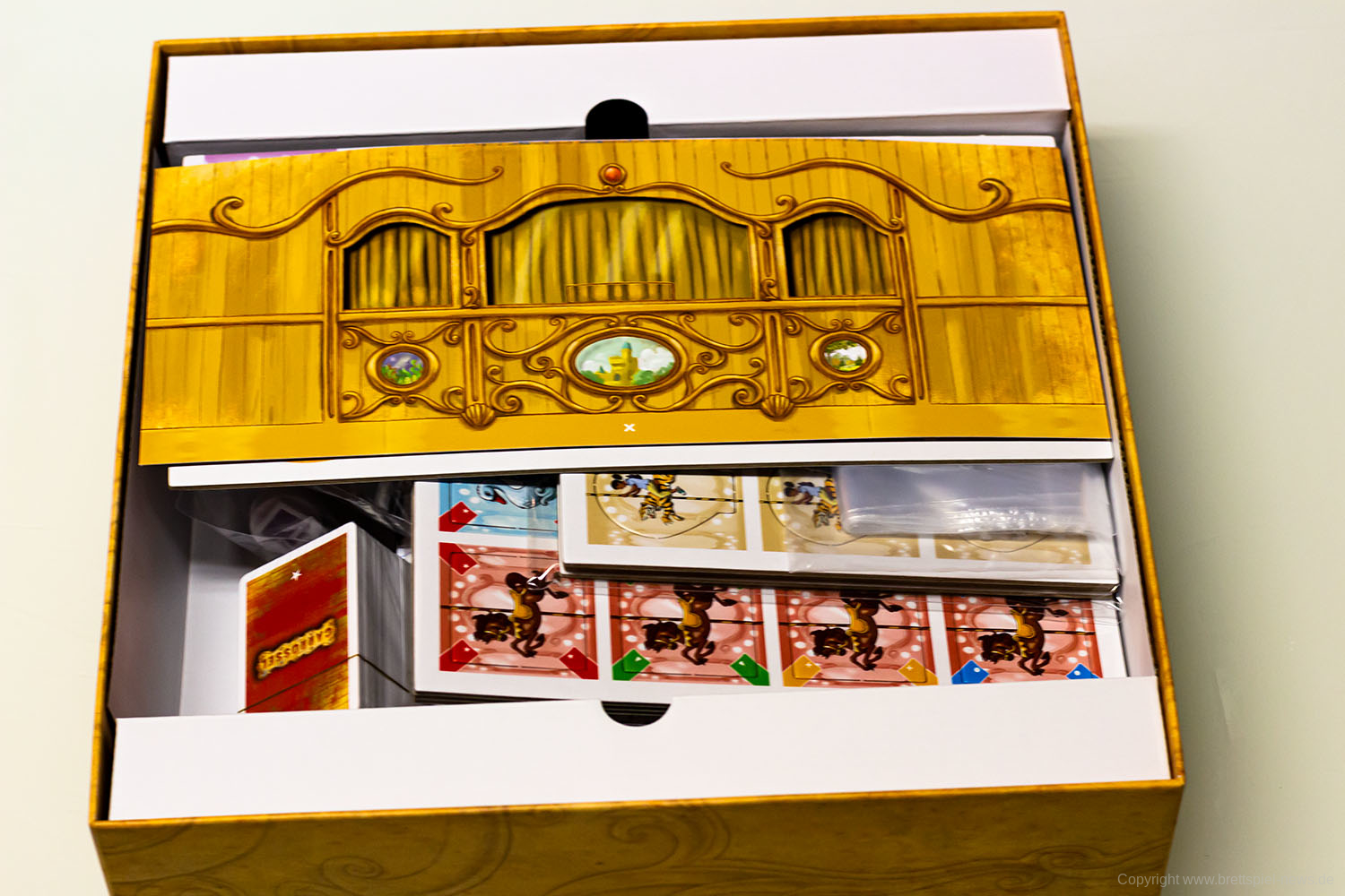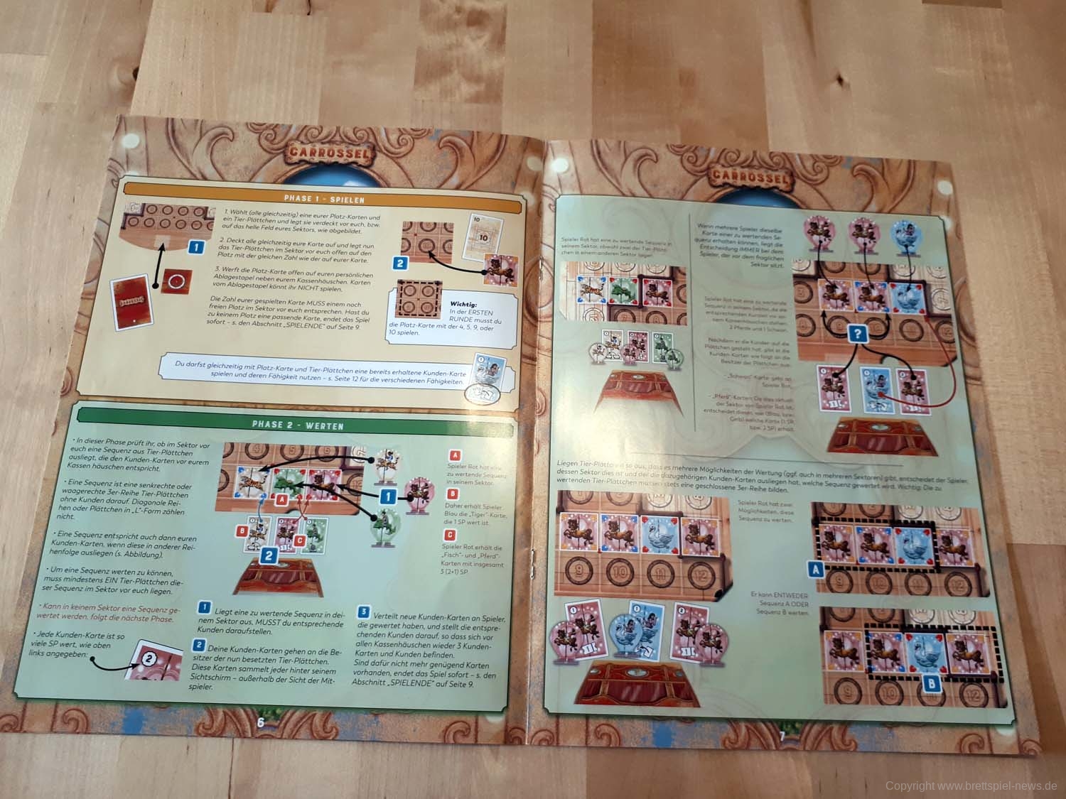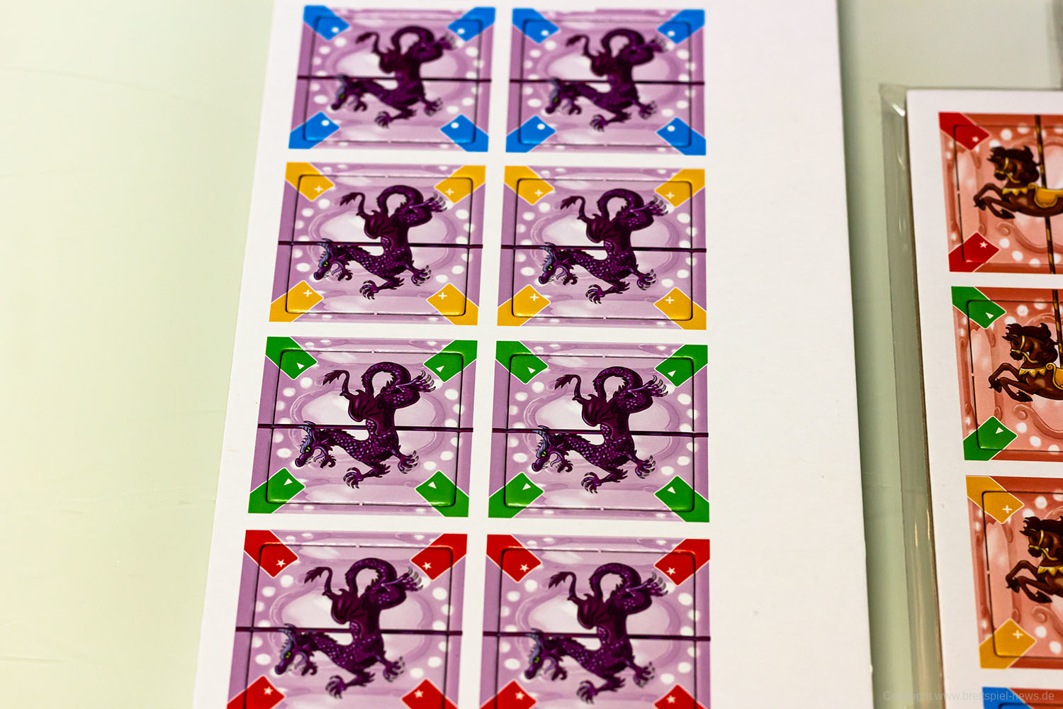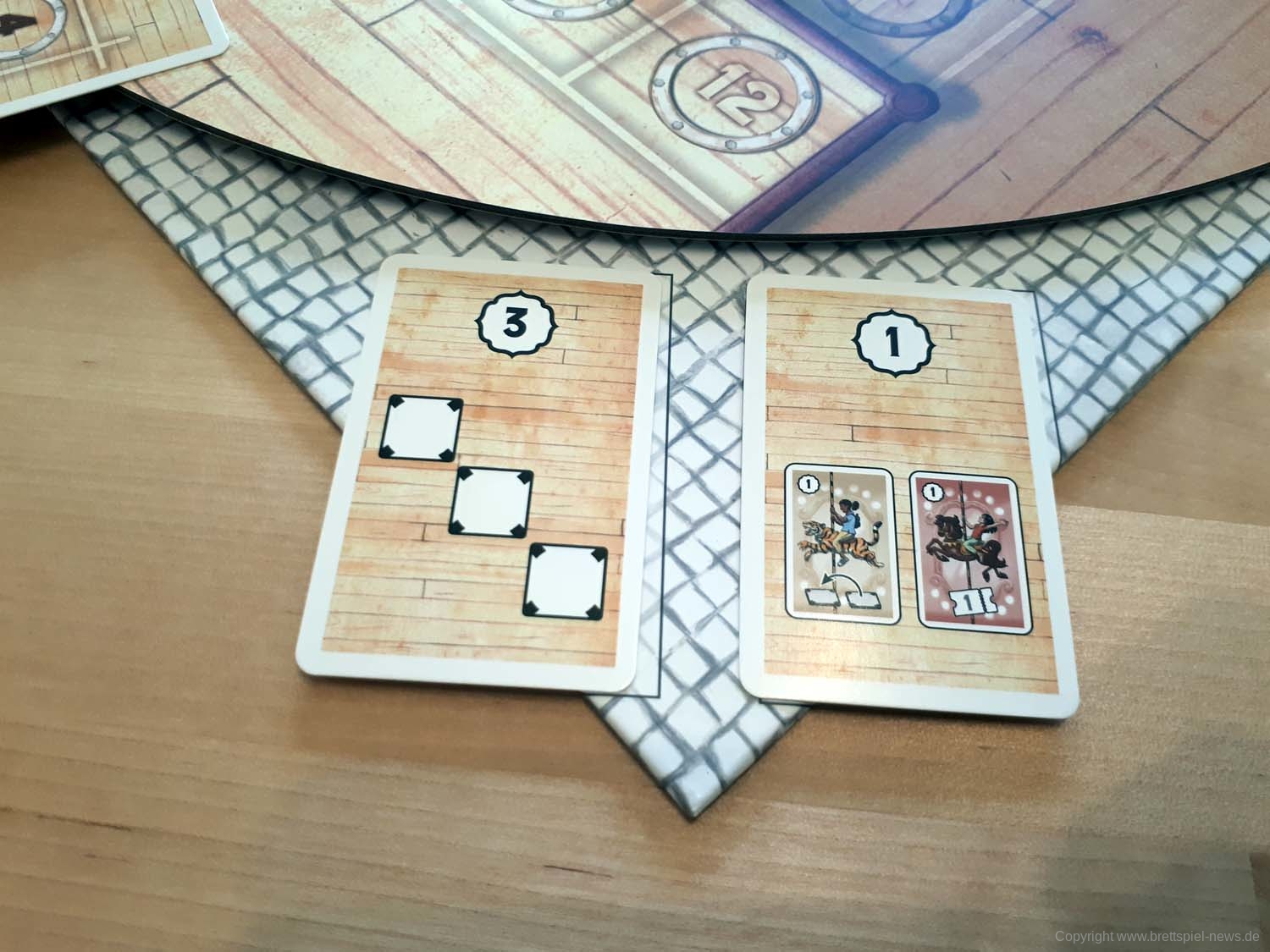 Das Spiel punktet außerdem mit seiner wunderschönen Aufmachung und dem wertigen Spielmaterial. Leider wurde bei CARROSSEL aber ausgerechnet an den zahllosen Standfüßen für die Kunden-Aufsteller gespart. Diese schließen nicht eng genug ab, was den Spielaufbau jedes Mal gravierend verlangsamt und dazu führt, dass die Pappen mit der Zeit kaputt gehen.