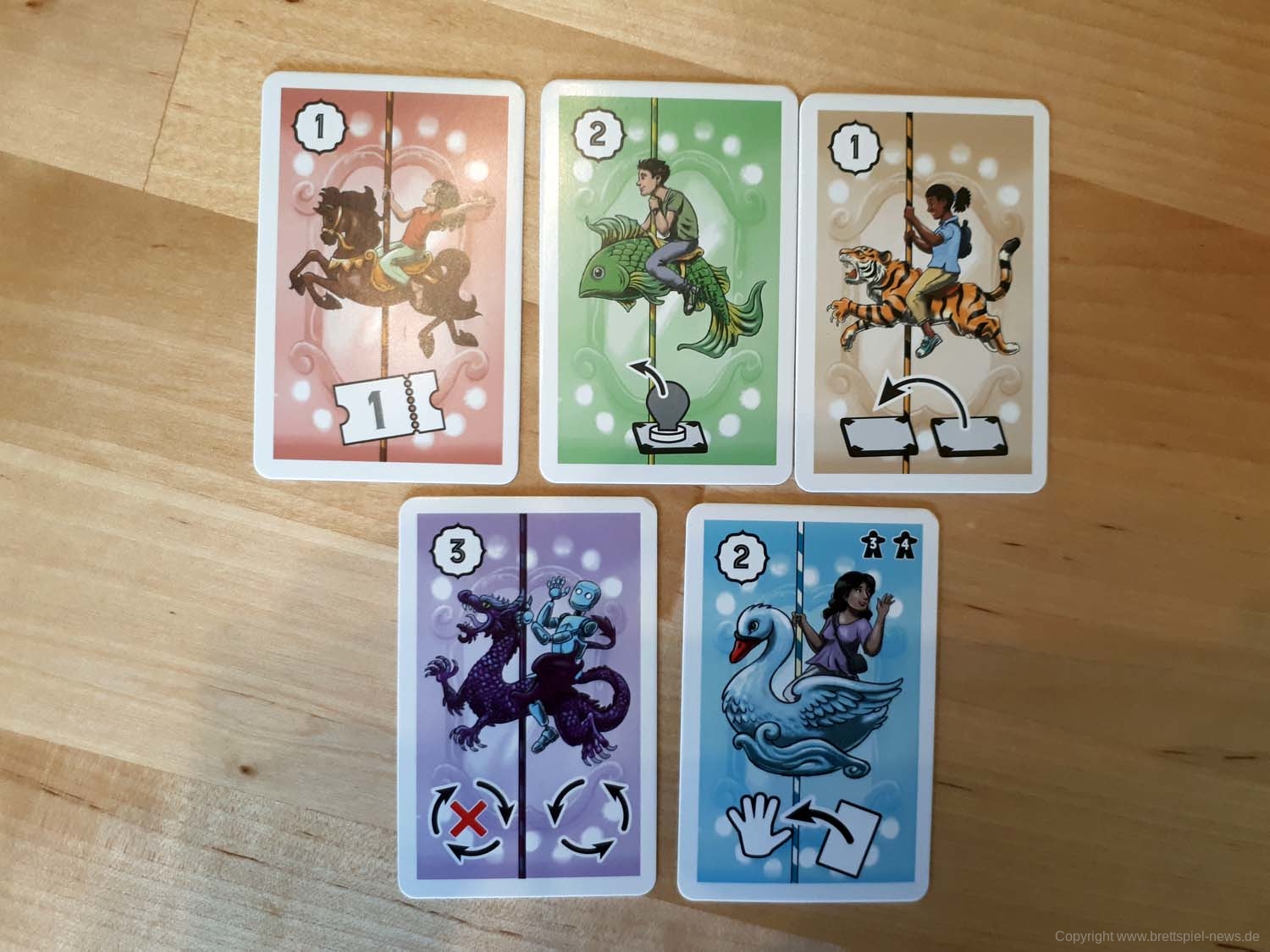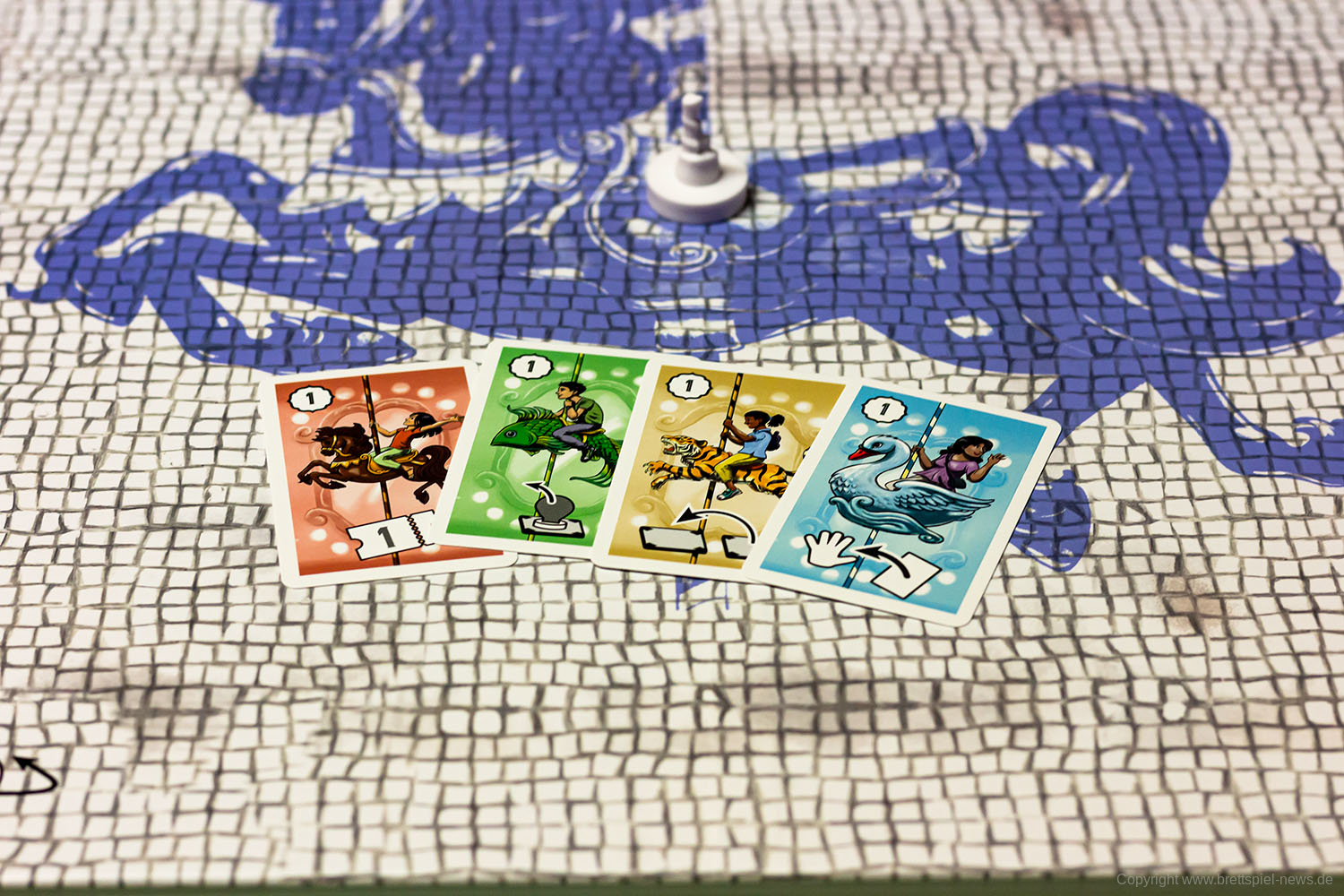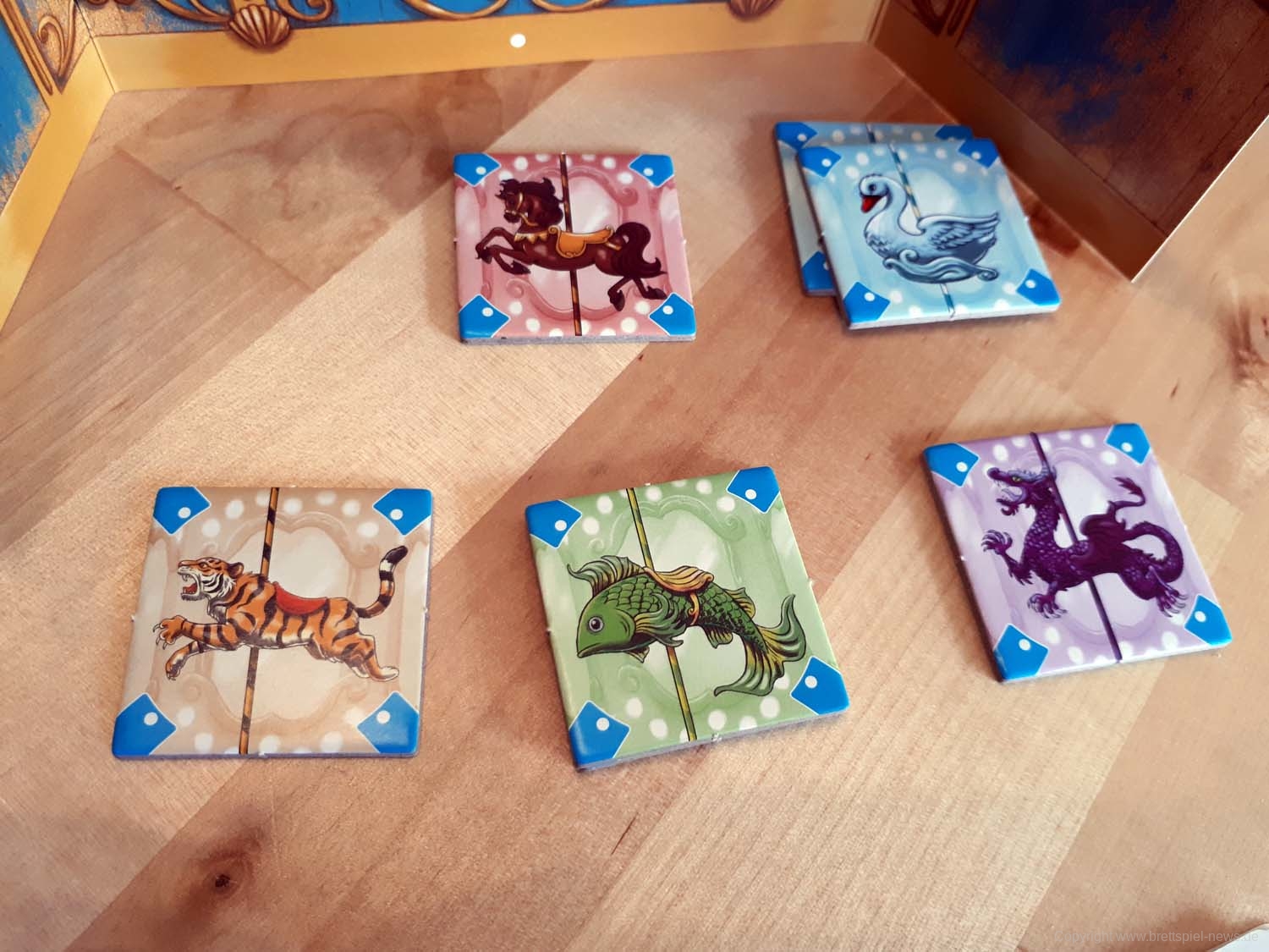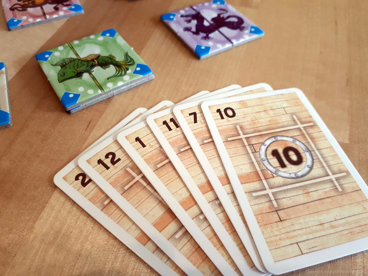 Weil CARROSSEL für mich ein taktisches Spiel auf seichtem Kennerniveau ist, finde ich es etwas schade, dass eine Fahrt aufgrund der geringen Anzahl an Kundenkarten viel zu schnell endet. Das ist vor allem dann problematisch, wenn Spieler:innen bis kurz vor Schluss keine Fisch-Karte ergattern konnten, da nur mit dieser die eigenen Kunden von den Tier-Plättchen entfernt werden können und somit eine erneute Wertung dieser ausgelöst wird. Gelingt ihnen dies vielleicht auch aus Pech nicht, ist der Sieg ziemlich sicher dahin.