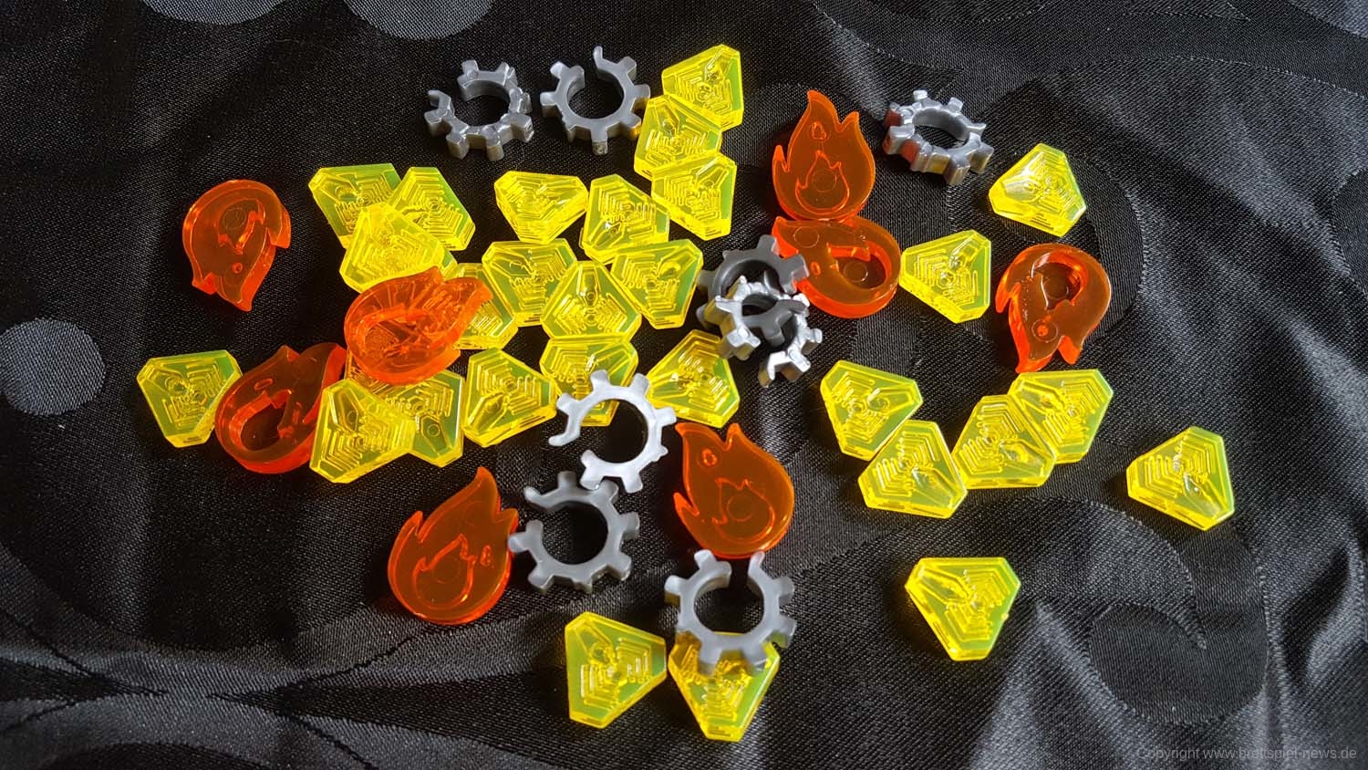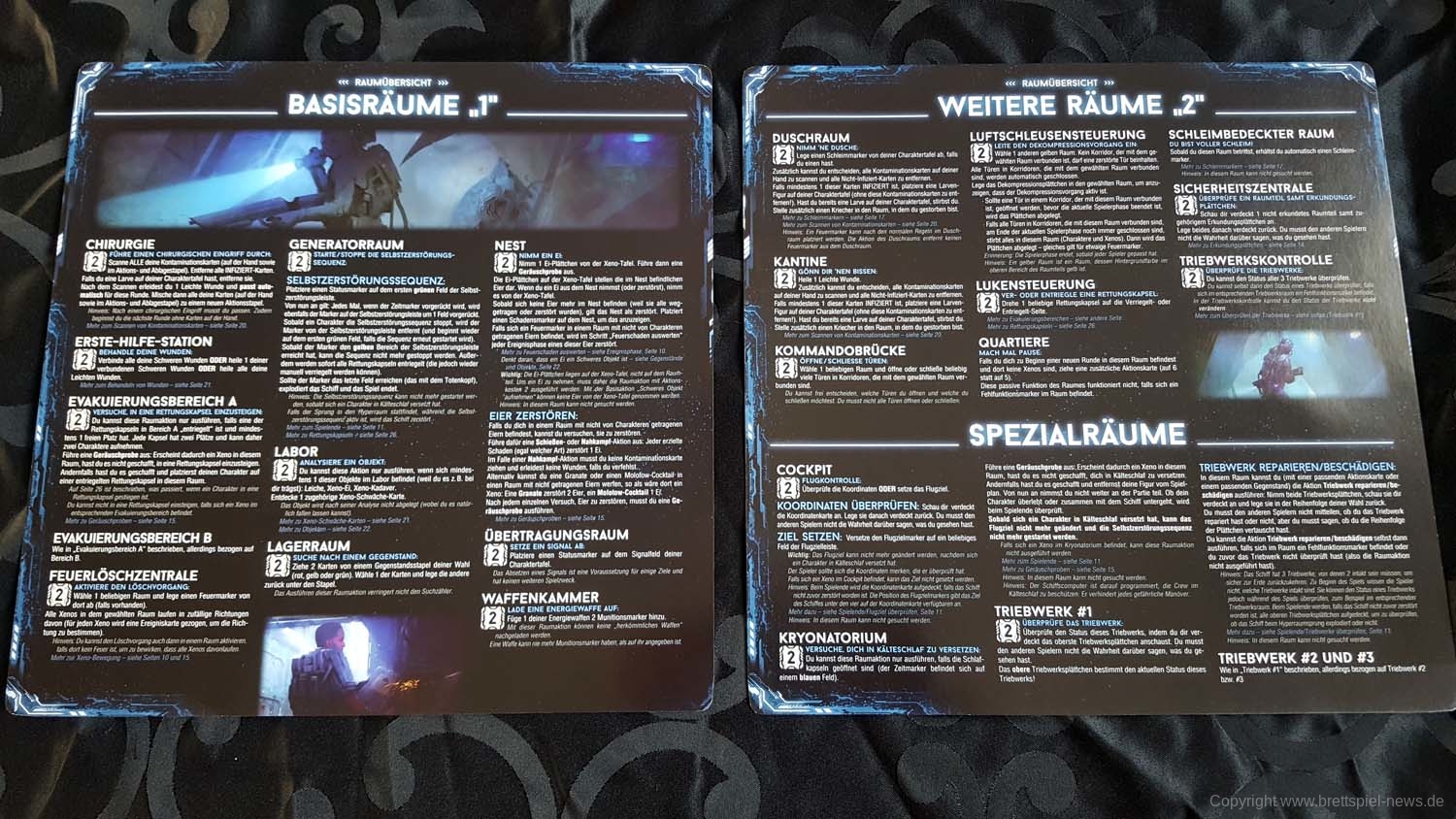 Das Spiel steckt in einer riesigen 29,5x29,5x14,5cm Box und enthält haufenweise Material. Da wären 1 doppelseitiger Spielplan, 6 Charaktertafeln, 20 Raumteile, 1 Infektionsscanner, 1 Xenotafel, 1 Xenobeutel, 2 Angriffswürfel, 2 Geräuschwürfel, 5 Kartenhalter, 18 Statusmarker in Form von Glassteinen, 50 Munitions-/Schadensmarker aus Acryl, 30 Geräuschmarker aus Acryl, 8 Feuermarker aus Acryl, 8 Fehlfunktionsmarker ebenfalls aus Acryl, 12 Türplättchen mit Standfüßen, 6 Triebwerksplättchen, 2 5er-Schadensplättchen, 4 Rettungskapselplättchen, 8 Xenoeierplättchen, 20 Erkundungsplättchen, 27 Xenoplättchen, 5 Leichenplättchen, 8 Xeno-Kadaverplättchen, 1 Startspielerplättchen, 1 Dekompressionsplättchen, 325 voll bedruckte Spielkarten, 10 Zusatzkarten mit Illustrationen, 1 Schachtelhalter, 6 farbige Figurenbasen und 26 Miniaturen.
