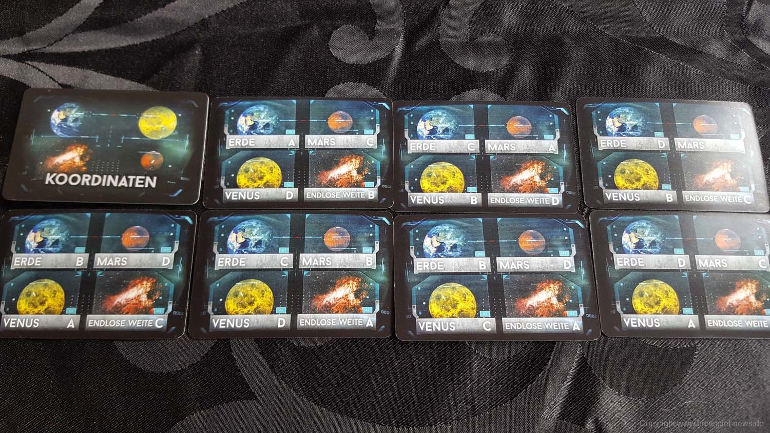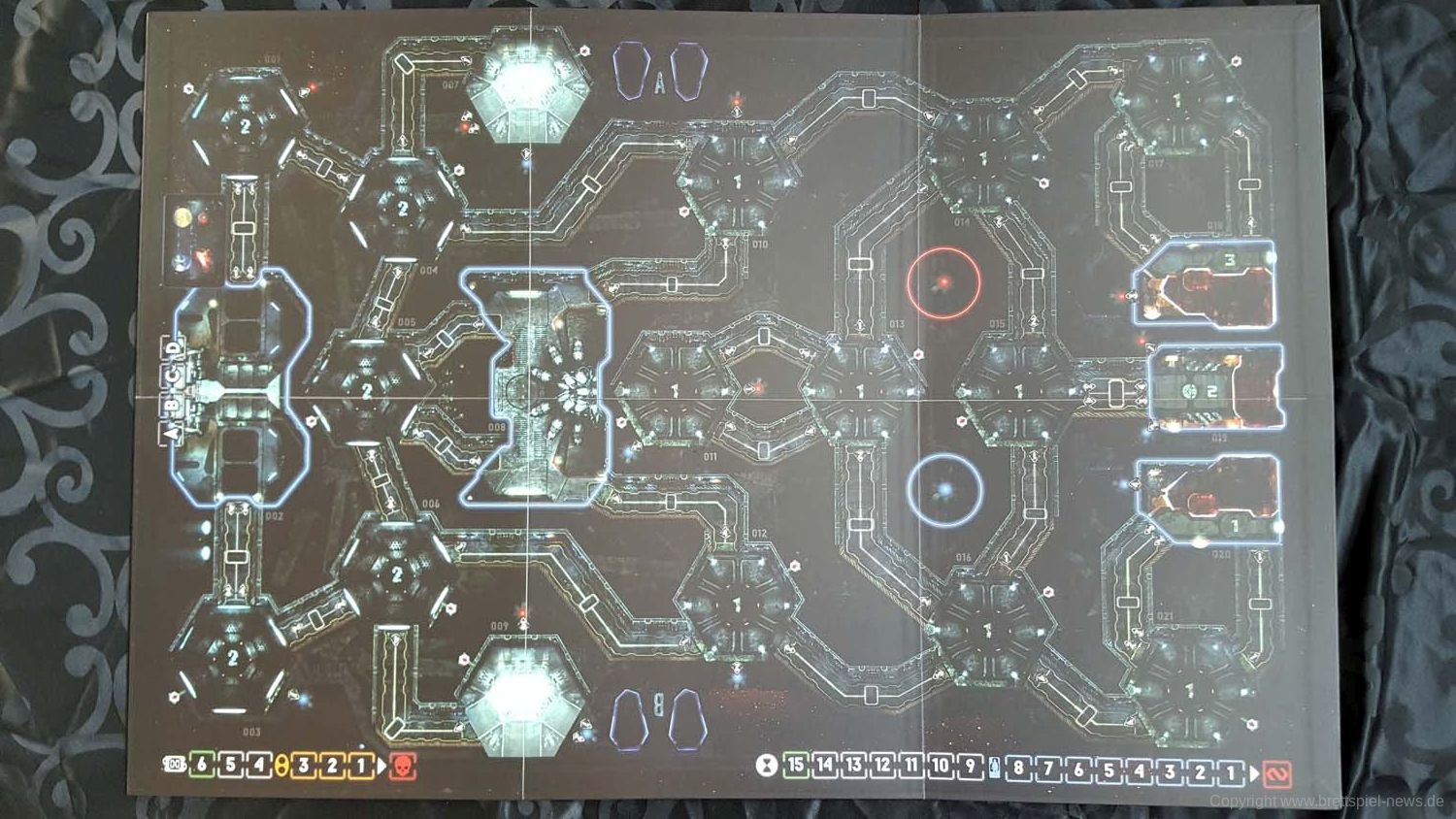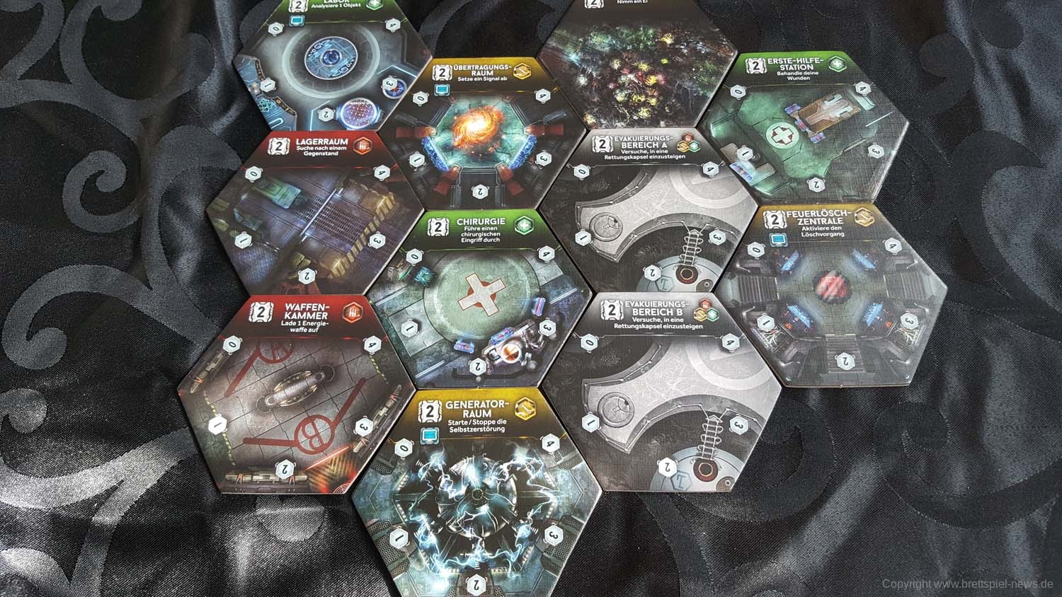 Der große Spielplan in der Mitte zeigt das Raumschiff mit all seinen Räumen, auf die zuvor zufällig verdeckte Raumplättchen gelegt werden, die es zu erkunden gilt. Die Spieler leiden ja unter vorübergehender Amnesie! Auf jedes Raumplättchen wird noch ein Erkundungsplättchen gelegt, welches beim Betreten des Raumes angibt, ob der Raum in Flammen steht, defekt ist, ob die Tür hinter einem zufällt etc., aber vor allem, wie viele Gegenstände in dem Raum zu finden sind. Im vorderen Bereich des Raumschiffs befindet sich das Cockpit, in dem das Reiseziel des Raumschiffs verändert werden kann und im hinteren Bereich befinden sich drei Räume, die zu den Treibwerken führen, welche entweder intakt oder beschädigt sein können. Diese Räume sind von Anfang an sichtbar zusammen mit dem Kryonatorium, in dem alle Spieler starten.