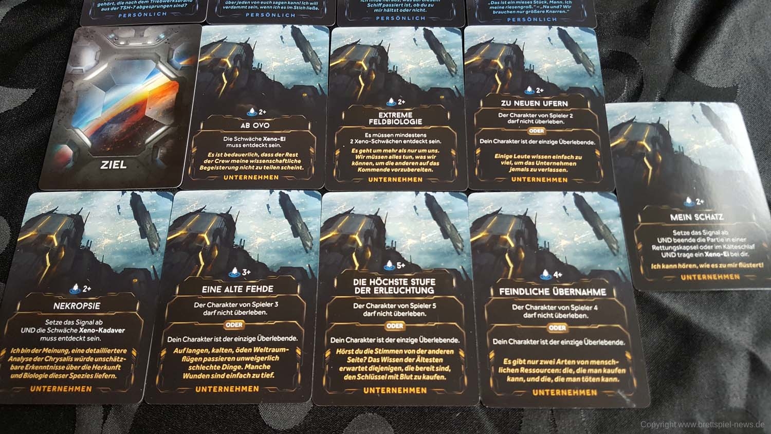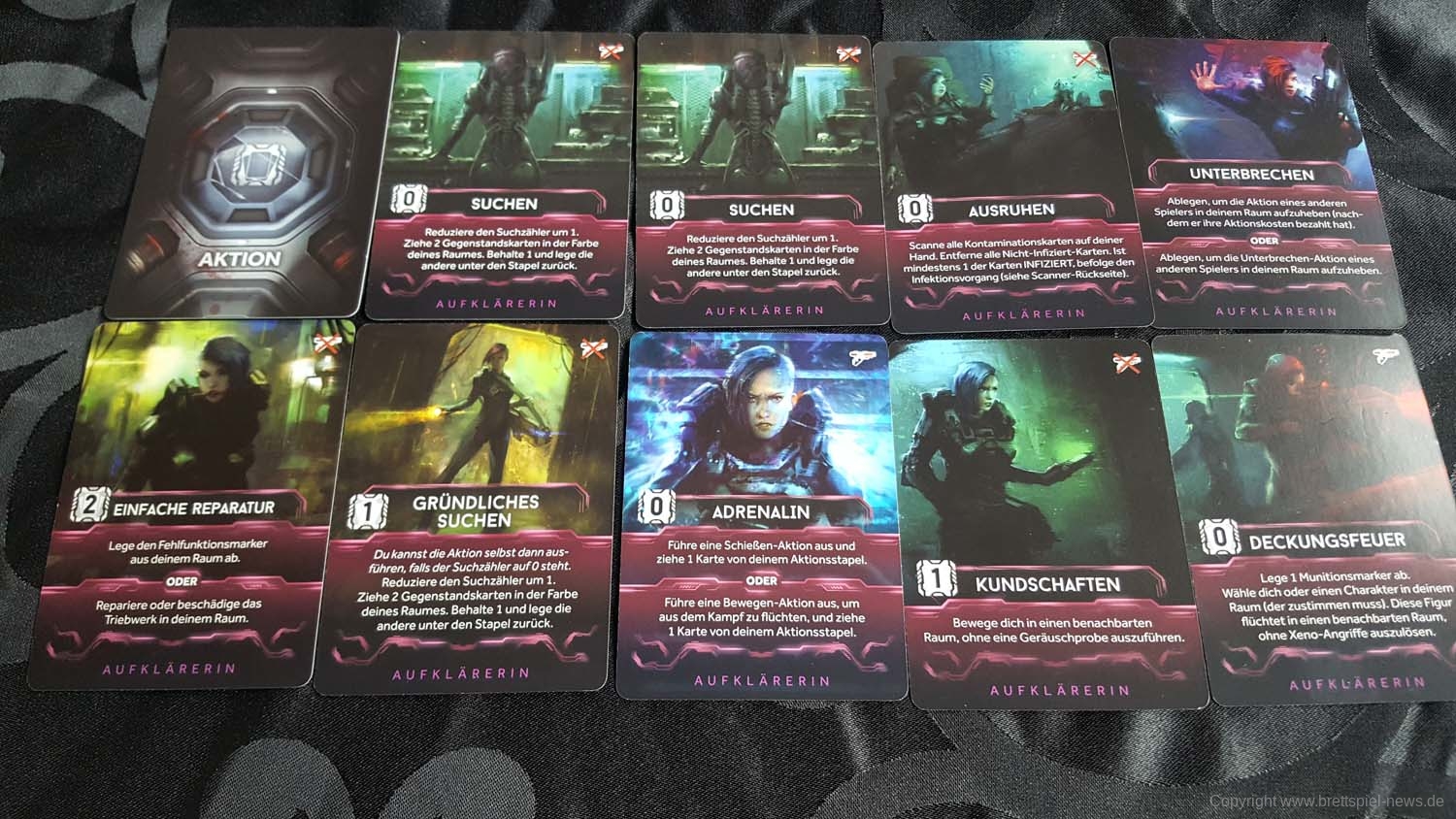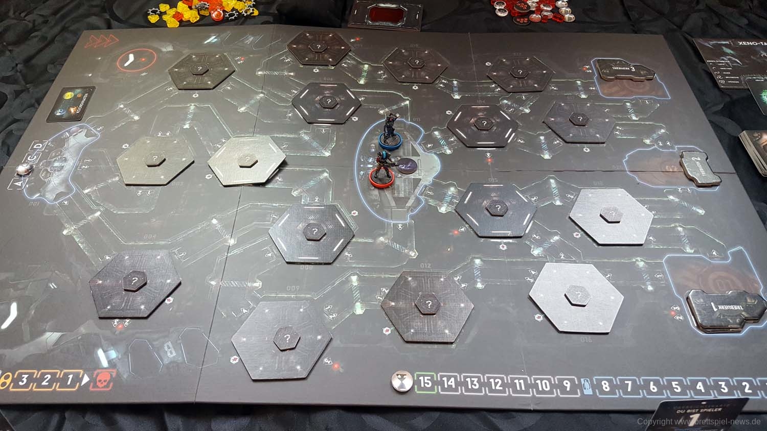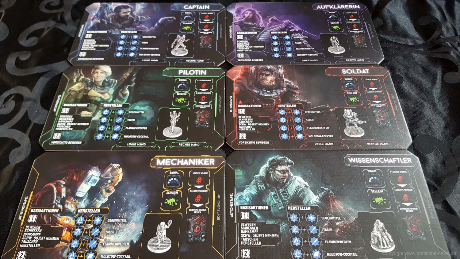 Als wenn das nicht schon genug wäre, breiten sich die Xenos danach aus. Aus dem Beutel mit den Xenoplättchen wird eins gezogen und je nach Art ein bestimmter Effekt abgehandelt. Ist diese Phase beendet, ziehen alle Spieler wieder auf fünf Handkarten auf und versuchen, weiter zu entkommen. Sind alle Charaktere tot oder alle entkommen oder eine Mischung aus beidem, endet das Spiel und es wird geschaut, ob die überlebenden Spieler es geschafft haben, ihre Ziele zu erfüllen. Es kann passieren, dass es mehrere Gewinner gibt, oft gibt es aber auch gar keinen.