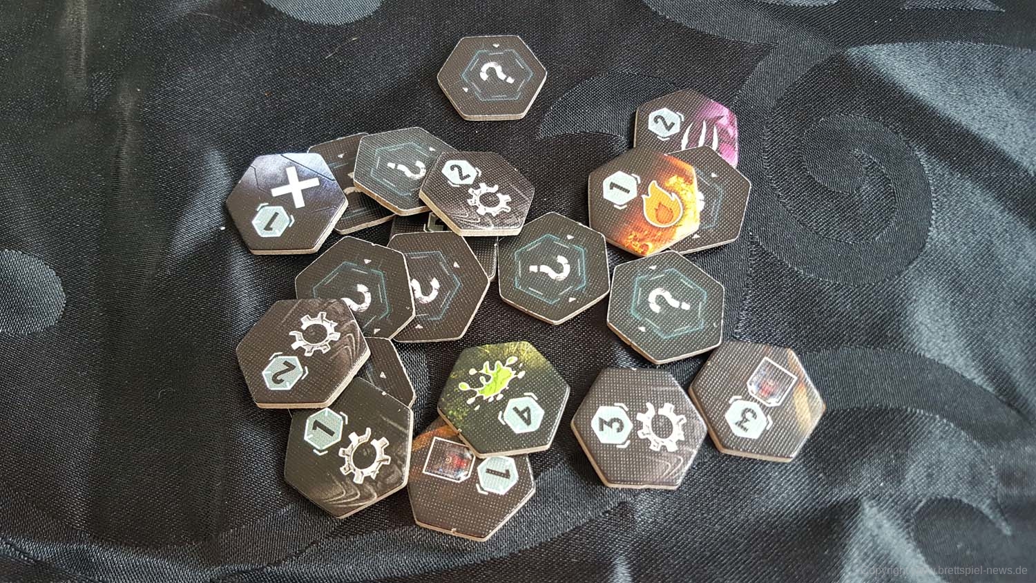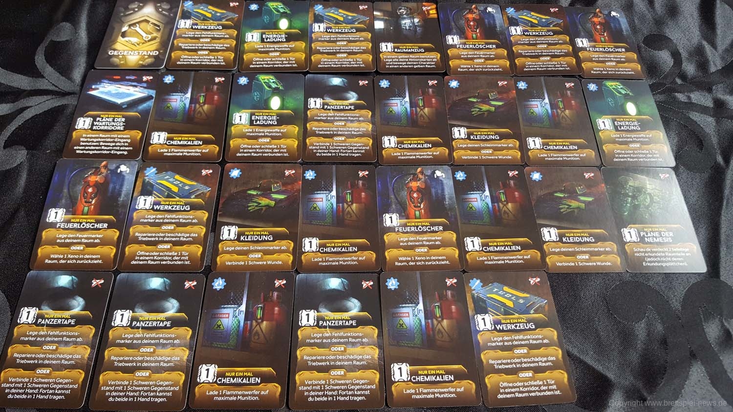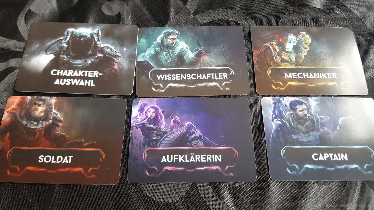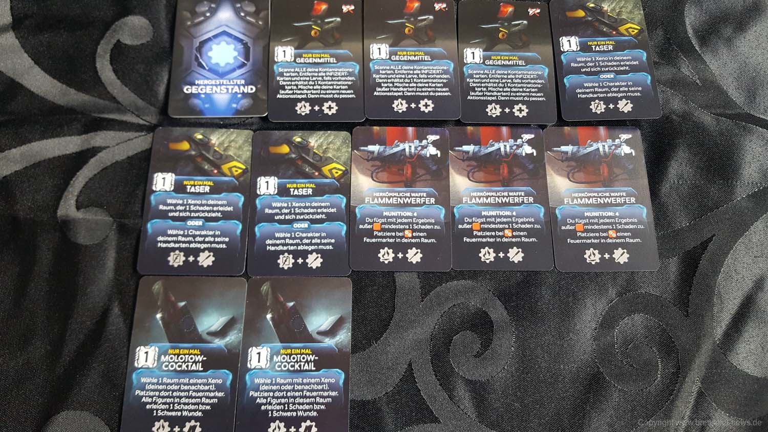 Als wenn das nicht schon genug wäre, breiten sich die Xenos danach aus. Aus dem Beutel mit den Xenoplättchen wird eins gezogen und je nach Art ein bestimmter Effekt abgehandelt. Ist diese Phase beendet, ziehen alle Spieler wieder auf fünf Handkarten auf und versuchen, weiter zu entkommen. Sind alle Charaktere tot oder alle entkommen oder eine Mischung aus beidem, endet das Spiel und es wird geschaut, ob die überlebenden Spieler es geschafft haben, ihre Ziele zu erfüllen. Es kann passieren, dass es mehrere Gewinner gibt, oft gibt es aber auch gar keinen.