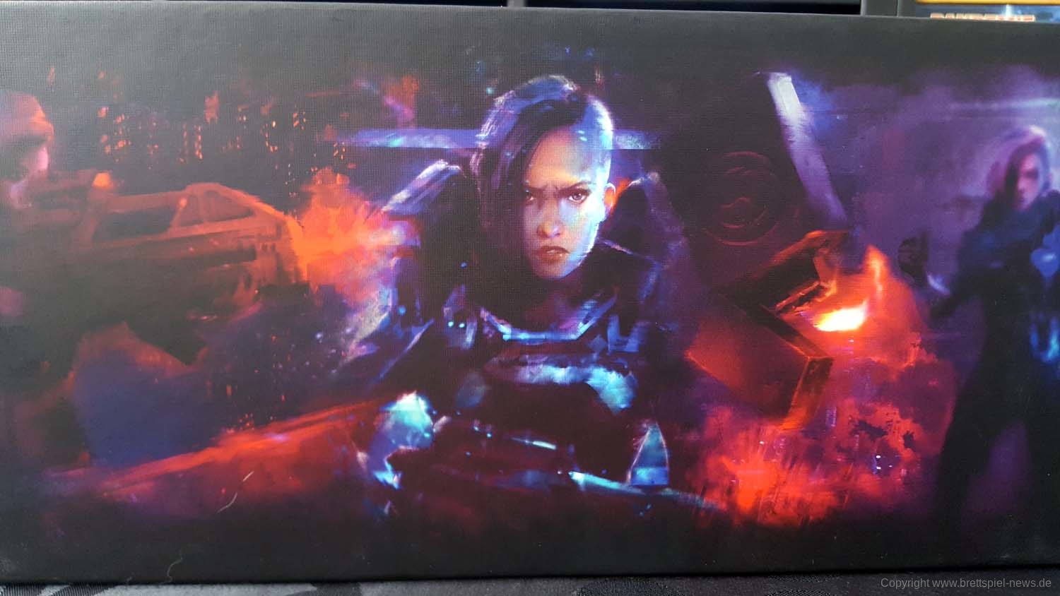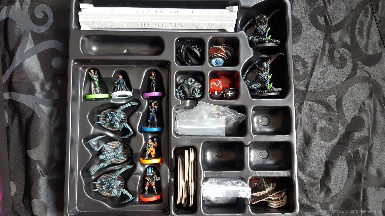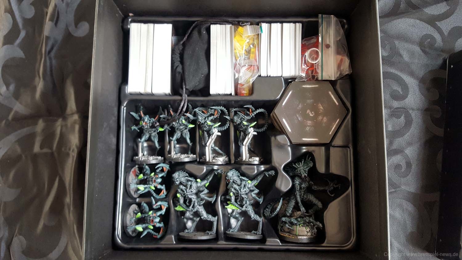 Alles gut verstaut in zwei Kunststoffinlays, in denen alles seinen Platz hat. Das Material dieses Spiels ist einfach klasse, aber bei diesem Preis darf auch einiges erwartet werden. Die Illustrationen sind alle hervorragend und unterstreichen die Atmosphäre. Die Miniaturen der Königin und der Brutbestien sind riesig, die Acrylmarker sehen wunderbar aus und die Idee mit den kleinen Glassteinchen als Marker funktioniert sehr gut. An der Materialqualität dürfte niemand etwas zu meckern haben.
