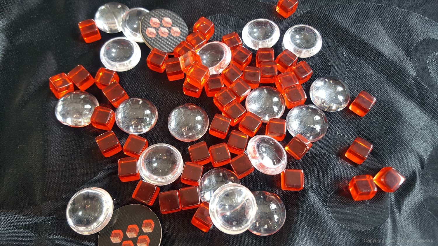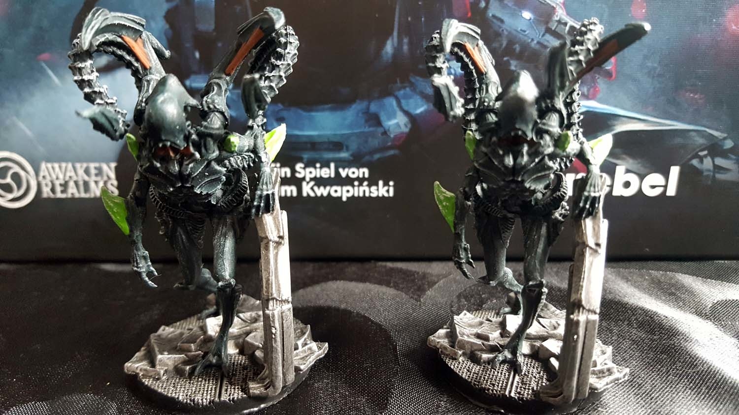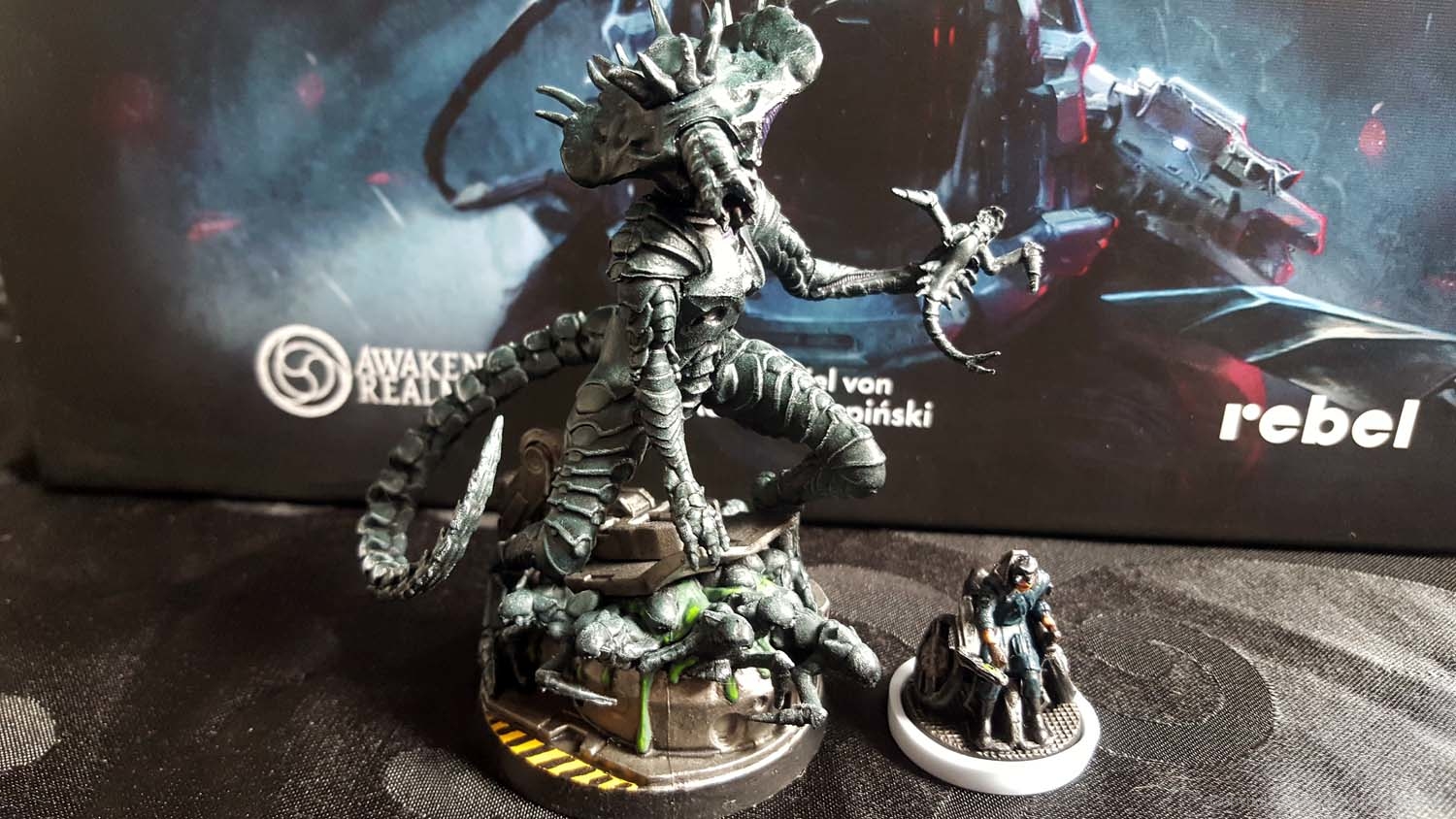 Alles gut verstaut in zwei Kunststoffinlays, in denen alles seinen Platz hat. Das Material dieses Spiels ist einfach klasse, aber bei diesem Preis darf auch einiges erwartet werden. Die Illustrationen sind alle hervorragend und unterstreichen die Atmosphäre. Die Miniaturen der Königin und der Brutbestien sind riesig, die Acrylmarker sehen wunderbar aus und die Idee mit den kleinen Glassteinchen als Marker funktioniert sehr gut. An der Materialqualität dürfte niemand etwas zu meckern haben.