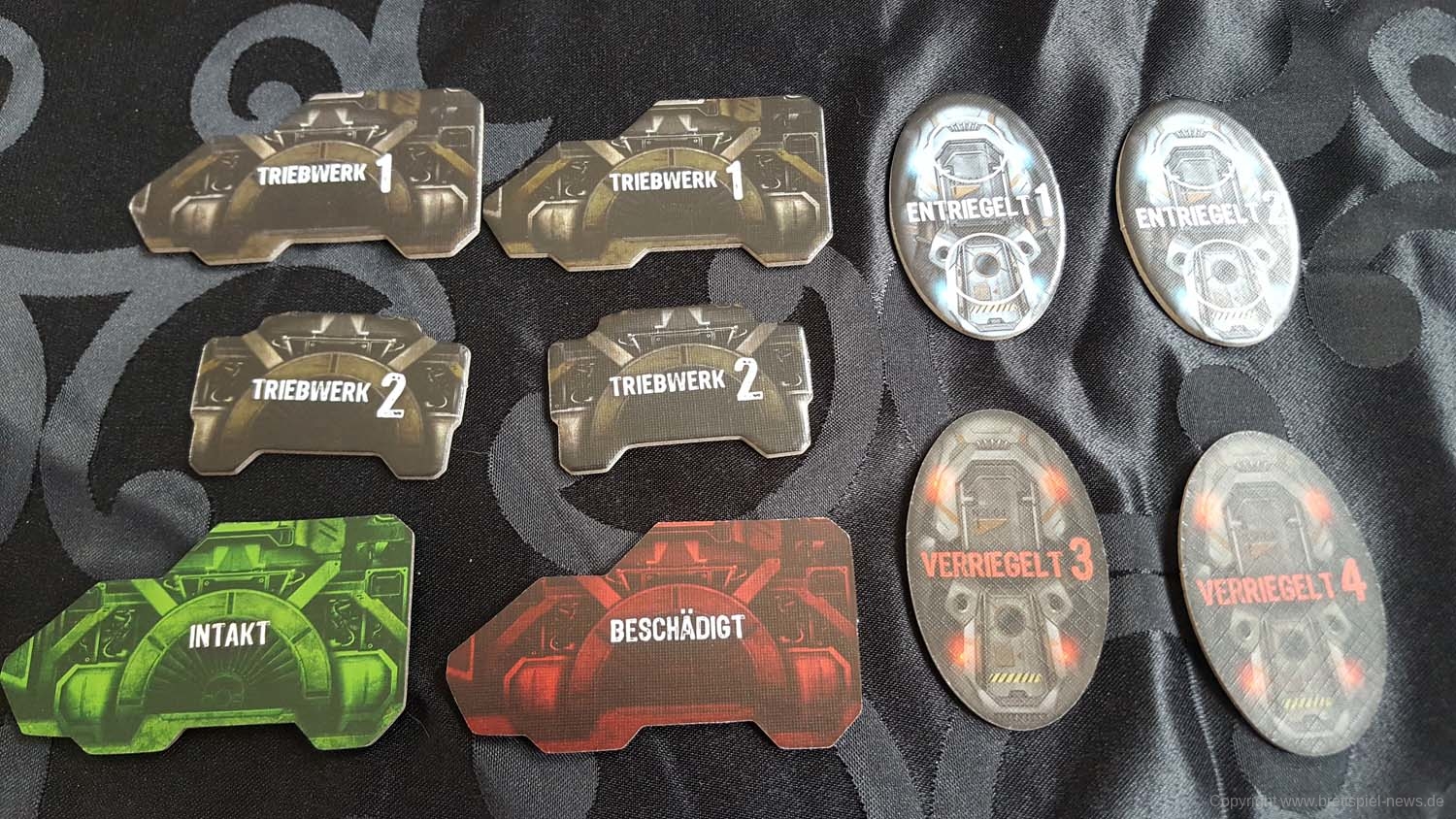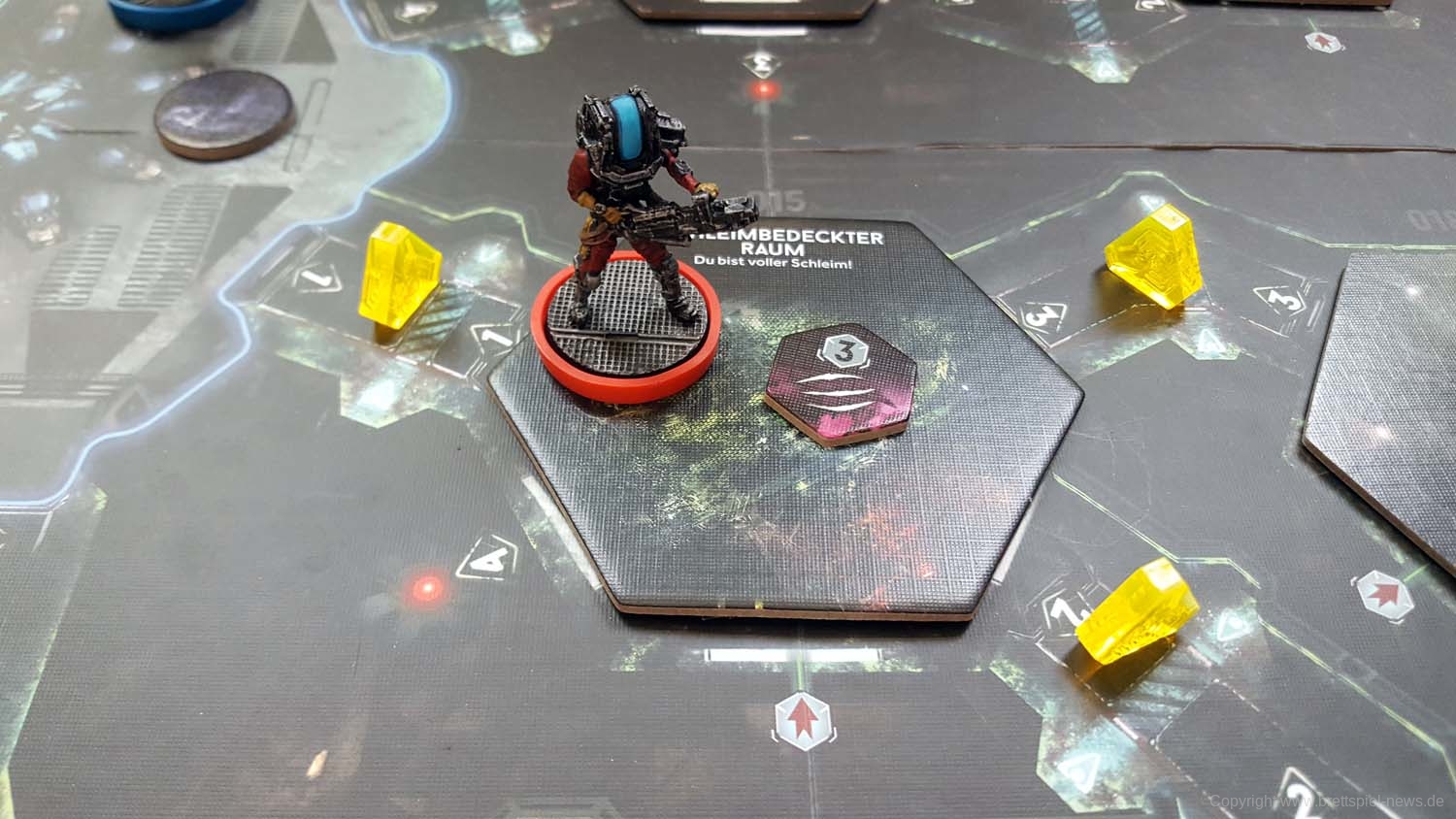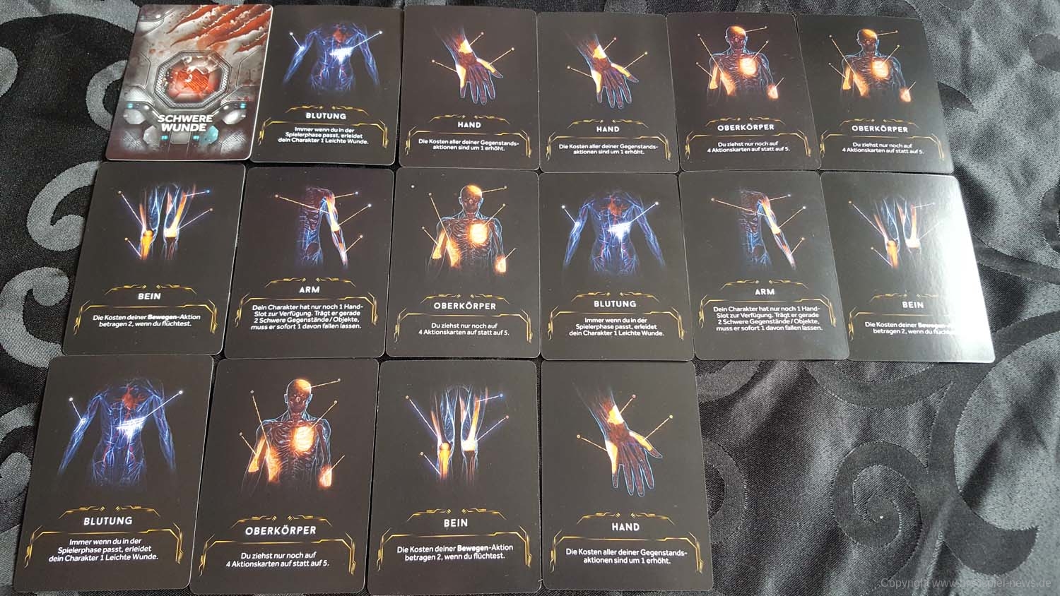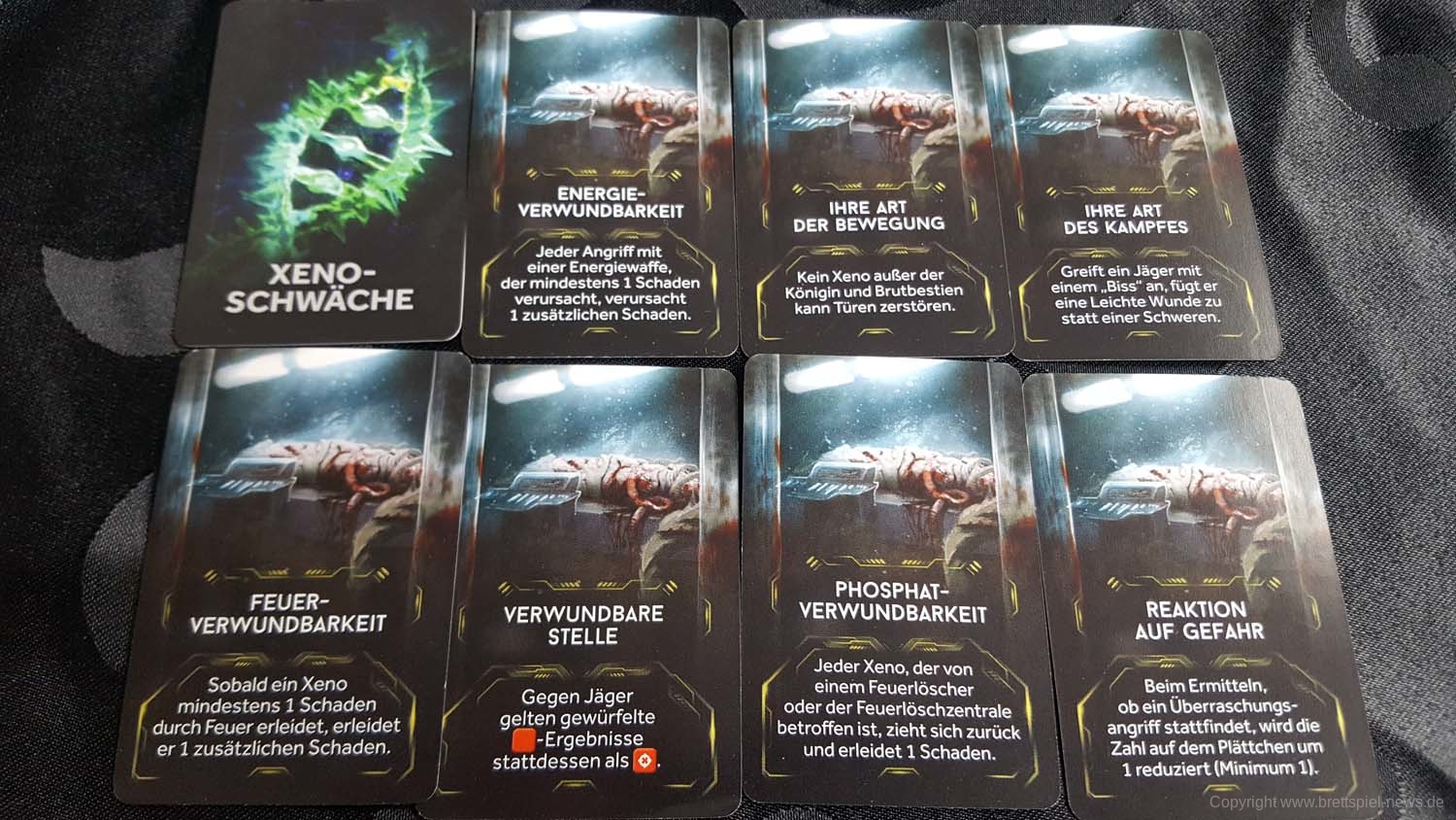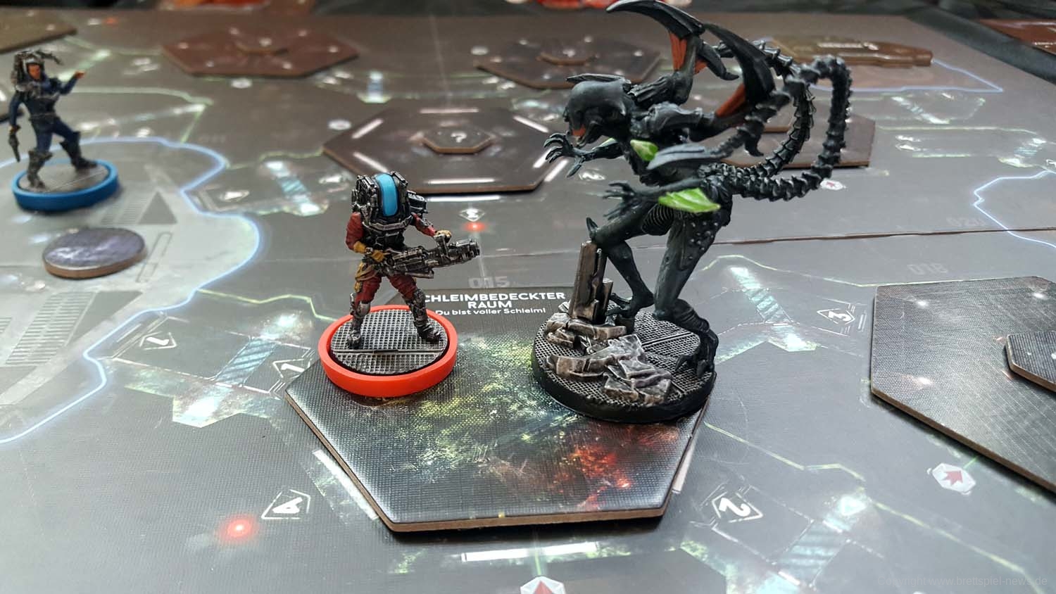In diesem Fall wird ein Xenoplättchen blind aus einem Beutel gezogen. Dieses gibt vor, welches Alien erscheint. Dies können kleine Larven, Kriecher, Jäger, Brutbestien oder die Königin sein. Am häufigsten erscheinen die Jäger. Scheinbar adulte Xenos, die einen raschen Tod bedeuten können. Auf der Rückseite des gezogenen Xenoplättchens steht eine Zahl, welche einen Überraschungsangriff auslöst, sollte der Spieler weniger Handkarten besitzen, als die Zahl angibt. Bei einem Angriff wird eine Karte vom Xenokartenstapel gezogen und geschaut, ob das Symbol des angreifenden Xenos auf der Karte ist. Sollte das Xenosymbol nicht auf der Karte sein, schlägt der Angriff fehl. Gerade noch einmal Glück gehabt. Sollte dies aber der Fall sein, gibt die Karte vor, wie viel Schaden es einzustecken gilt. Schaden teilt sich auf in leichte und schwere Wunden. Zu viele leichte Wunden werden zu einer schweren Wunde, welche diverse Mali verursachen kann. Sollte ein Spieler die dritte schwere Wunde erleiden und dann noch irgendwie Schaden bekommen, scheidet er aus dem Spiel aus. Die Spielfigur wird durch einen Leichenmarker ersetzt.