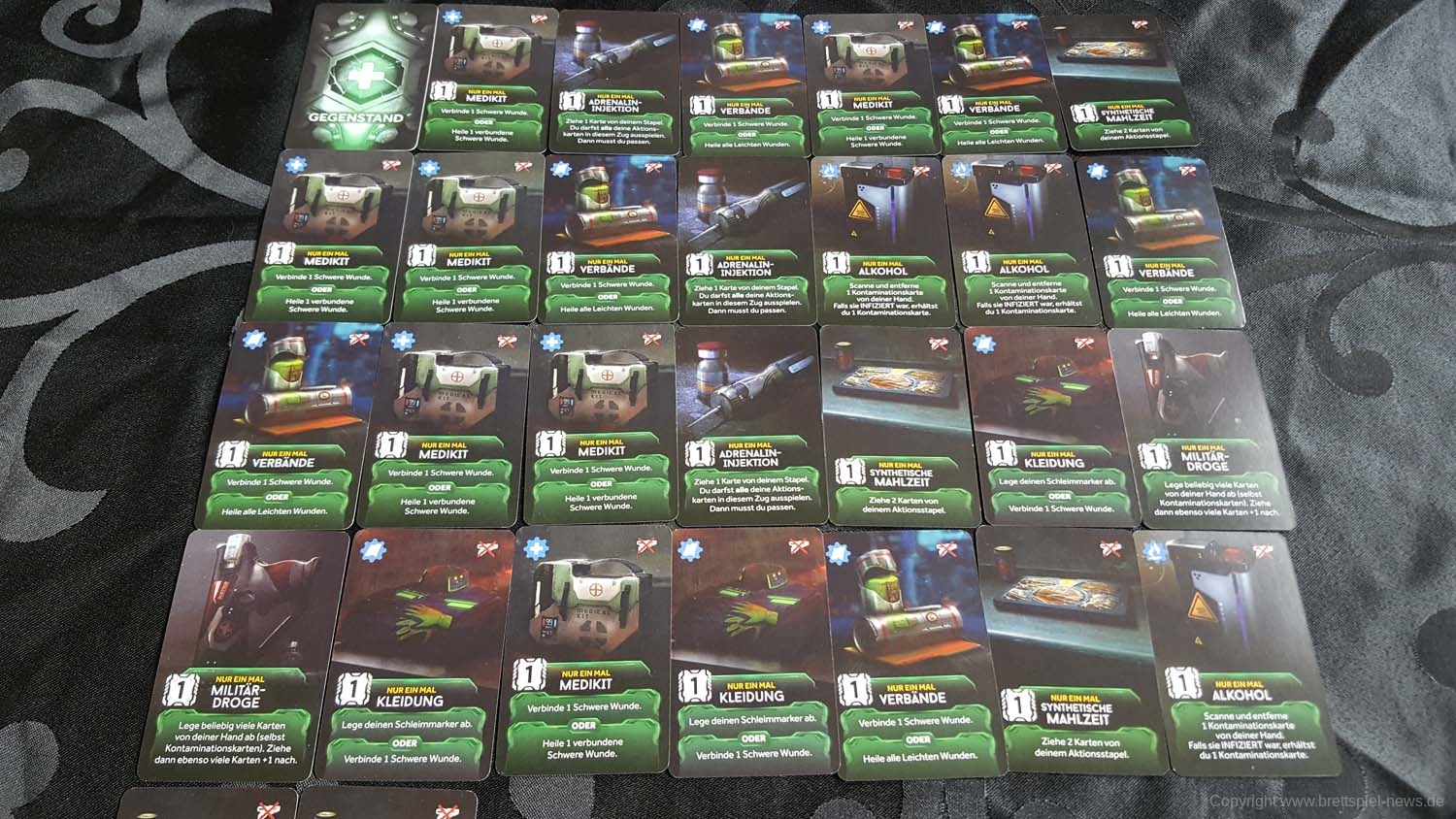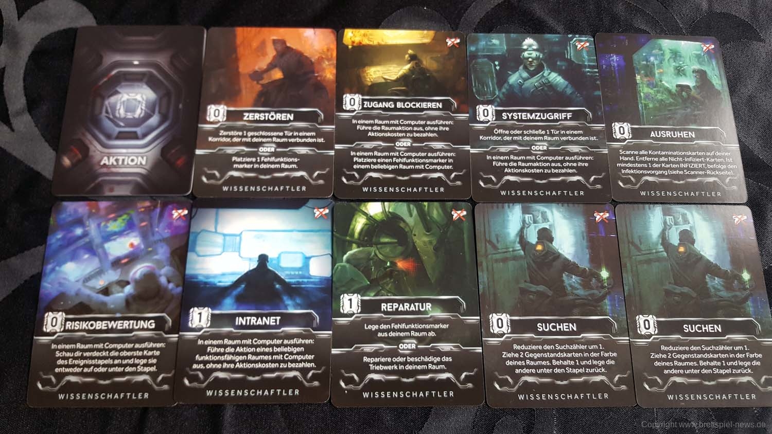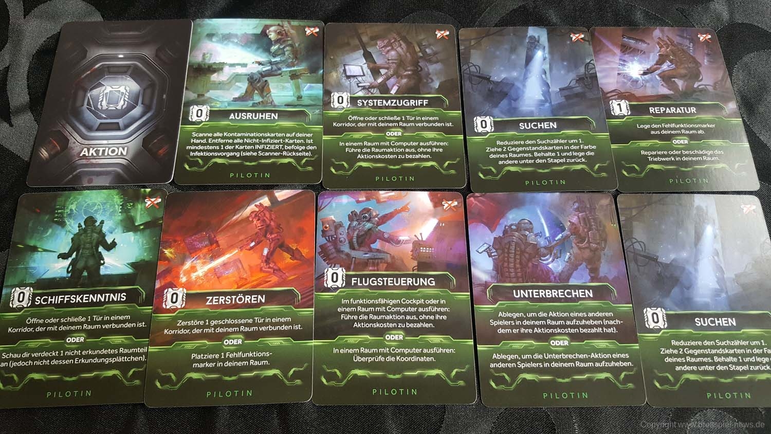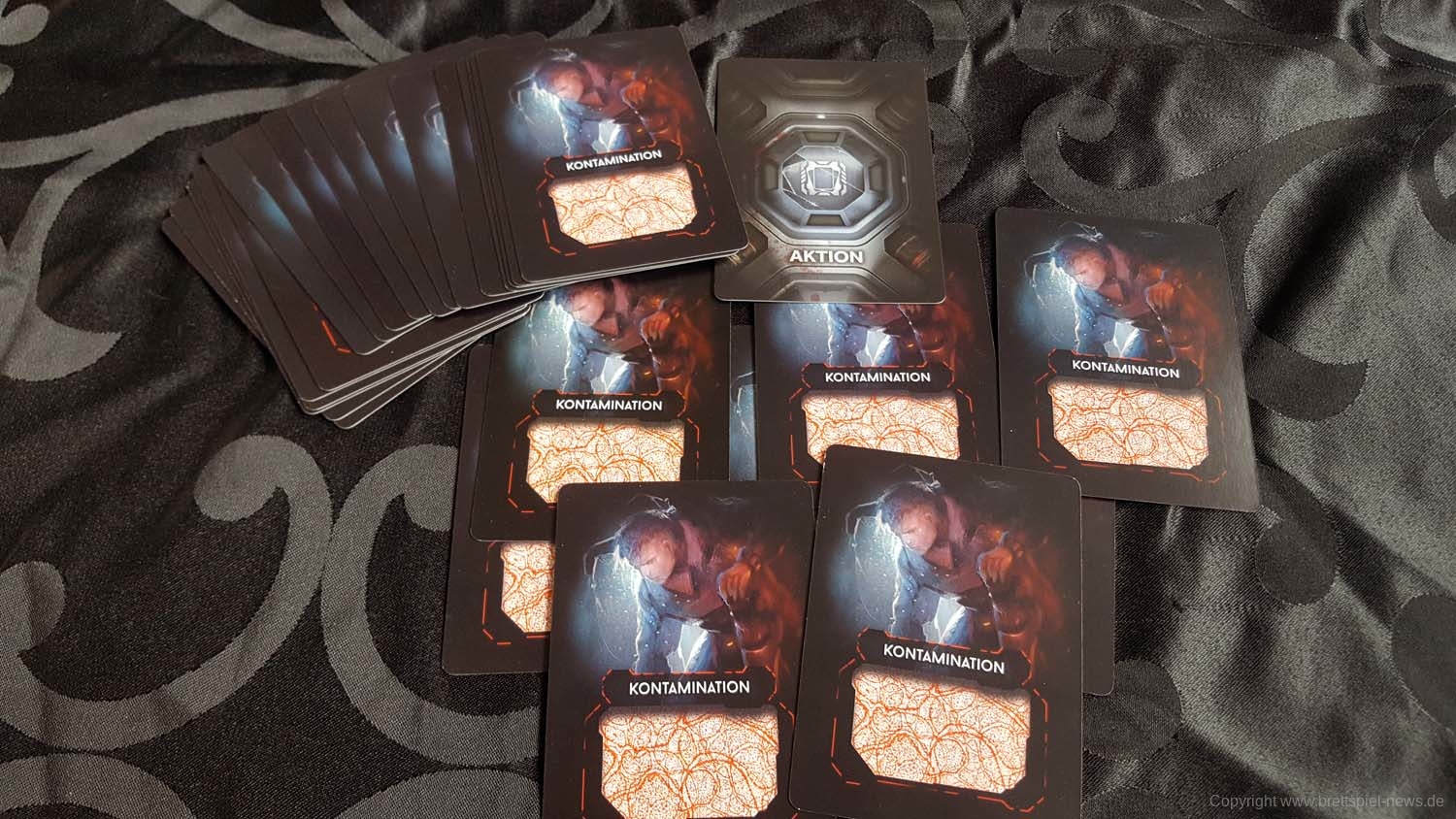 Sollte es jemand tatsächlich geschafft haben, die richtigen Koordinaten für seine Mission einzustellen, die Triebwerke intakt zu halten, den Spieler auszuschalten, den die Zielkarte vorgibt, alle Xenos im Weg besiegt zu haben, oder dafür gesorgt haben, dass das Schiff weder explodiert noch kaputt geht, und dann auch noch halbtot eine Rettungskapsel betreten haben, heißt das noch nicht, dass das Spiel gewonnen ist. Hat ein Spieler diesen Punkt erreicht, wird sein Deck gemischt und vier Karten aufgedeckt. Sollte unter diesen vier Karten eine Kontaminationskarte sein, unabhängig davon, ob diese das Wort „infiziert“ trägt oder nicht, verliert dieser Spieler das Spiel. Na danke!