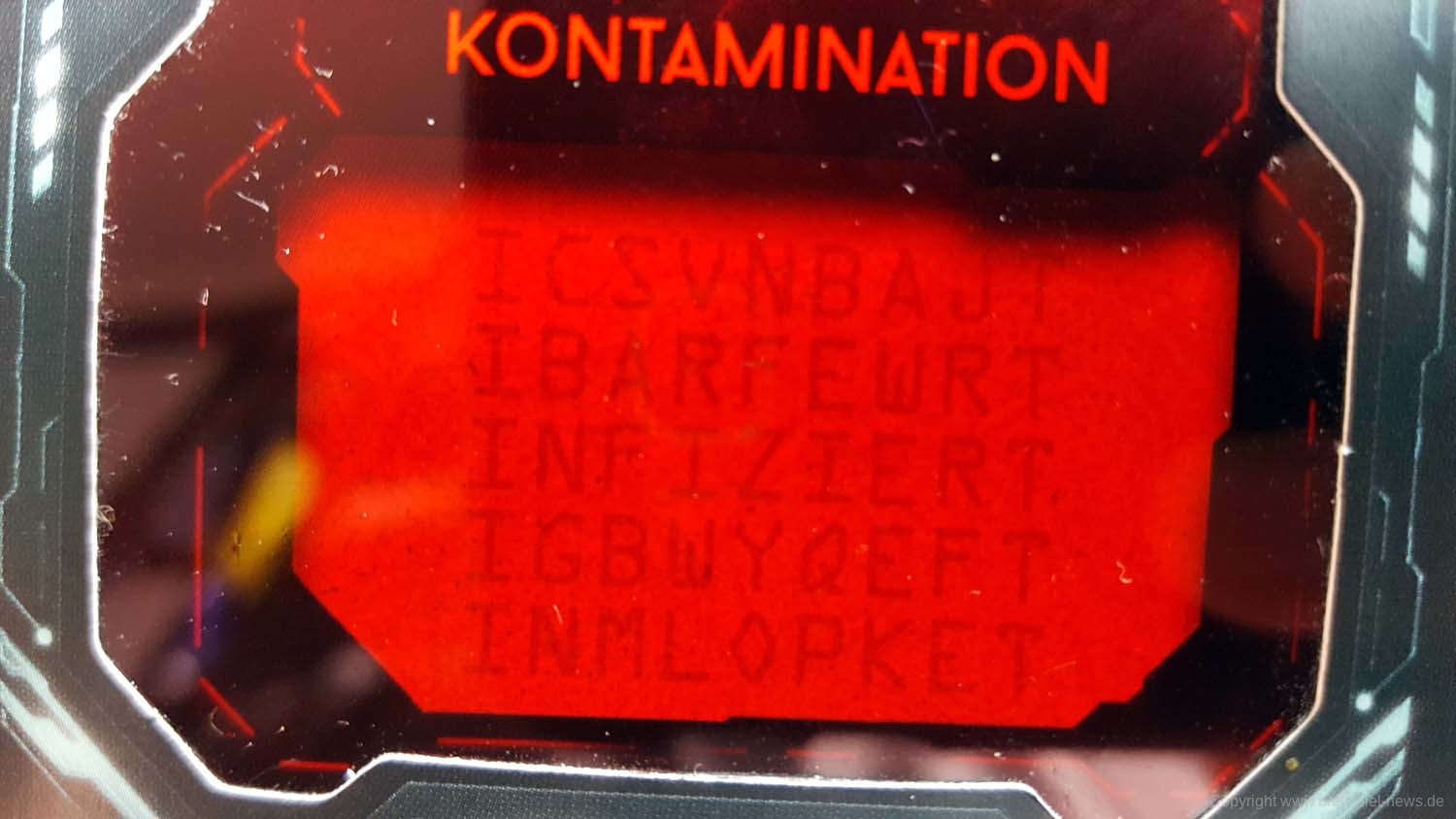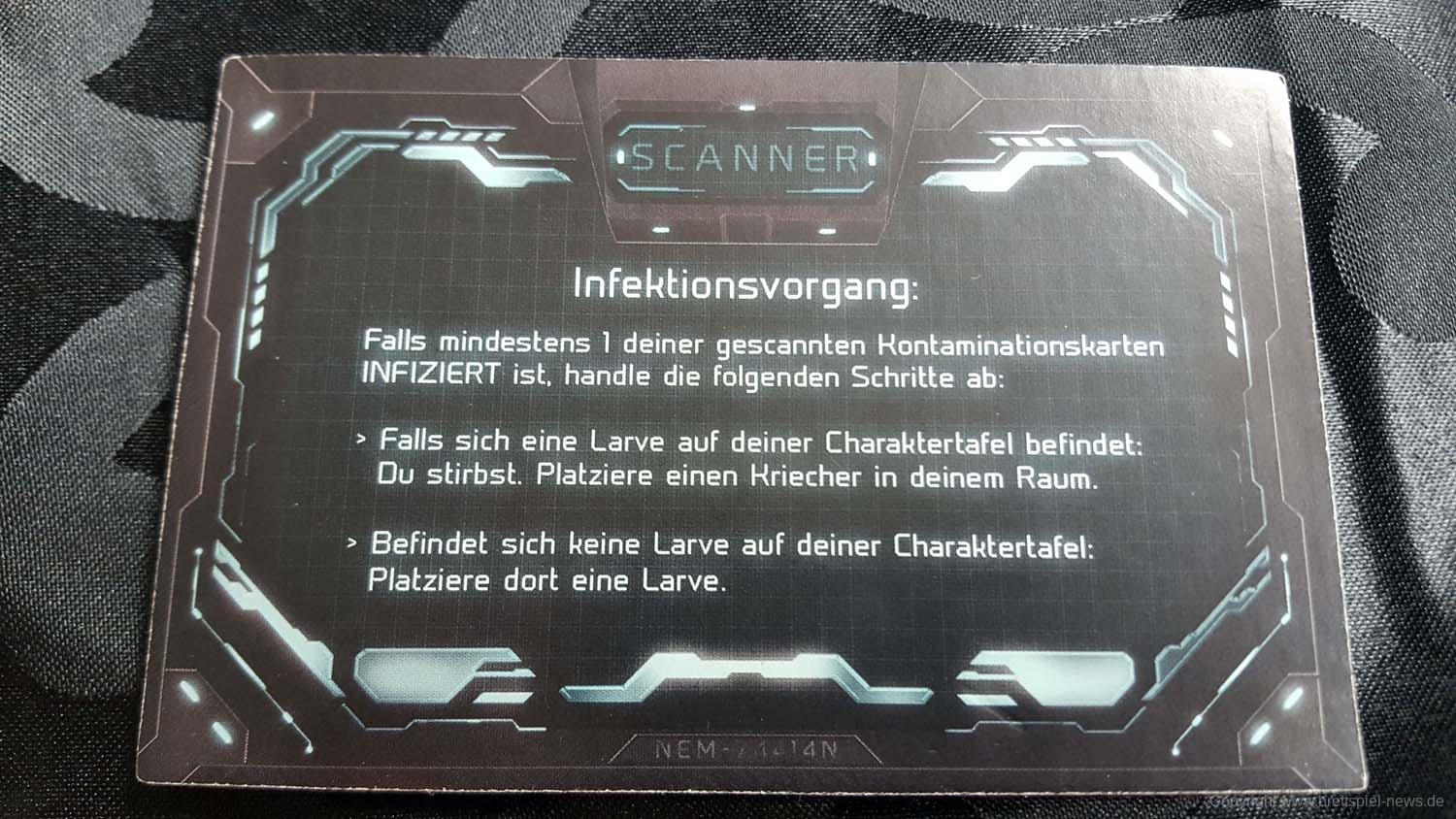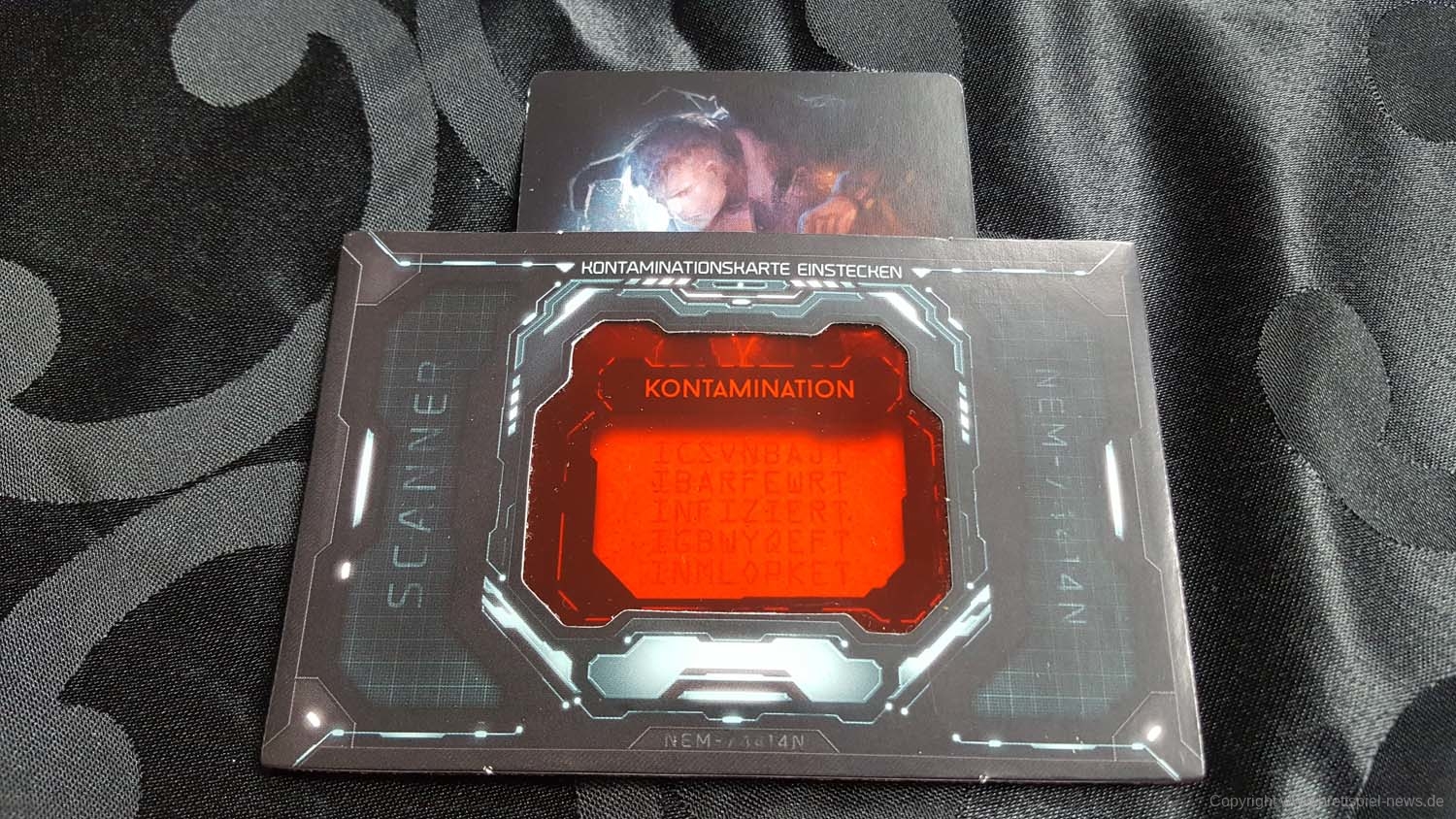 Ist das Ziel nicht die Erde, sterben alle. Im Laufe des Spiels kommt es vor, dass die Spieler immer einmal wieder Kontaminationskarten bekommen. Diese werden in das Deck gemischt, blockieren einen Handkartenslot und bedeuten vielleicht, dass der Spieler eine Alienlarve in seinem Körper trägt. Auf den Kontaminationskarten ist ein kleines Feld mit einem Buchstabensalat. Dieser ist aber erst einmal unlesbar, außer die Karte wird in den Scanner geschoben. Dieser ist eine Karte mit einer roten Folie, hinter welche die Kontaminationskarte geschoben wird, um den Buchstabensalat sichtbar werden zu lassen.