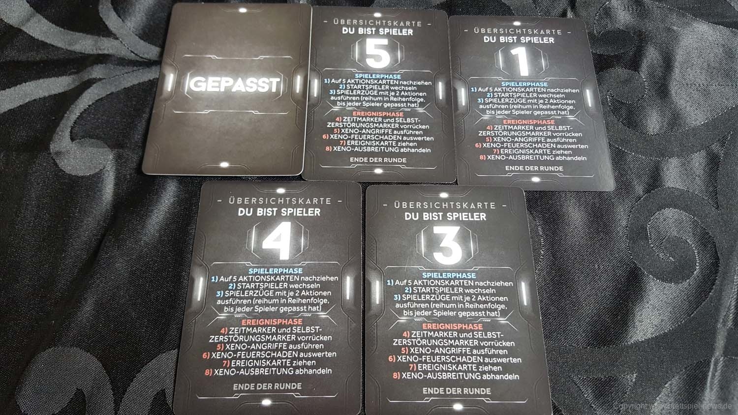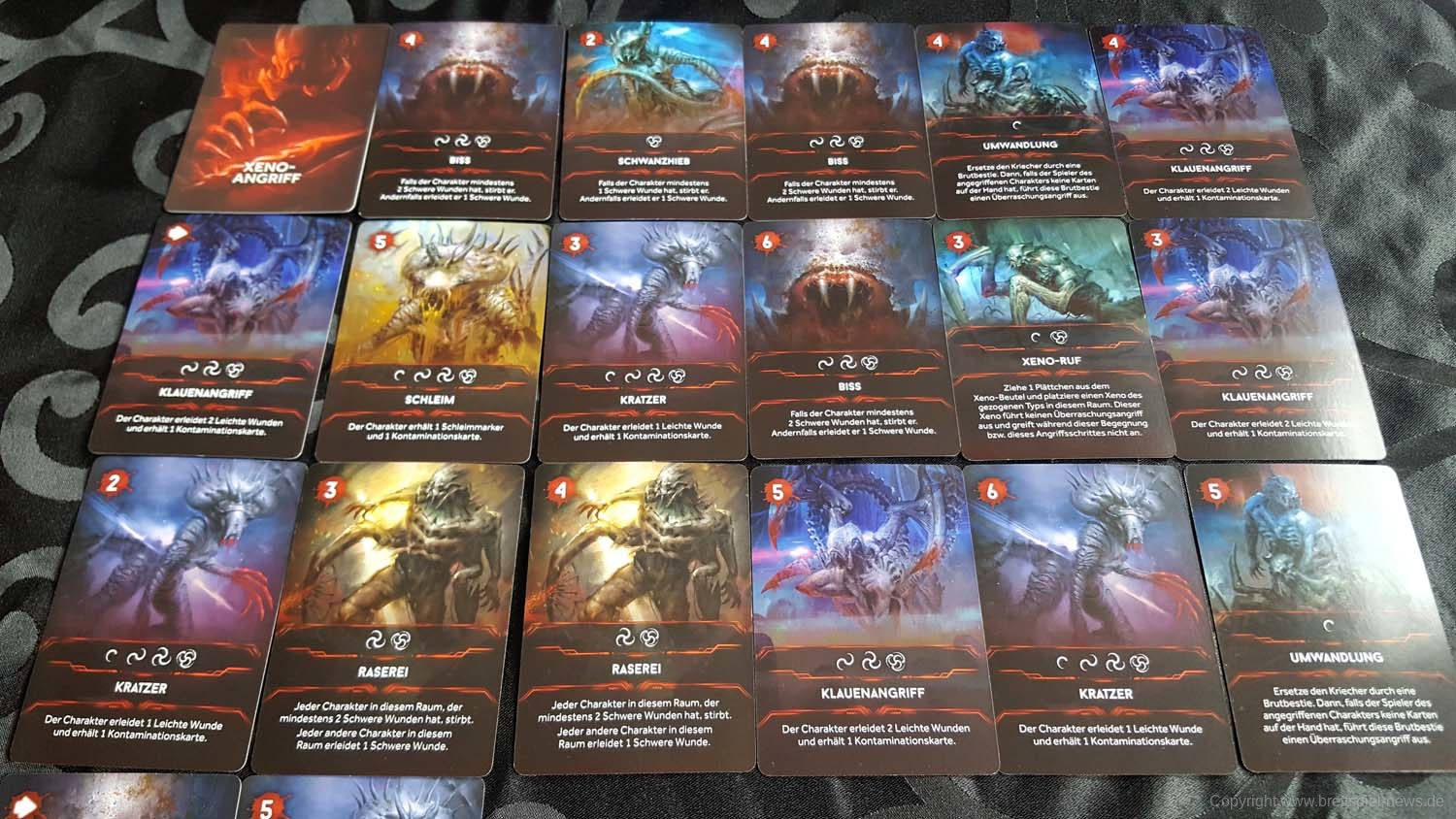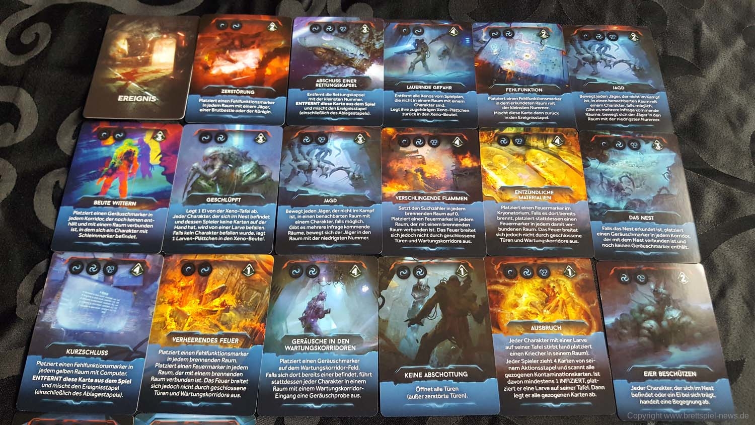 Nachdem alle gepasst haben, beginnt die Ereignisphase. Der Zeitmarker wird um eine Feld vorgesetzt und löst gegebenenfalls die Öffnung der Kryogenschlafkapseln oder das Spielende aus. Nachdem der Zeitmarker weitergerückt ist, wird ein Xenoangriff ausgeführt. Jeder Charakter, der sich in einem Raum mit einem Xeno befindet, wird nun angegriffen. Hierzu wird eine Xenokarte gezogen und abgehandelt. Xenos, die sich in brennenden Räumen aufhalten, bekommen zunächst Feuerschaden. Dann passiert das wichtigste in dieser Phase und eine Ereigniskarte wird gezogen. Diese gibt vor, welche Xenos sich in welche Richtung bewegen und natürlich ein Ereignis, das eintritt, wie etwa, dass sich alle Xenos regenerieren, dass Räume beschädigt werden, dass die Selbstzerstörungssequenz gestartet wird, dass alle Türen geöffnet werden und und und.