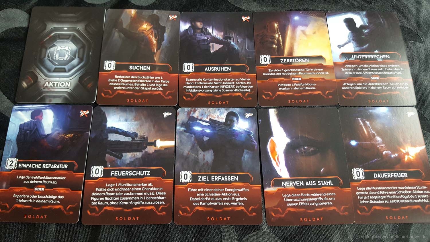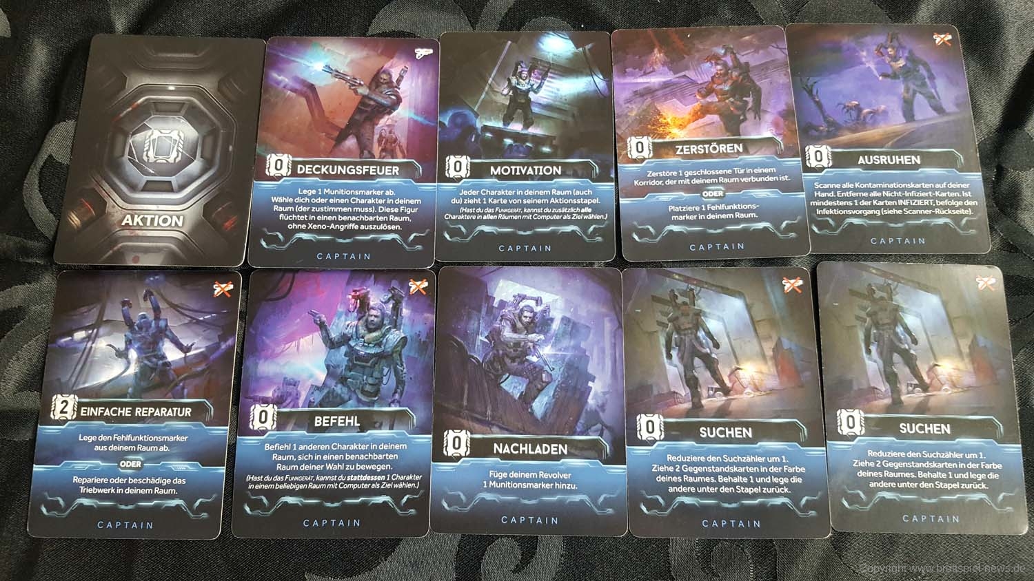 Wer am Zug ist, muss zwei Aktionen ausführen oder passen. Dabei gibt es die Basisaktionen, wie etwa Bewegen, Schießen, Nahkampf, Tauschen und solche Dinge, welche gegen das Abwerfen von Handkarten immer ausgeführt werden können, die Aktionen auf den Handkarten selbst oder die Raumaktion. Umso mehr Handkarten in Aktionen verpulvert werden, desto wahrscheinlicher ist es, bei einer Begegnung mit einem Xeno einem Überraschungsangriff zu erliegen. Wer keine Handkarten mehr hat oder keine zwei vollen Aktionen ausführen möchte, muss passen.