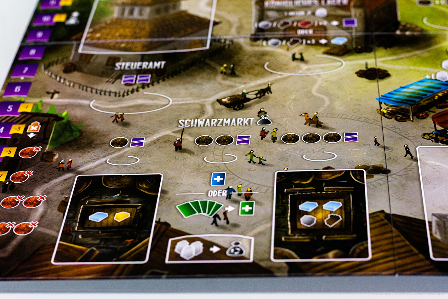 Ein Nachteile ist an dem speziellen Worker-Placement-System des Spiels aber dennoch zu finden. So interessant es auch sein mag, dass viele Figuren sich gegenseitig unterstützen können, so unübersichtlich wird das Spielfeld aber bei großen Spielerzahlen auch. Da jeder Spieler seine Arbeiter auf die gleichen Flächen (bis auf den Schwarzmarkt, da hier immer nur eine Figur pro Fläche platziert werden darf) legen darf, ist das Spielfeld schnell ein großes Gewusel an Farben.