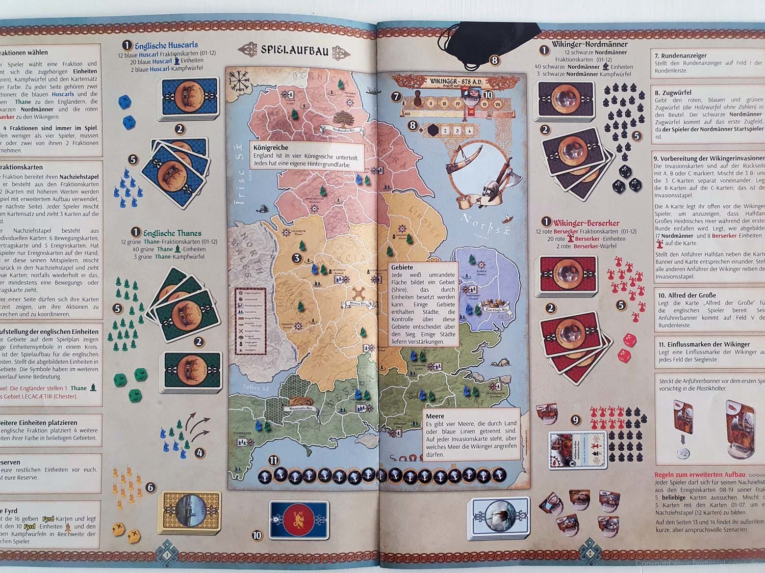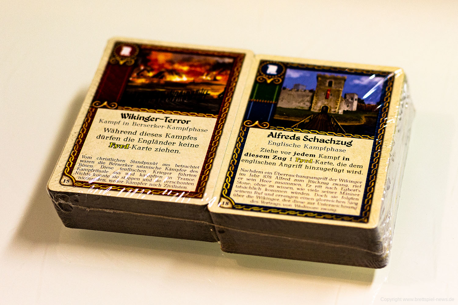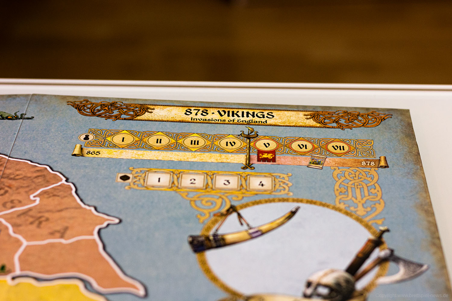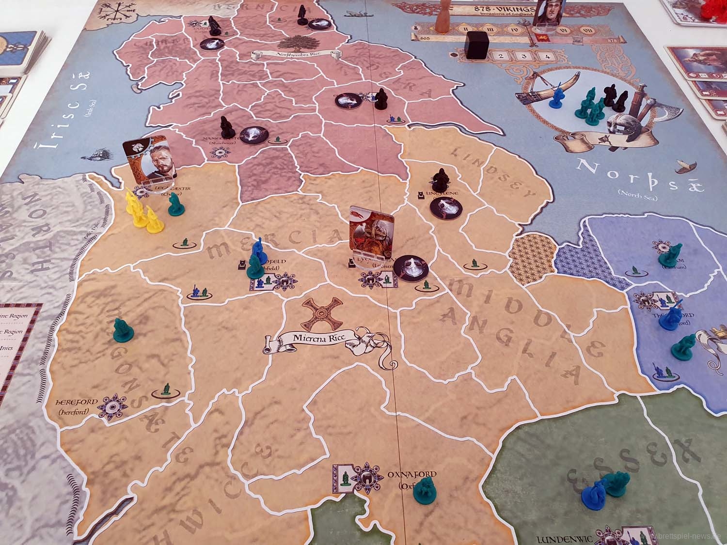 Nichtsdestotrotz sind mir bei meinen Testpartien einige Probleme aufgefallen. Allen voran wäre da die nicht wegzusprechende Glückslastigkeit des Spiels zu nennen. Vom Ziehen der Eventkarten bis zum Werfen der Würfel ist annähernd alles abhängig vom Zufall, was ziemlich frustrierend sein kann. Hinzu kommt, dass sowohl die Eventkarten der Engländer als auch die Würfel erheblich schwächer ausfallen, als die der Wikinger, wodurch die Engländer fast keinen Angriff gewinnen. Da hilft auch kein Alfred der Große mehr, welcher nur eine Handvoll Huscarls und Thanes in die Schlacht führt. Ein weiteres Problem bietet die Bewegung der Armeen und ihrer Anführer, welche schlichtweg nicht intuitiv genug ist.