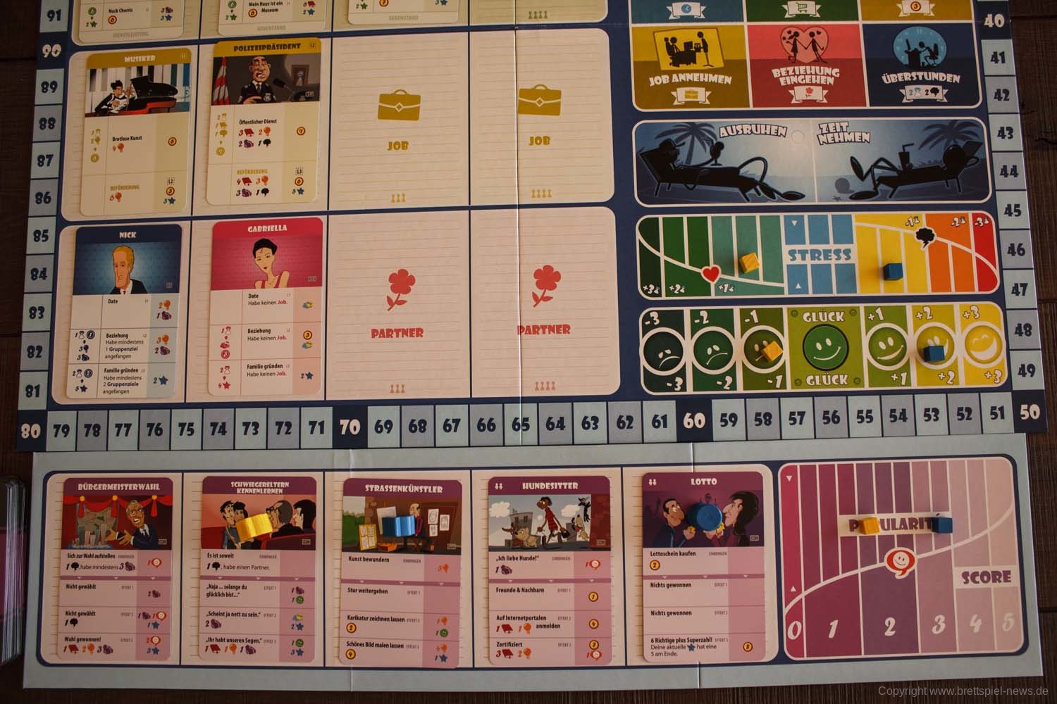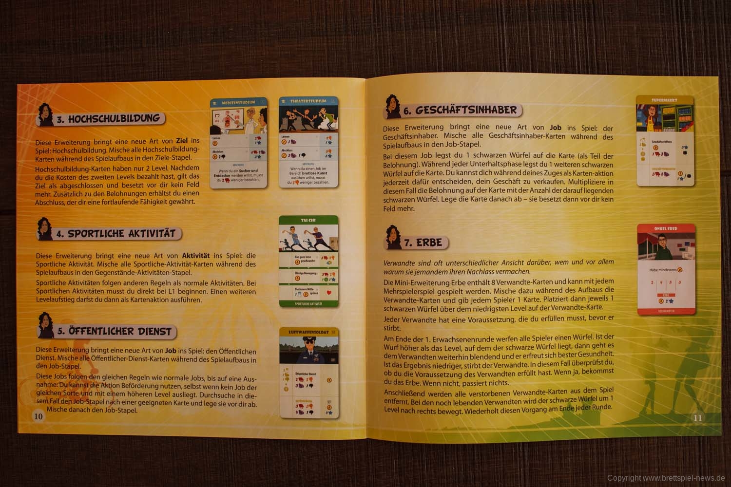 Die KINDER bringen für Paare weitere Möglichkeiten, Siegpunkte zu generieren, sorgen allerdings auch für zusätzliche Kosten pro Runde. Passend dazu gibt es für die Partnersuche noch ALLEINERZIEHENDE ELTERN, die neben dem Wunschpartner auch noch das passende Kind mitbringen. Neu sind auch die GEMEINSAMEN GEGENSTÄNDE, die ähnlich wie die Gruppenziele abgehandelt werden. Neu bei den SPORTLICHEN AKTIVITÄTEN ist, dass diese der Reihe nach durchgeführt werden müssen, Schritt für Schritt. Wer sich für eine HOCHSCHULBILDUNG entscheidet, hat bei der späteren Berufswahl Vorteile, während der ÖFFENTLICHE DIENST Vorteile beim Aufstieg bietet. Aufsteigen geht als GESCHÄFTSINHABER nicht, dafür gibt es hier eine Möglichkeit, das Geschäft zu verkaufen und darüber Gewinn zu machen. Und zu guter Letzt bleibt dann noch die Möglichkeit, ein ERBE zu erhalten, wenn das Würfelglück zum Wert des zugelosten Verwandten passt.