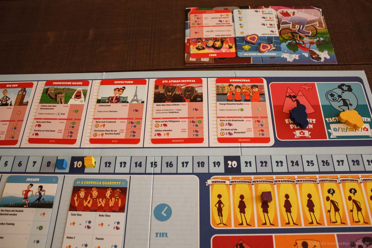 Bei der Erweiterung DIE WEITE WELT geht es, wie es der Titel schon vermuten lässt, raus aus dem (Klein-)Stadtmief in die Ferne. Für die Erlebniskarten gibt es ein eigenes Tableau mit 5 offen ausliegenden Karten. Zusätzlich gibt es hier Felder für das Planen eines Erlebnisses sowie für Tagträumereien. Jeder Spieler erhält darüber hinaus ein Tableau für seine Tagträumereien und einen Wolkenmarker, der für Erlebnisse und Tagträumereien verwendet werden kann. Wie die NACHBARSCHAFT-Erweiterung, kann auch DIE WEITE WELT erst ab der 1. Erwachsenenrunde genutzt werden.