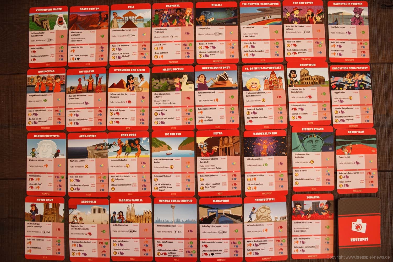 Wer ein Erlebnis plant, muss zunächst überprüfen, ob die auf der Karte angezeigten Bedingungen erfüllt sind und ob die evtl. anfallenden Kosten auch direkt gezahlt werden können. Zum Spielen wird die gewünschte Karte von dem Tableau genommen und vor dem Spieler abgelegt. In jedem folgenden Zug kann eine der Erlebnis-Aktionen auf den vor dem Spieler ausliegenden Karten abgehandelt werden, entweder in der einfachen oder der verlängerten Variante. Dadurch wird das Erlebnis abgeschlossen. Ein Limit für Erlebniskarten gibt es nicht.