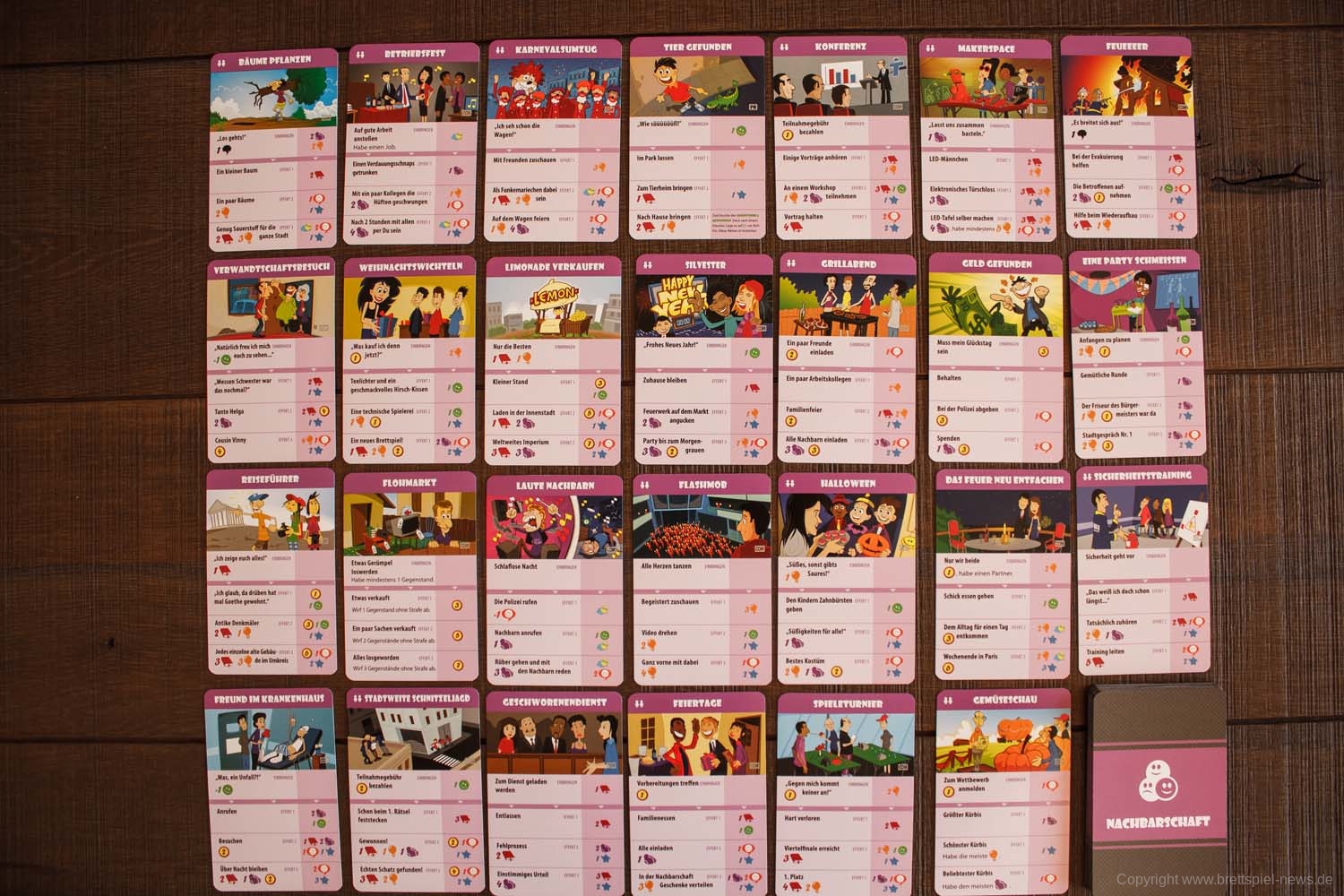 Mit NACHBARSCHAFT erhält das Grundspiel ein weiteres Spielbrett, über das Nachbarschaftsaktionen ausgeführt werden können. Verfügbar sind die Nachbarschaftskarten mit dem Start der 1. Erwachsenenrunde. Ab dann liegen jeweils 5 Nachbarschaftskarten aus, von denen einige auch als Gruppenaktion, also durch mehrere Spieler abgehandelt werden können. Die Ereignisse auf den Karten zeigen teilweise Bedingungen an, die erfüllt sein müssen, wenn sie ausgeführt werden sollen. Zudem sind teils Kosten zu entrichten, die ebenfalls direkt beim Platzieren gezahlt werden müssen. Ist dies nicht möglich, kann die Aktion auch nicht genutzt werden.