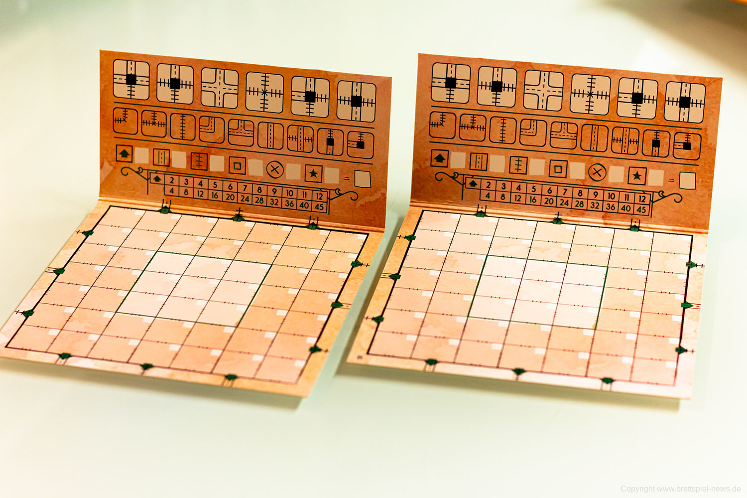 Neben der ganzen „Kritik“ habe ich aber auch etwas Positives über das Spiel zu berichten. Ich finde die Spielertableaus hervorragend. Sie sind aus sehr dickem, hochwertigem Material, lassen sich gut bemalen und wieder säubern und haben einen Sichtschirm. Die etwas hochgezogene Kante verhindert das Spicken und Abzeichnen von Mitspielern – sehr innovativ und nützlich!