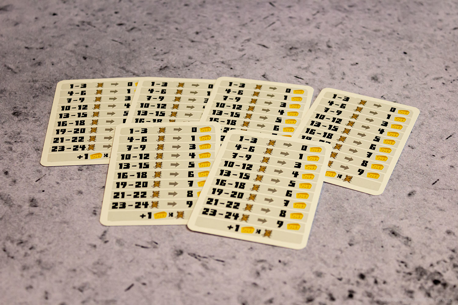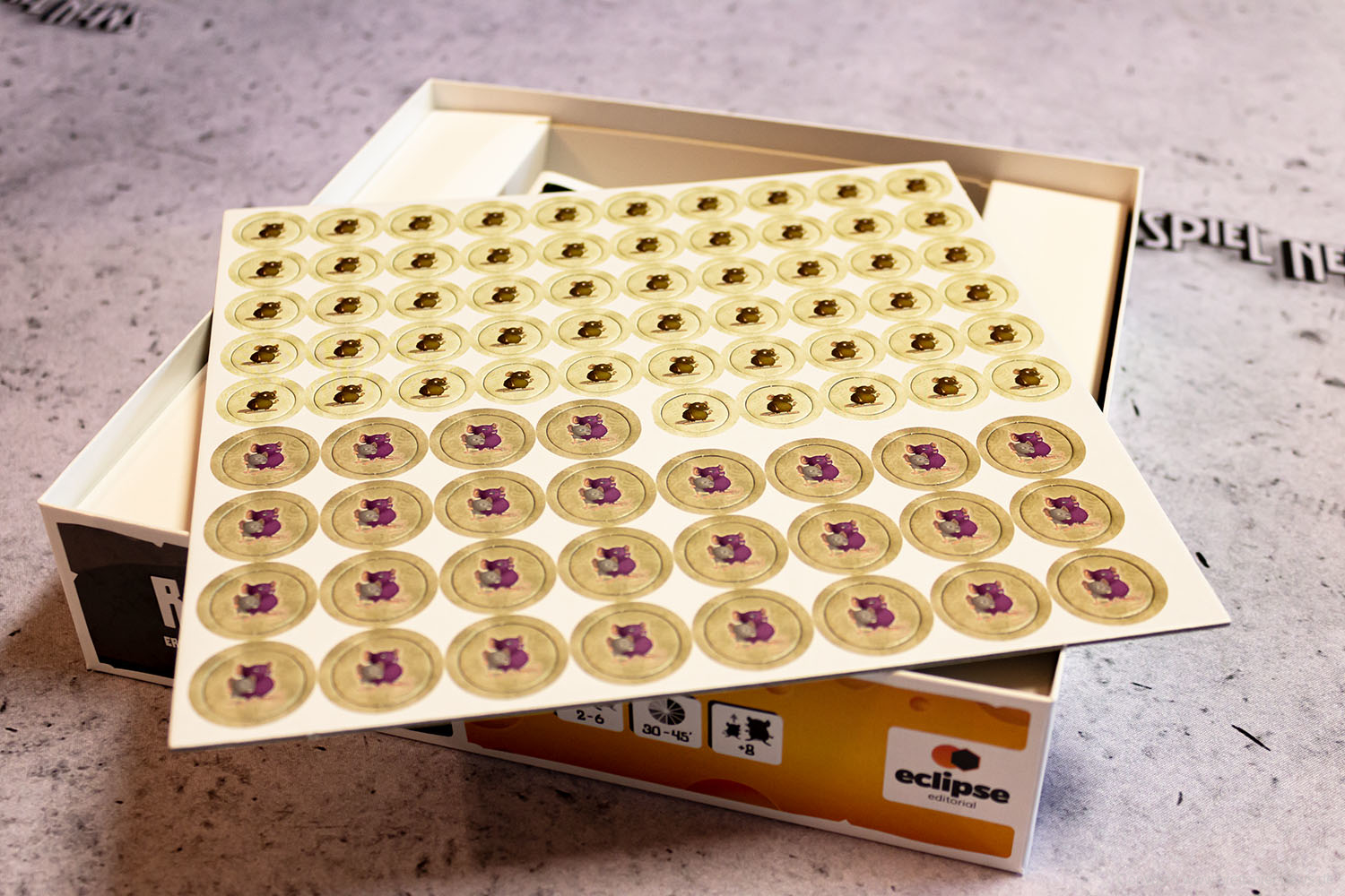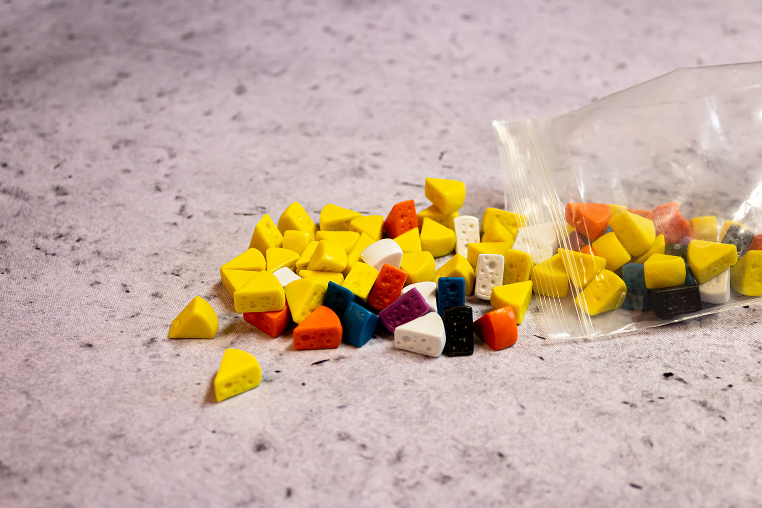 Leider ist der Käse sehr knapp bemessen. In unseren Runden werden die verschiedenen Käsehaufen zu Rundenbeginn zusammengestellt und dann später in den Beutel gefüllt, wenn der Ort abgehandelt wird. Um alle drei Orte zu Beginn der Runde vorzubereiten, reicht es häufiger nicht. Da das Spiel aber ansonsten schnell und flüssig läuft, ist dies noch zu verschmerzen.