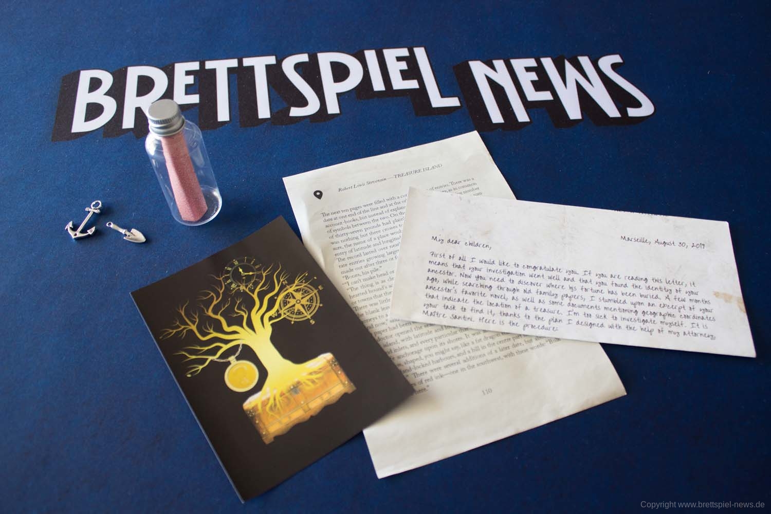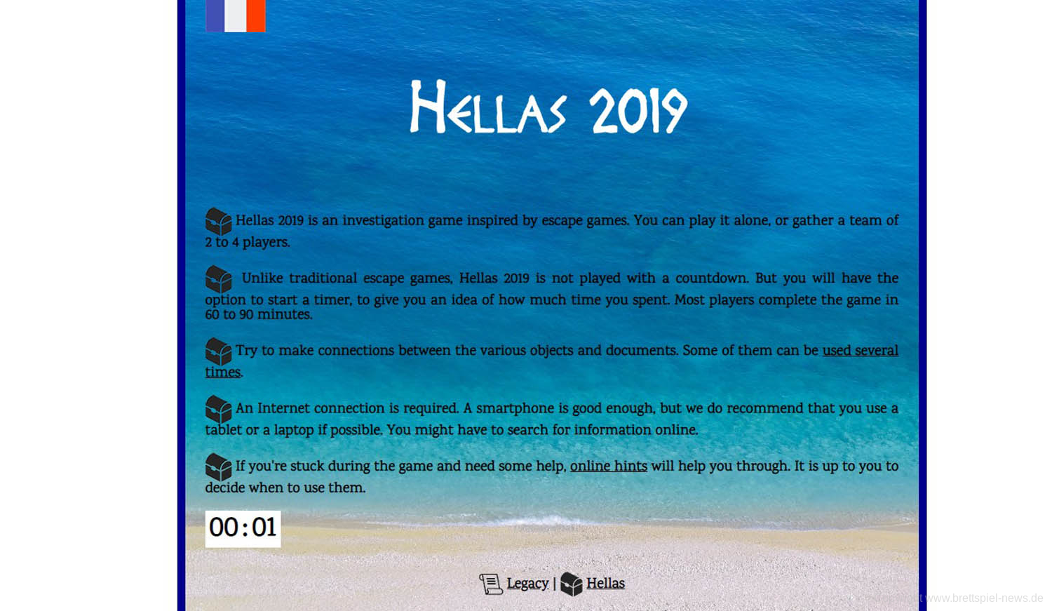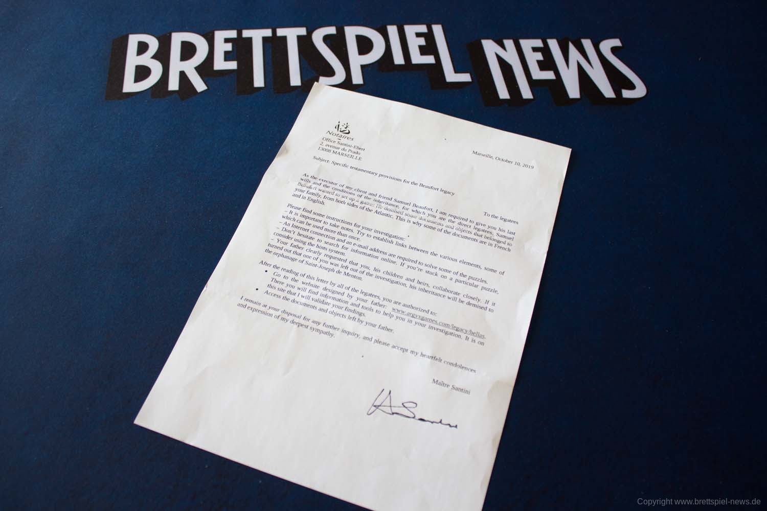 Der erste Schritt ins Abenteuer beim getesteten HELLAS ist das Lesen eines Briefes von Maître Santini, in dem der Rahmen des Spiels erklärt und eine Webadresse zum Spielstart angezeigt wird. Auf einem weiteren Schreiben, das von eurem verstorbenen Vater stammt, wird angezeigt, welche Rätsel in welcher Reihenfolge zu lösen sind. Durch Symbole neben den jeweiligen Aufgaben ist zu erkennen, welches Material auf jeden Fall für die jeweilige Aufgabe benötigt wird.