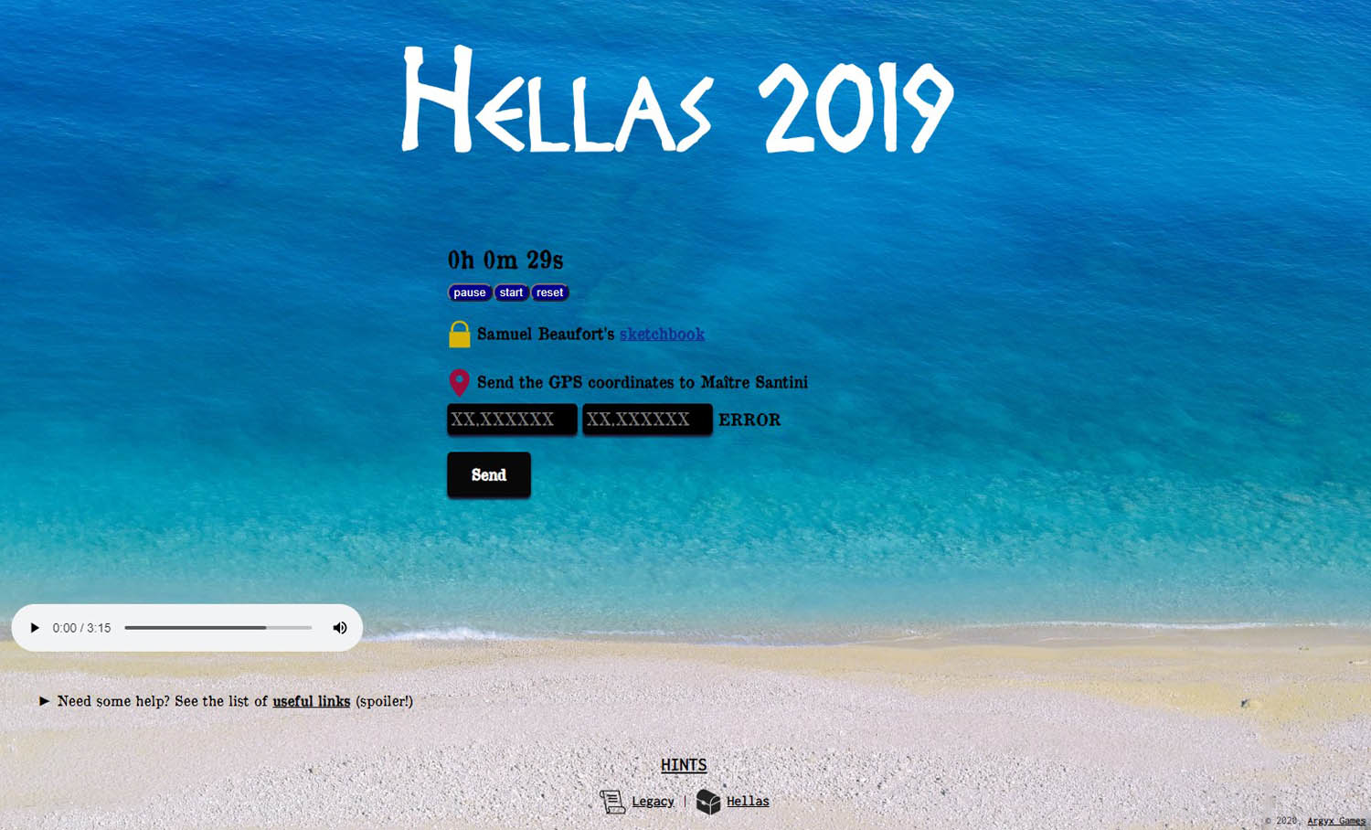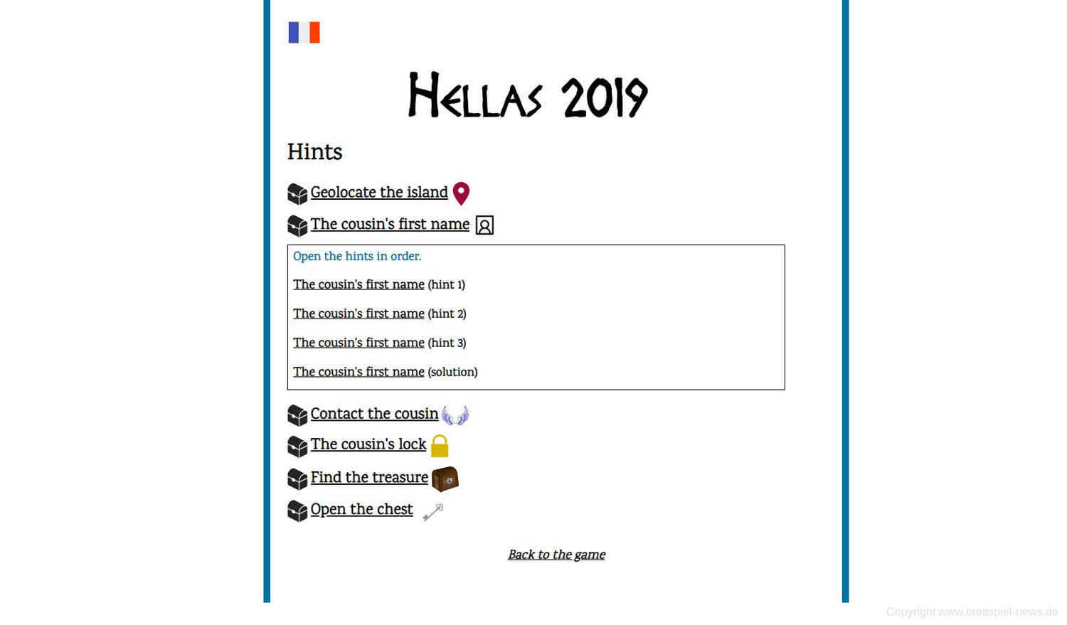 Übersehen hatten wir zunächst auch das Hilfesystem, was bei der Suche nach dem Vornamen unseres Verwandten zu großen Problemen führte. Hier gab es nämlich nirgendwo das entsprechende Symbol auf dem Material zu finden, weswegen wir schlichtweg keine Idee hatten, wie wir an dieser Stelle weiterkommen sollten. Auf der Webseite des Maîtres gab es „useful links (spoiler)“ zu finden, die wir fälschlicherweise für das Hilfesystem hielten, da durch den Inhalt hinter dem Link teils Lösungen als Elefanten in den Raum gestellt wurden. Nur zum Namen leider nicht. Später entdeckten wir im unteren Teil der Seite dann eine unscheinbare HINTS-Verknüpfung, die zum superben Hilfesystem führte und in mehreren Schritten passende Lösungen zu jedem Abschnitt anbot. Hier half der erste Hinweis dann auch direkt weiter, das passende Material zu verwenden und den Vornamen herauszufinden.