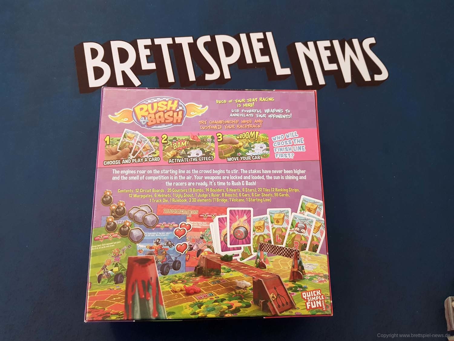 Es gab immer einmal ein paar Versuche, diese Variante von Rennspielen auch als Brettspiel umzusetzen: etwa das namentlich verwandte RUSH & CRUSH, BAT CUP oder Exoten wie FAST & FHTAGN (ja, es gibt tatsächlich ein Cthulhu-Rennspiel). Aber sie alle kommen mit vergleichsweise dicken Regelheften, komplizierten Mechaniken und oft auch einer deutlich längeren Spieldauer daher.