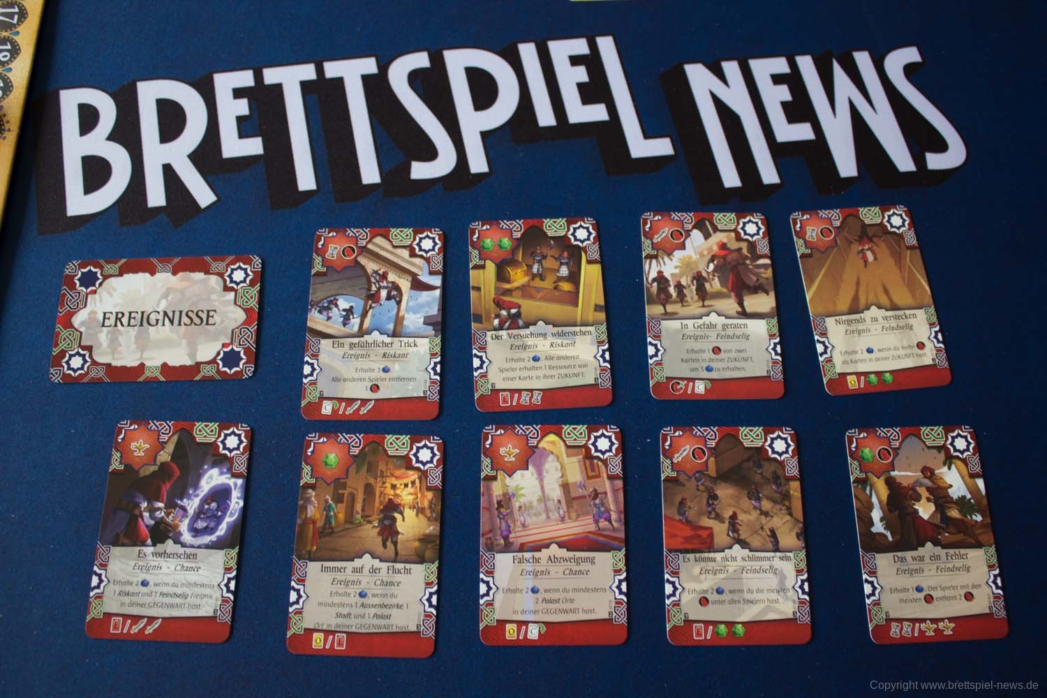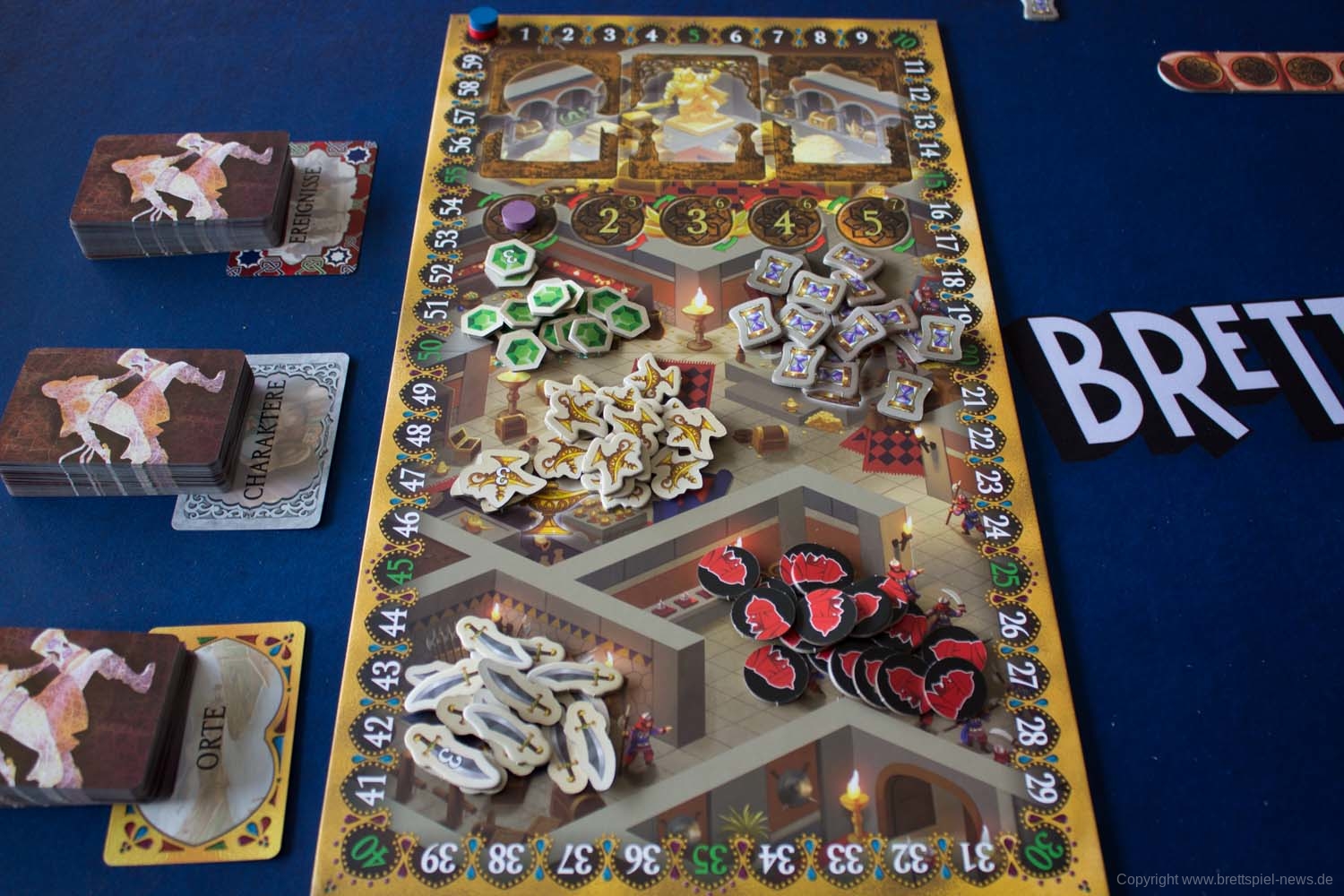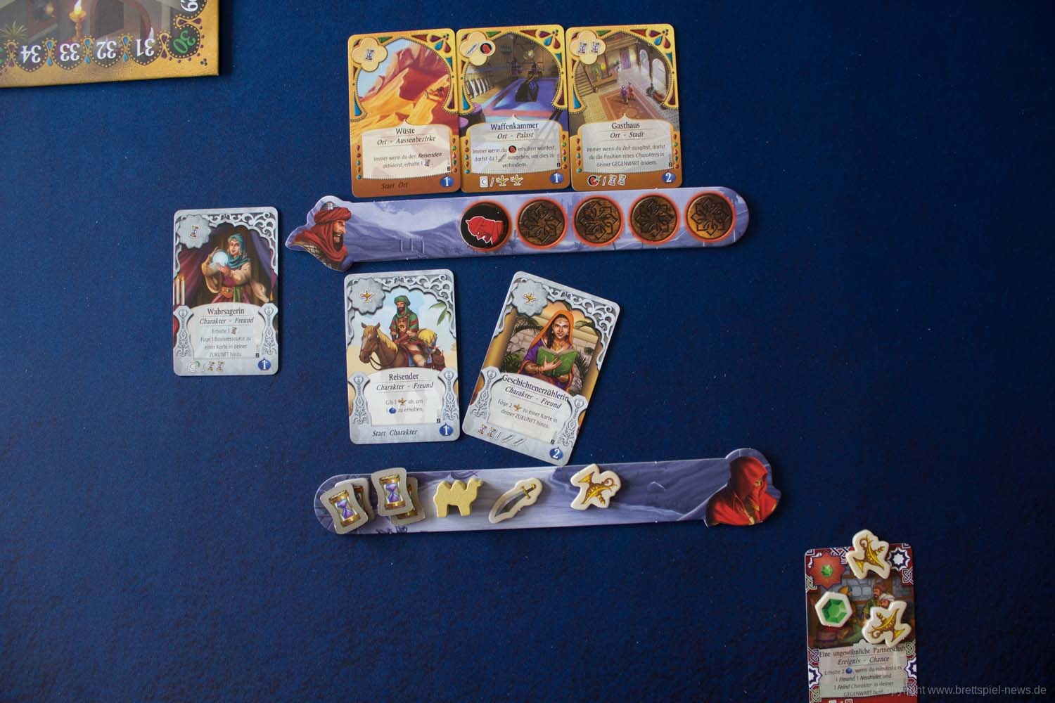 Abschließend gibt es noch die Bestechungsphase. Hier muss für jedes Gefahrenplättchen auf der Gefahrenleiste eine beliebige Ressource ausgegeben werden. Ist dies nicht möglich, muss ein Schicksalspunkt und somit ein Siegpunkt abgezogen werden. Mit dem Ende der Runde werden alle Charakterkarten zurückgesetzt und die nächste Runde beginnt wieder in der Planungsphase. Beendet ist das Spiel nach 5 Runden. Die Punkte der Karten in der Vergangenheit werden gezählt und zu den bereits erspielten Schicksalspunkten addiert. Zudem gibt es noch jeweils 1 Schicksalspunkt für je 5 Säbel, Juwelen und/oder Lampen. Der Spieler mit den meisten Schicksalspunkten hat gewonnen.