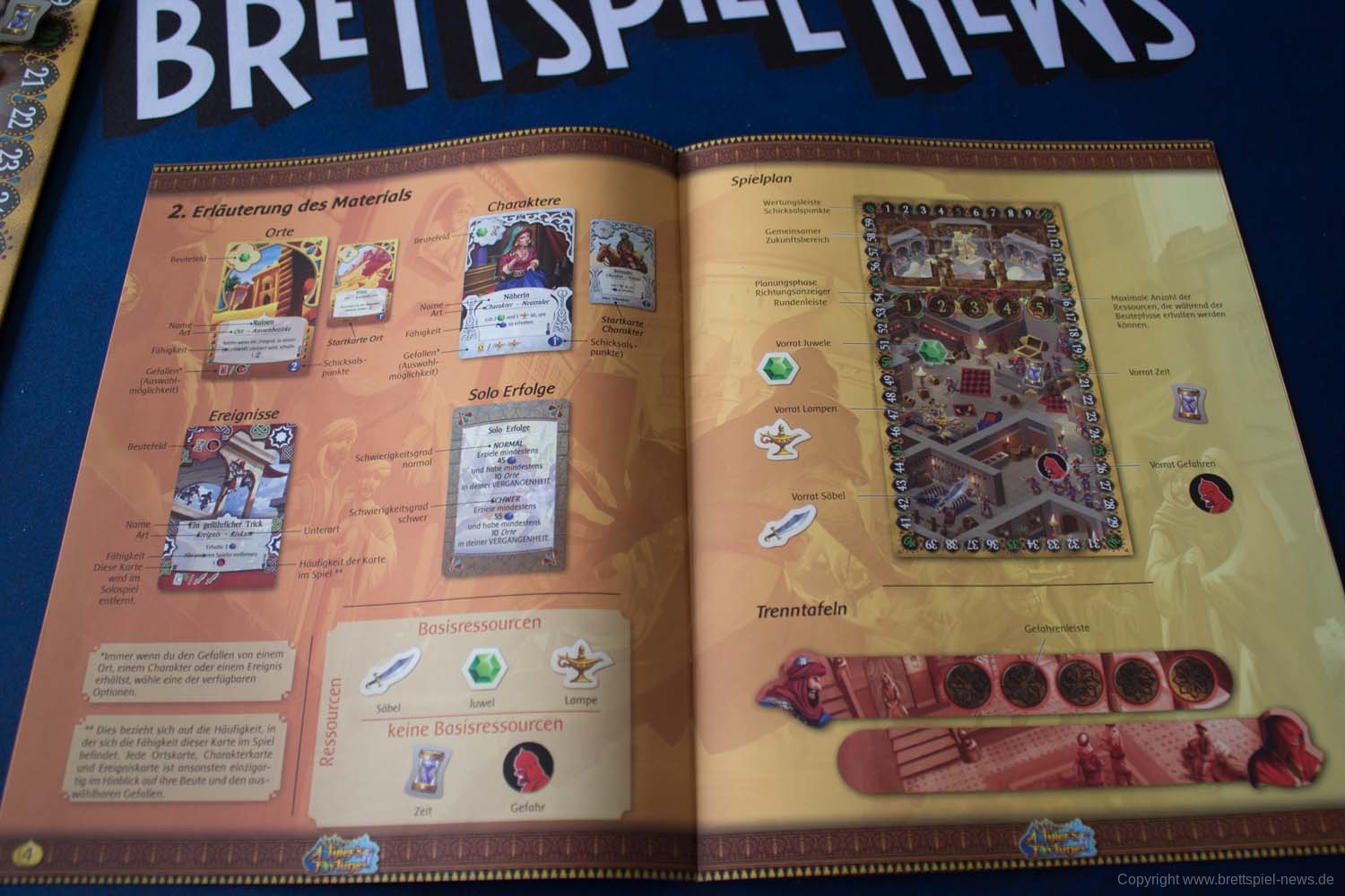Das Material ist durchweg von guter Qualität. Der Spielplan und die Trenntafeln sind aus stabilem Karton, genauso wie die einzelnen Plättchen. Die Karten sind strapazierfähig und mit fantasievollen und stimmungsvollen Motiven versehen. Die verschiedenen Marker sind aus Holz gefertigt.
