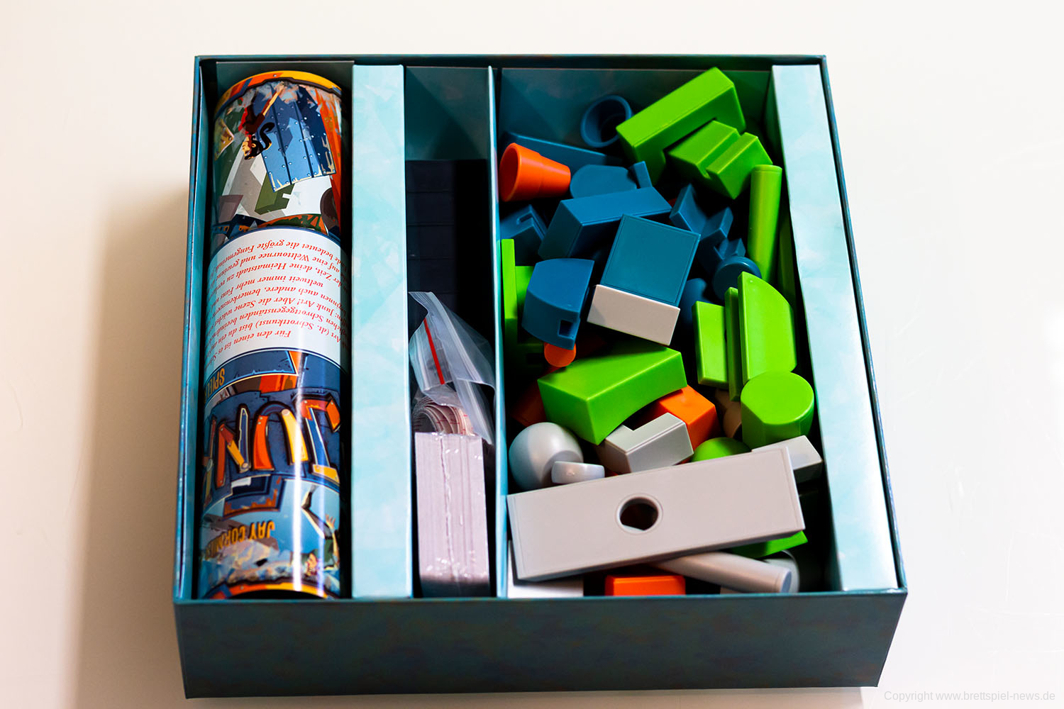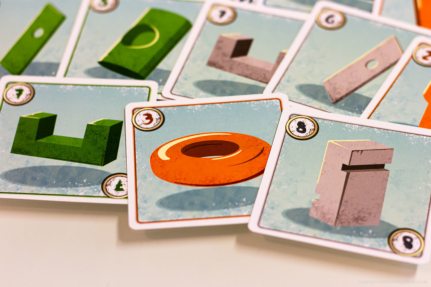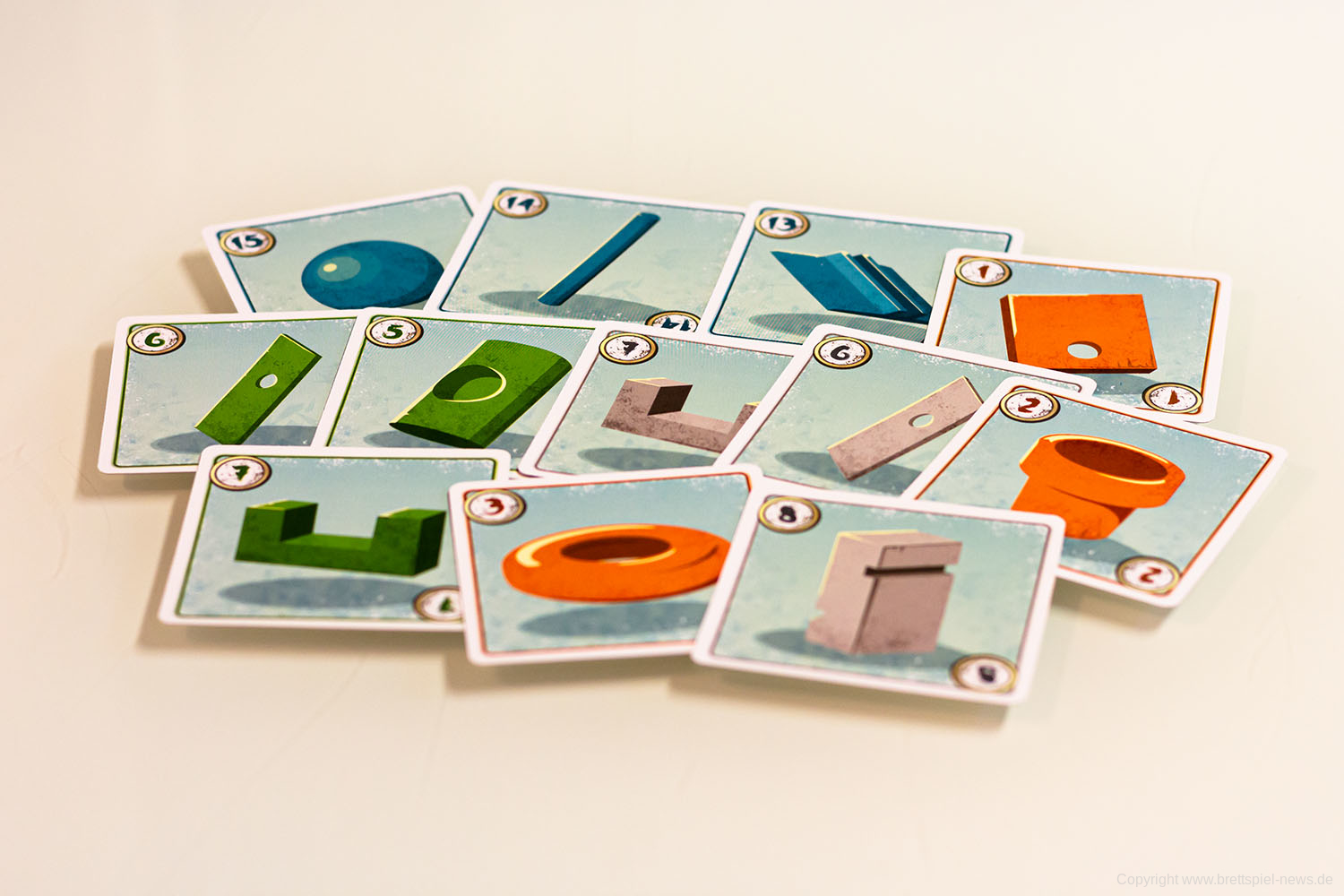Das Herzstück sind die 15 verschiedenen Plastikteile. Hier haben sich die Autoren wirklich Gedanken gemacht, denn die Teile sind aufeinander abgestimmt und doch ist es eine Herausforderung, sie aufeinander zu stapeln. Es gibt wirklich überraschend viele Möglichkeiten, diese zufällig erscheinenden Teile miteinander zu kombinieren.