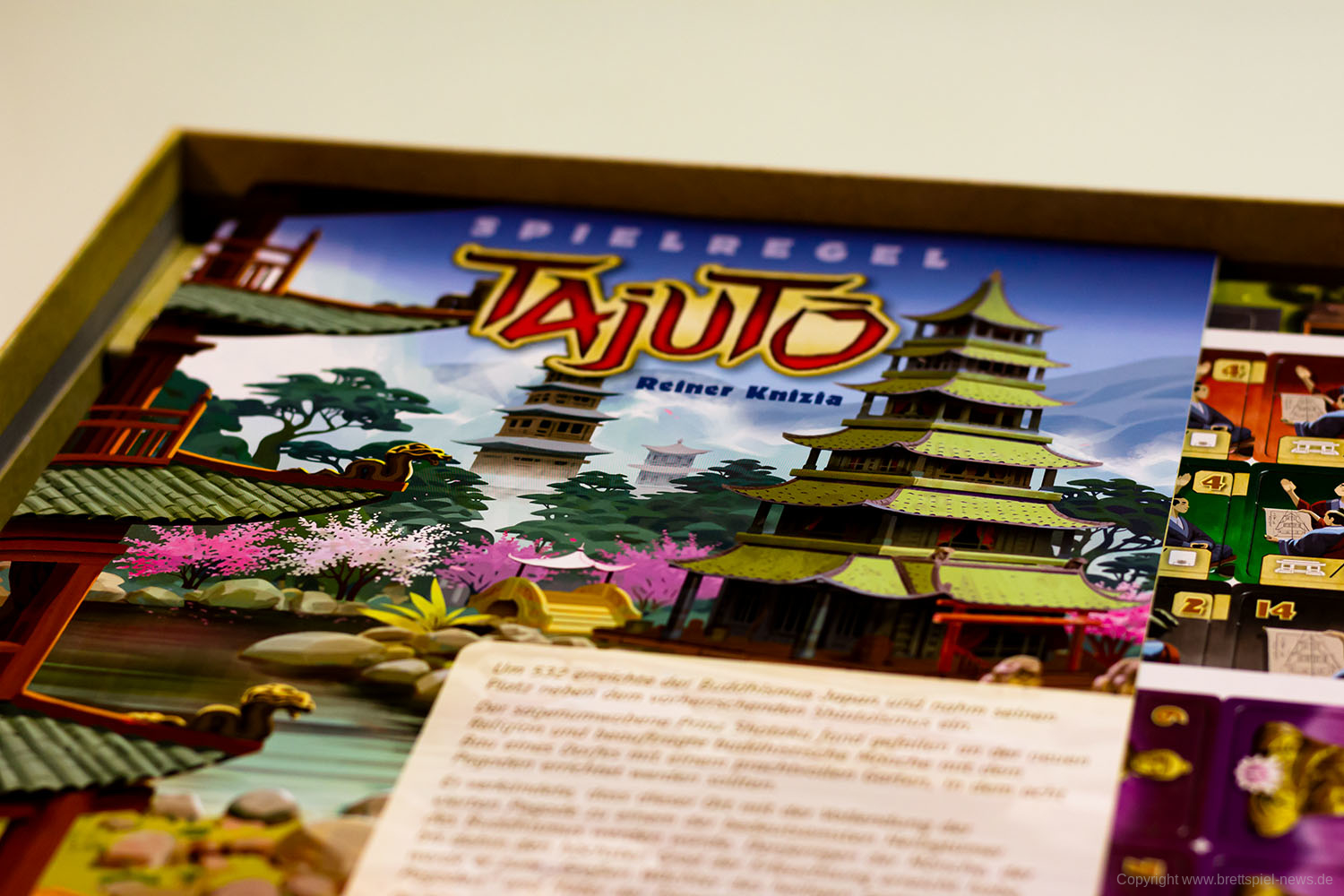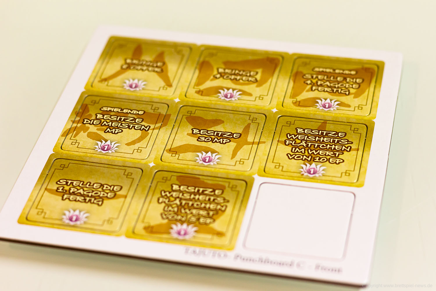 An sich nicht tragisch, aber irgendwie doch traurig, finde ich den Werbetext auf der Schachtelrückseite. Da hätte auf jeden Fall noch einmal jemand kurz auf Rechtschreibung und Grammatik bzw. Lesbarkeit prüfen sollen. Was ich auch nirgendwo finden konnte, ist, was TAJUTO denn nun eigentlich heißt oder wofür es steht. Das steht dann doch irgendwie im Kontrast dazu, dass hier mit dem Material, der Illustration und auch den Begrifflichkeiten (Meditation, Erleuchtung) versucht wurde, eine thematische Erfahrung zu schaffen.