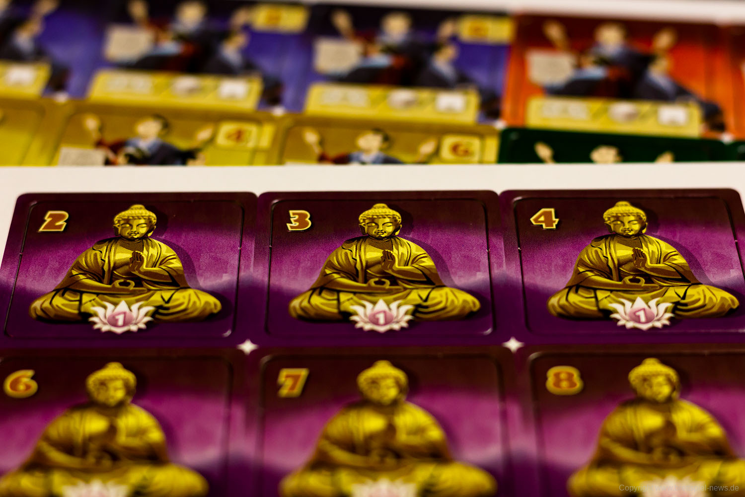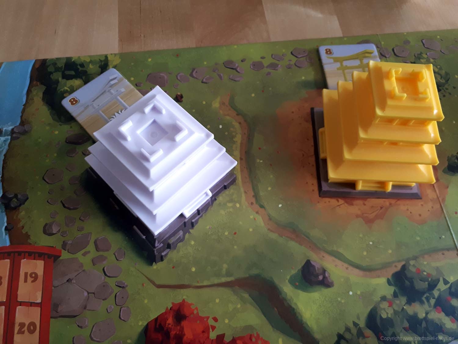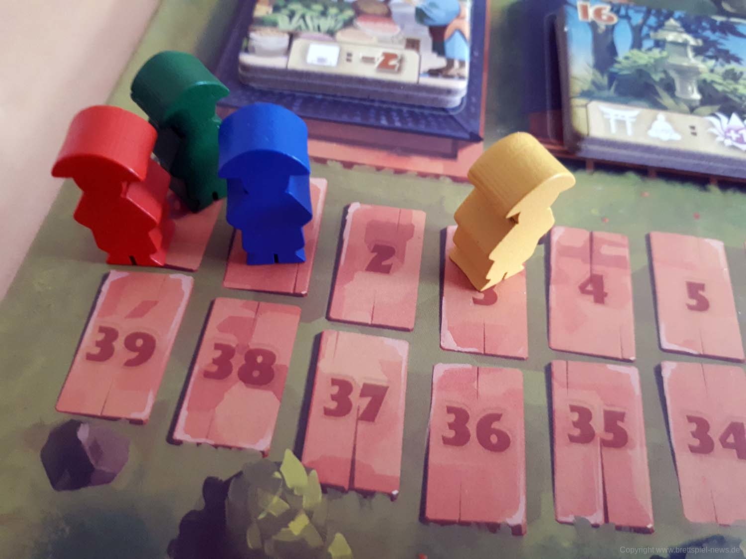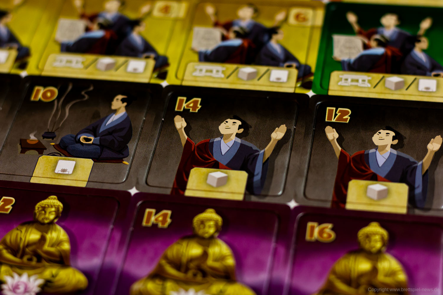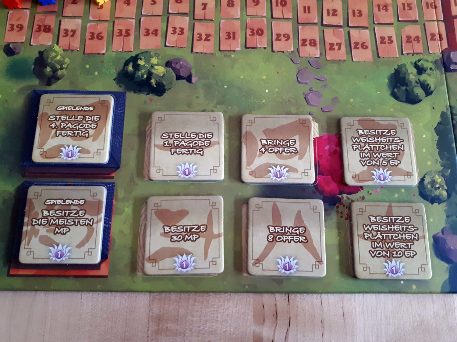 Mit kleinen Mönchsfiguren aus Holz werden für jeden Spieler die Meditationspunkte auf einer gemeinsamen Leiste auf dem Spielplan angezeigt. Da nicht jeder Spieler am Tisch diesen Teil des Spielplans gut erreichen kann, hat in unseren Spielrunden immer eine Person alle Figuren bewegt. Da diese Punkte ständig hinzukommen und dann auch wieder schnell ausgegeben werden, ist hier ein Spieler eigentlich das ganze Spiel über mit dieser Leiste beschäftigt. Für den Spielablauf fand ich persönlich das nicht weiter schlimm, aber es wäre vielleicht intuitiver gewesen, wenn jeder Spieler vor sich eine eigene Leiste mit den Punkten gehabt hätte.