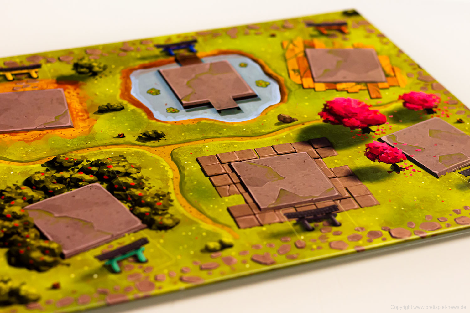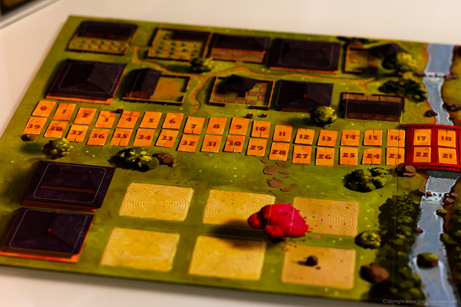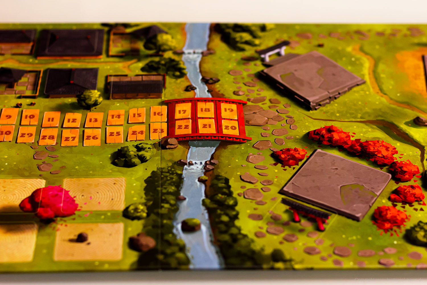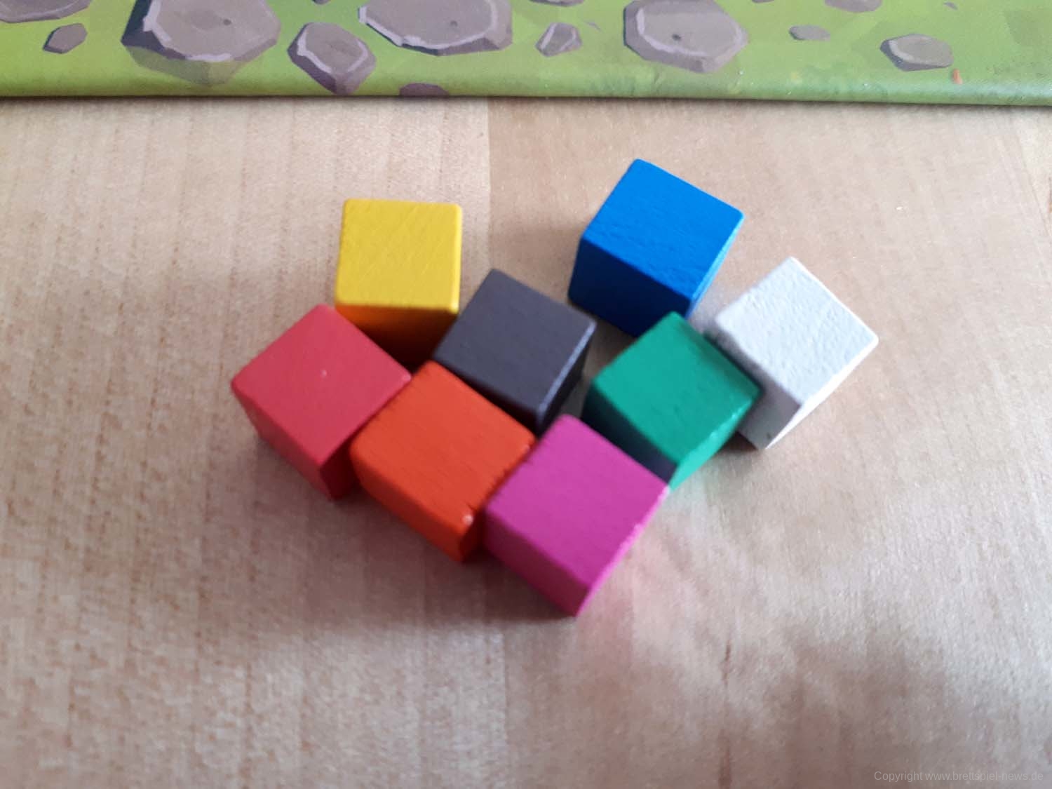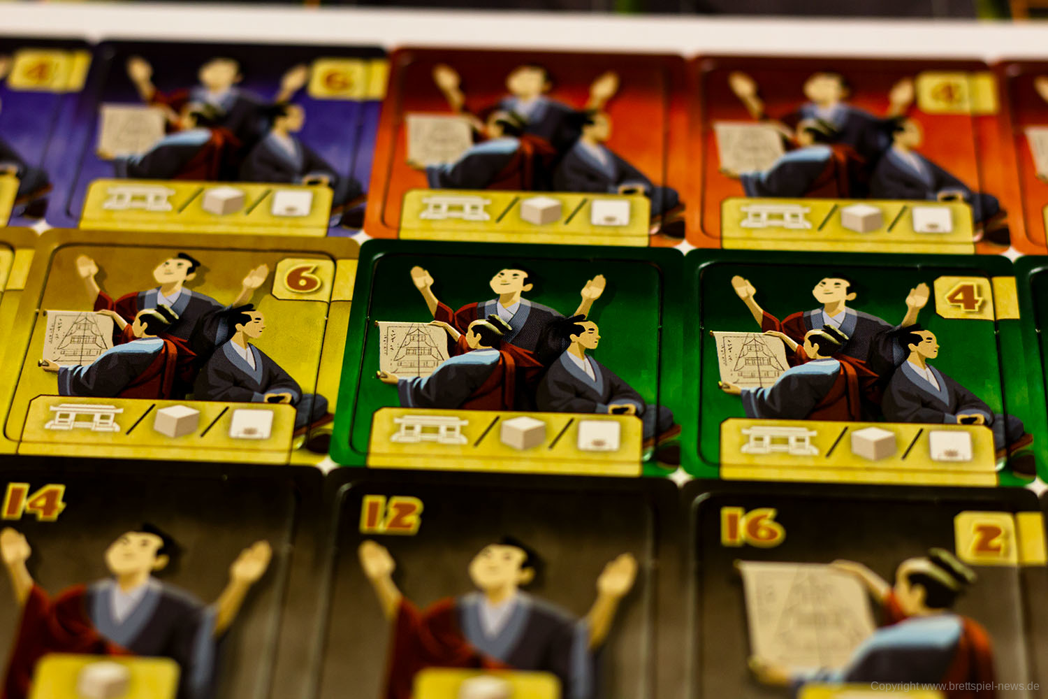 Mit kleinen Mönchsfiguren aus Holz werden für jeden Spieler die Meditationspunkte auf einer gemeinsamen Leiste auf dem Spielplan angezeigt. Da nicht jeder Spieler am Tisch diesen Teil des Spielplans gut erreichen kann, hat in unseren Spielrunden immer eine Person alle Figuren bewegt. Da diese Punkte ständig hinzukommen und dann auch wieder schnell ausgegeben werden, ist hier ein Spieler eigentlich das ganze Spiel über mit dieser Leiste beschäftigt. Für den Spielablauf fand ich persönlich das nicht weiter schlimm, aber es wäre vielleicht intuitiver gewesen, wenn jeder Spieler vor sich eine eigene Leiste mit den Punkten gehabt hätte.