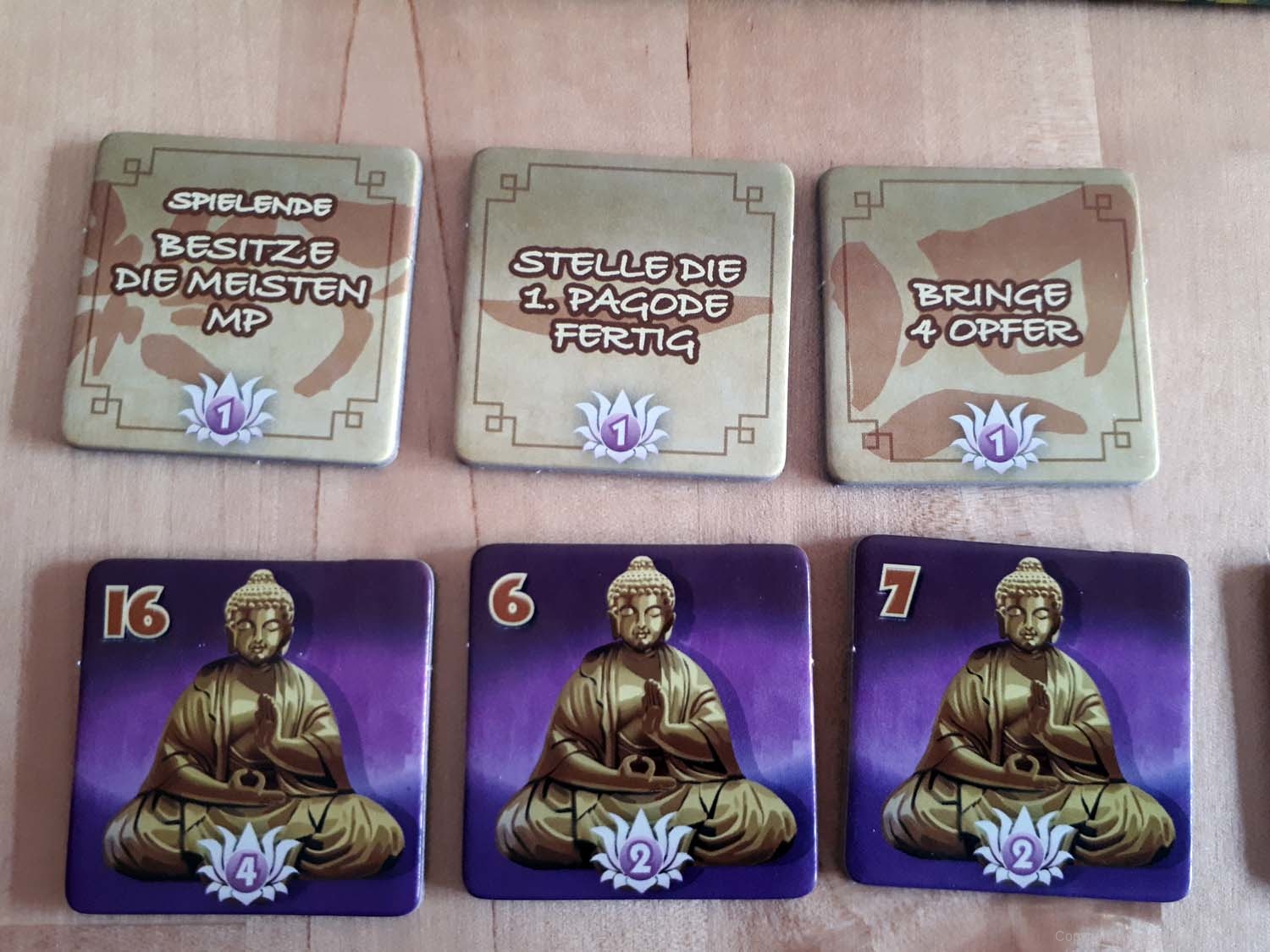 Getragen wird das Spiel vom guten und funktionalen Material, das – während die Pagoden Stockwerk für Stockwerk wachsen – eine schöne Präsenz auf dem Tisch entwickelt. Das Thema spiegelt sich hier schön im Material wider. Der Spielablauf ist dabei recht gut strukturiert, sodass die Spieler gut in den Ablauf reinkommen. Dabei hilft, dass die Regel gut strukturiert geschrieben ist. Allerdings finde ich die Bezeichnung von Meditationspunkten als Währung und Erleuchtungspunkten als Siegpunkte sehr holprig. Hier kamen mehrfach Nachfragen, was mache ich jetzt mit diesen Punkten?