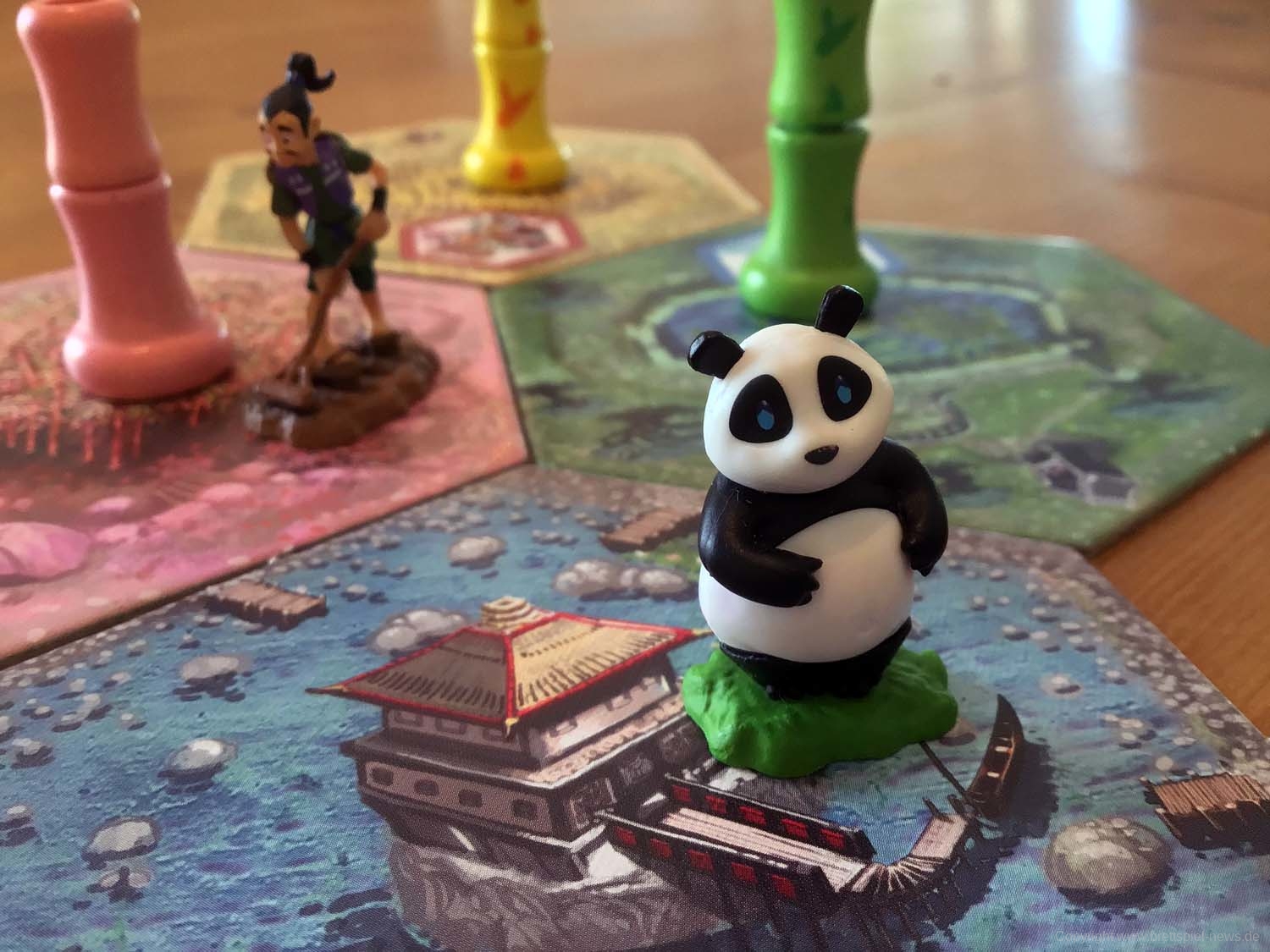 Besonders hervorzuheben ist das wunderschöne und hochwertige Spielmaterial in TAKENOKO. Sofort fallen einem die beiden bemalten Figuren des Pandas und des Gärtners auf. Die hochwertigen Holztokens sind ebenfalls bemalt und jedes einzelne der sechseckigen ,,Beete“ ist individuell und sehr detailreich illustriert. Die farbigen Bambusstücke aus Holz lassen sich zu kleinen Türmchen aufeinander stecken, sodass während des Spiels ein dreidimensionales Bambuswäldchen entsteht. Die Schachtel kommt vorbildlich mit Inlay für das Ein- und Ausräumen des Spielmaterials daher, in dem auch noch die Erweiterung Platz findet.