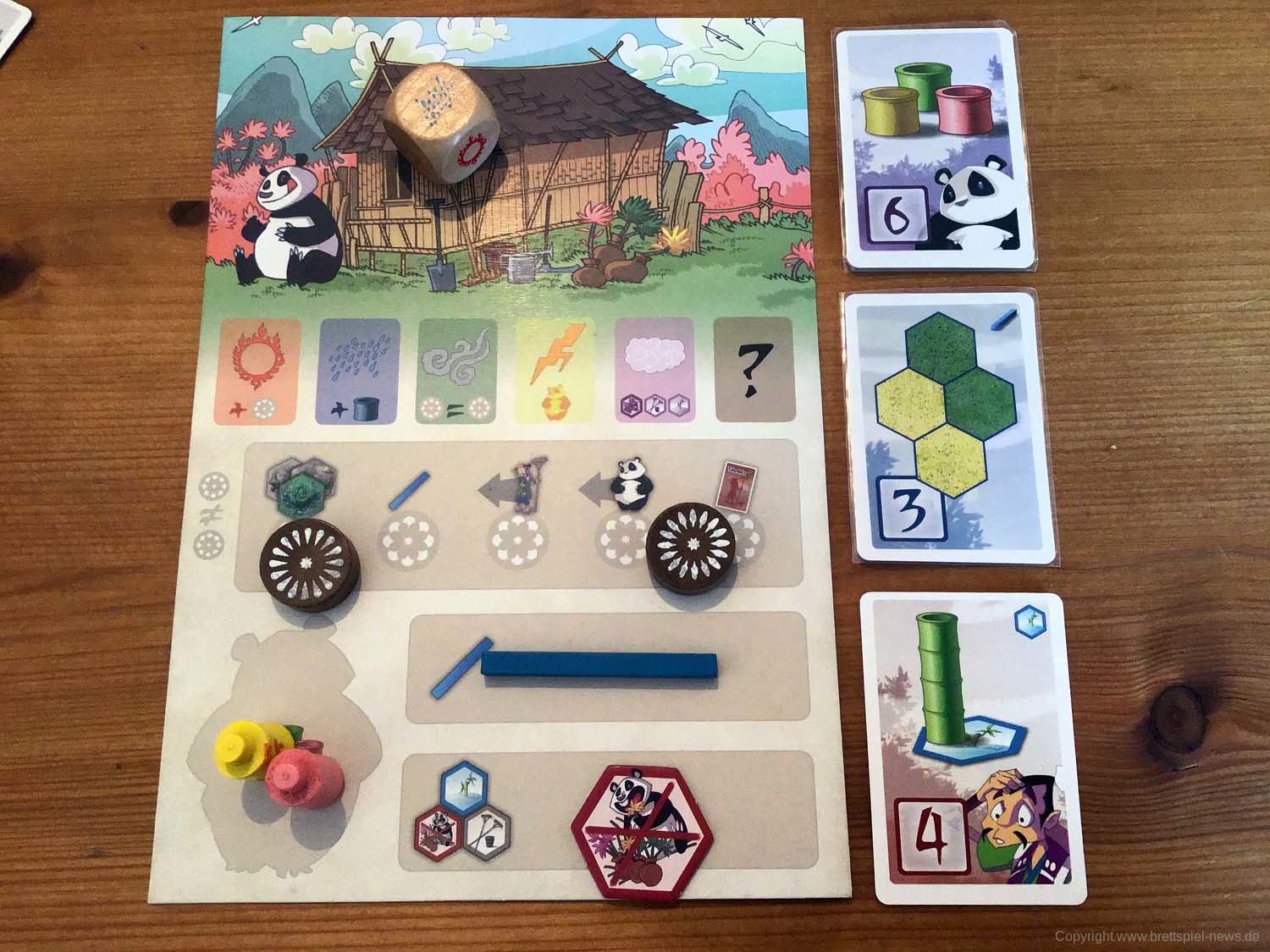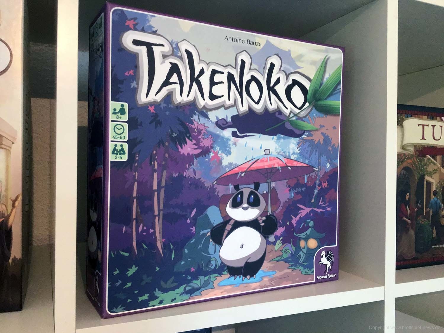 TAKENOKO hat uns vor allem durch seine besonders atmosphärische Aufmachung fasziniert. Mit hochwertigen Holzmaterialien und bemalten Figuren macht das Brettspielen generell besonders Spaß. Erfahrungsgemäß freut sich das Brettspielerherz auch immer über ein passendes Inlay ohne eine Flut an Zipptütchen. Während des Spiels (vor allem mit mehreren Spielern) ist TAKENOKO einfach eine Augenweide. Es simuliert durch die dreidimensionale Bauweise das Gefühl, etwas wirklich wachsen oder den Panda Teile fressen zu lassen.