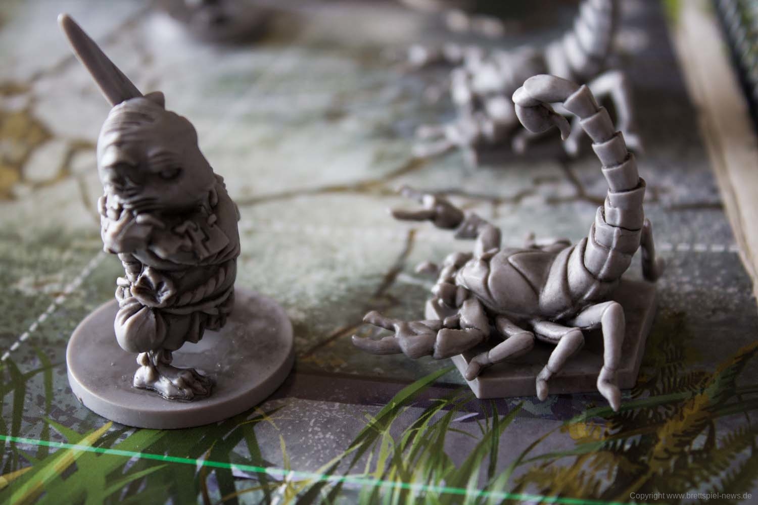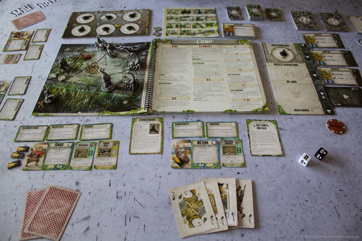Das Material ist von hervorragender Qualität. Vor allem die liebevoll gestalteten Miniaturen, die mit einer Schattierung versehen sind, wodurch Details gut hervorgehoben werden, sind direkt ein Eyecatcher. Bei einigen Kickstartern wurde diese Art der schnellen Bemalung teils als Extra angeboten, was die Hersteller sich gut bezahlen ließen. Hier gibt es dieses Extra direkt für alle frei Haus. Die Vielzahl unterschiedlicher Karten sind von guter, strapazierfähiger Qualität, genauso wie die einzelnen Tokens und die beiden Tafeln aus festem Karton. Zum einfachen Speichern des Spiels gibt es verschiedene Deckboxen. Das dicke Abenteuerbuch ist ein stabiles Ringbuch, das den Strapazen beim oft vorkommenden Blättern gut standhalten dürfte. Lediglich der Reiseplan ist aus dünnem Karton, wird aber auch nicht sonderlich beansprucht. Das Spiel hat einige Legacy-Elemente, was allerdings nur bedeutet, dass Karten ins Spiel kommen, während andere in die Verbannt-Box gelegt werden. Es wird nichts zerstört, wodurch das Spiel problemlos mehrfach gespielt werden kann.