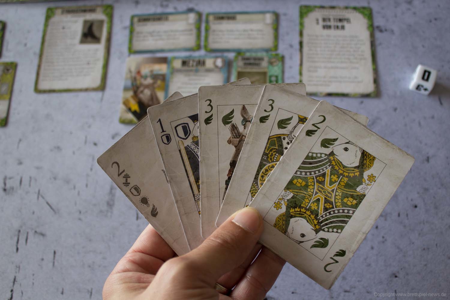 Die farbigen Karten mit Mäusesymbolen sowie die hellen Jokerkarten, die als beliebige Farben genutzt werden können, ermöglichen eine Bewegung. Jeder Wertepunkt ist für die Bewegung zu einem benachbarten Feld nutzbar. Überwindbare Hindernisse in bestimmten Farben lassen sich mit der entsprechenden Farbkarte auf gleiche Weise passieren, mit andersfarbigen Karten sind dafür 3 Punkte erforderlich. Beim Kämpfen kann generell zwischen Nah- und Fernkampf gewählt werden, unabhängig davon, ob eine Waffe ausgerüstet ist. Bei Fernkampf werden die Werte von grünen Karten addiert, für den Nahkampf die von roten. Zusätzlich können Karten verwendet werden, die der Punktzahl der zuerst ausgespielten Karte entsprechen. Anschließend wird der Verteidigungswert des Gegners auf der Gegnerkarte genommen und es werden der weiße und der schwarze Würfel für eine heikle Probe geworfen. Der weiße Würfel wird zum eigenen Angriffswert addiert, der schwarze Würfel zum Verteidigungswert des Gegners. Ist der Angriffswert mindestens so hoch wie der Verteidigungswert, ist der Angriff geglückt und der Angegriffene erleidet einen Schaden, was in vielen Fällen zu seinem Ableben führt. Angriffe gegen die Helden werden in gleicher Weise abgehandelt. Der Angegriffene wählt hierbei eine Eigenschaftsfarbe nach Wahl zum Verteidigen.