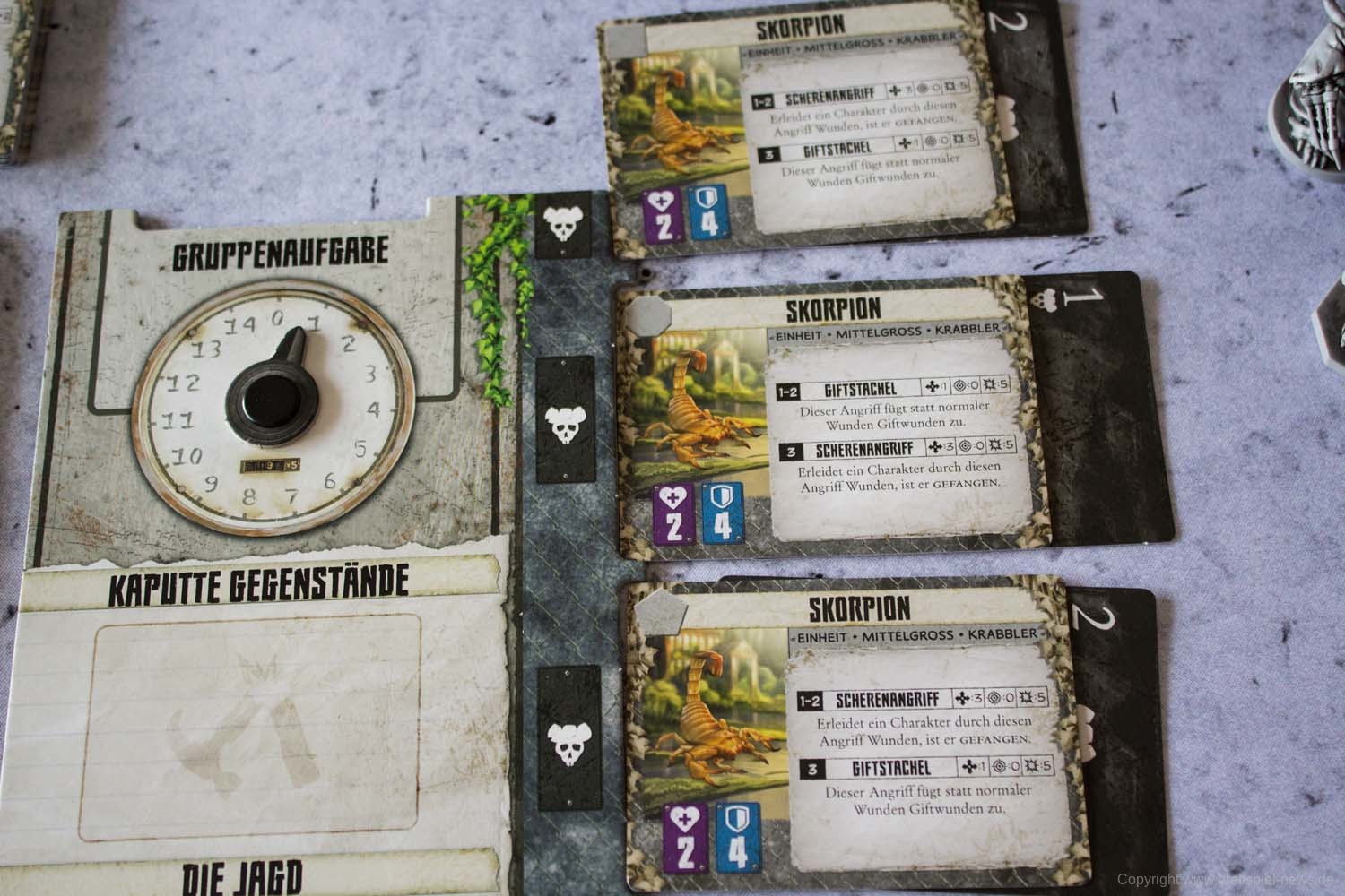 In seinem Zug zieht jeder Spieler auf 5 Handkarten nach. Karten können je nach Farbe für verschiedene Aktionen oder Proben genutzt werden. Schwarze Karten sind ganz schlecht, da sie Bedrohungskarten darstellen und an die Bedrohungsleiste angelegt werden. Liegen 4 oder mehr Karten an der Leiste an, wird der Bedrohungseffekt des aktuellen Szenarios abgehandelt. Dadurch können u.a. bestimmte Umgebungseffekte oder Kämpfe mit Gegnern ausgelöst werden. Im Spiel gibt es zusätzlich noch eine Katastrophenkarte, die ebenfalls im Szenario vorgegebene Aktionen auslöst, wenn die abgelaufene Zeit und das Würfelpech in Summe zu hoch ausfallen. Solange die Situation als „sicher“ angegebenen ist, können gegnerische Figur überredet werden, sich der Kolonie anzuschließen. Aber Achtung – wenn der Überredungsversuch scheitert, kippt die Stimmung und sie wird „gefährlich“, wodurch die Gegner angreifen.