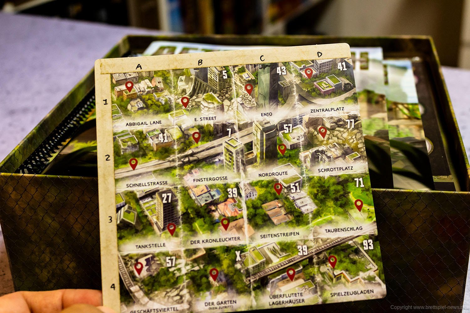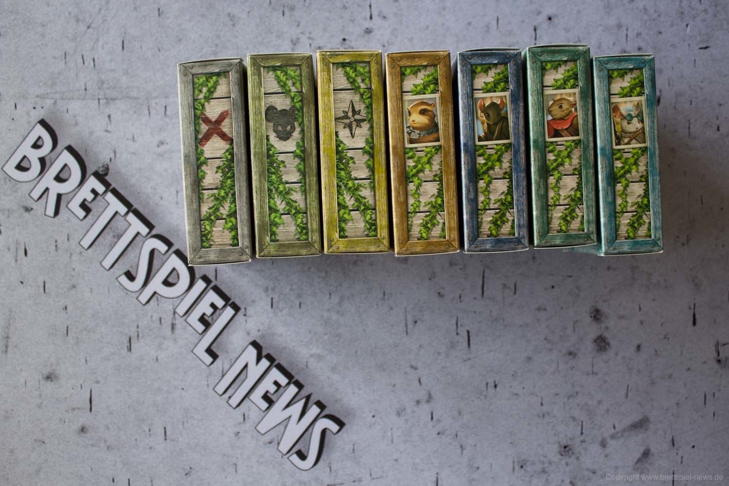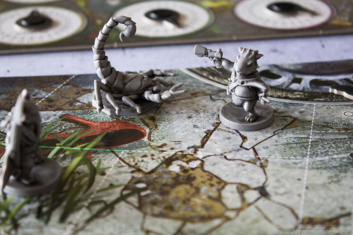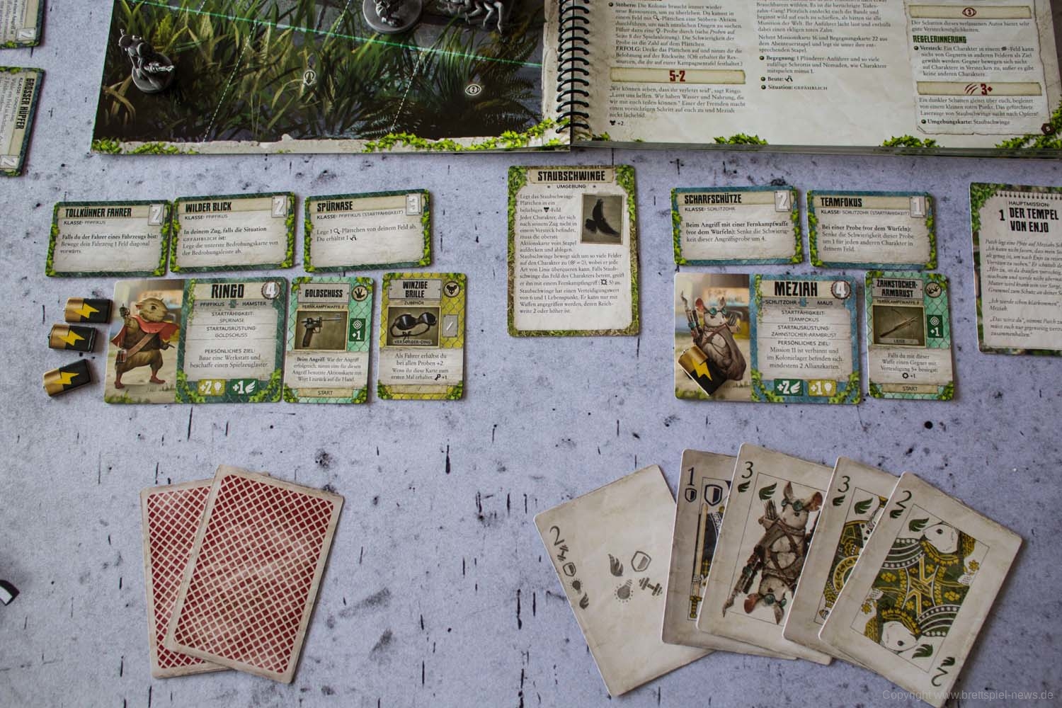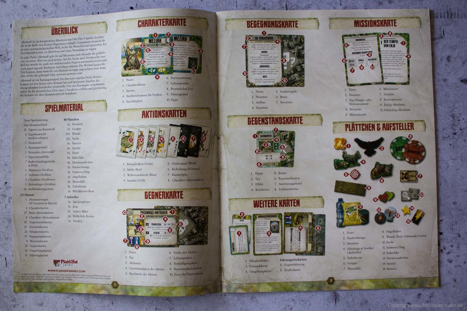 MAUS & MYSTIK habe ich seit Ewigkeiten auf dem Pile of Shame. Wegen des tollen Designs habe ich mir aber weiterhin vorgenommen, es irgendwann zu spielen. Was die Abenteuerspiele von PLAID HAT GAMES anbetrifft, darf ich mich aber durchaus als Veteran rühmen. Ich habe HERR DER TRÄUME gespielt und fand die Idee und Mechaniken interessant, obgleich mir die Anforderungen dann doch deutlich zu seicht waren. KOMANAUTEN hat das Konzept erweitert und auf eine reifere Zielgruppe zugeschnitten. Gefallen hat mir dabei allerdings überhaupt nicht, dass das Spiel im Grunde keine zusammenhängende Geschichte erzählt, sondern am Ende einfach nur eine zufällige Aneinanderreihung von Missionen bot. Umso gespannter war ich auf AFTERMATH, das die wunderschöne MAUS & MYSTHIK Optik in eine postnuklear wirkende Welt steckte, den Spirit von HERR DER TRÄUME einfing und die erwachsene Spieltiefe von KOMANAUTEN versprach.