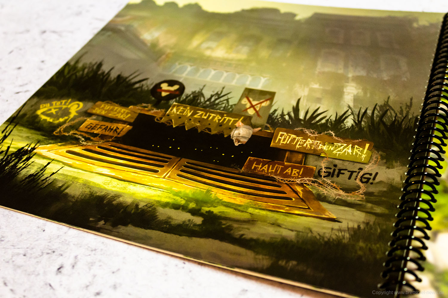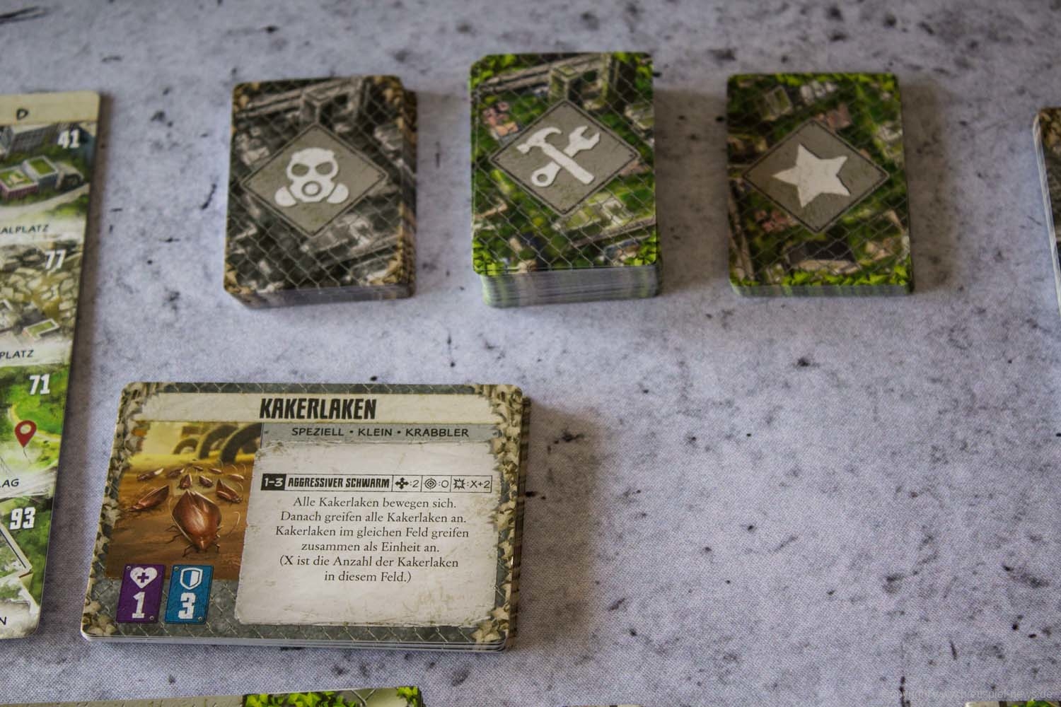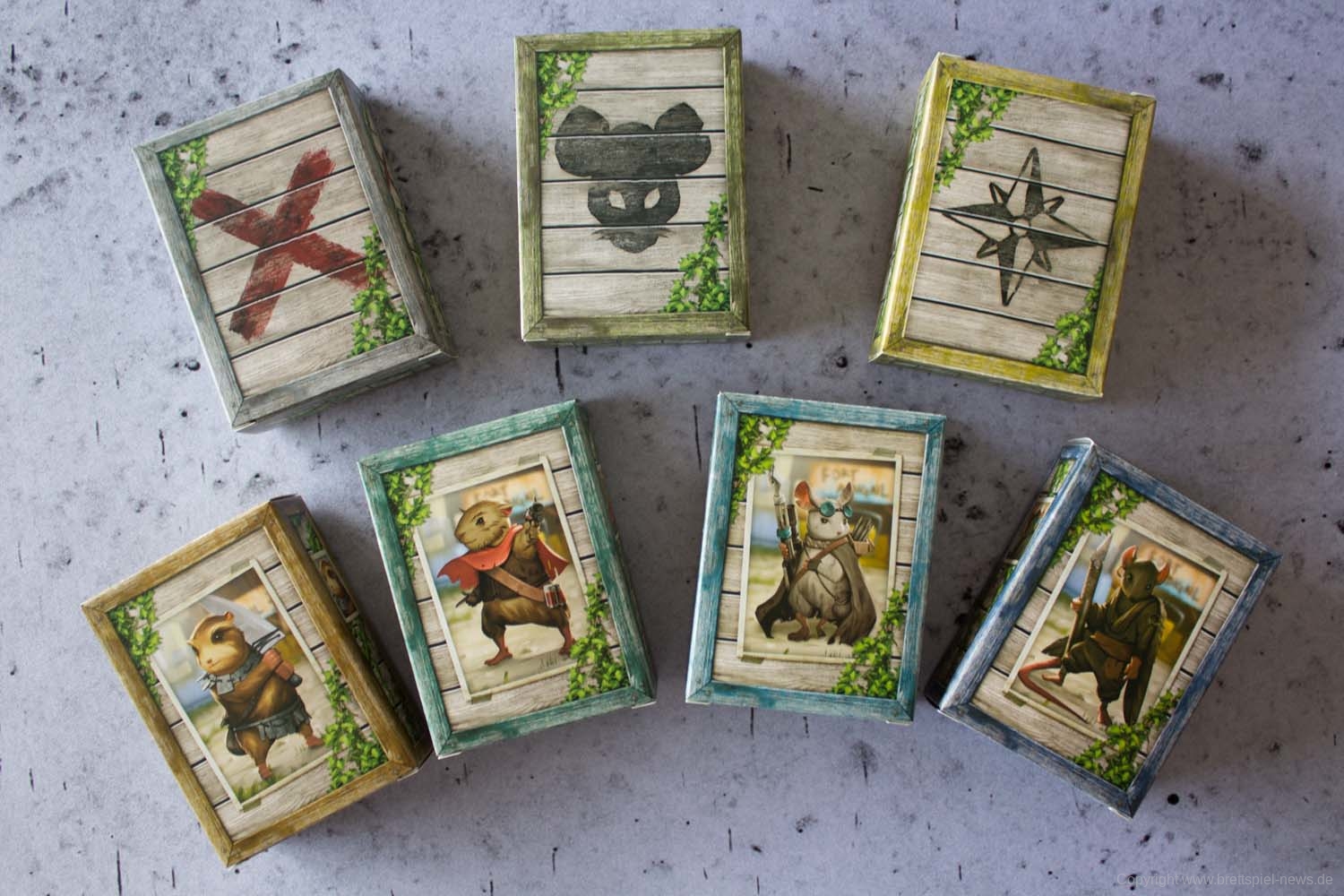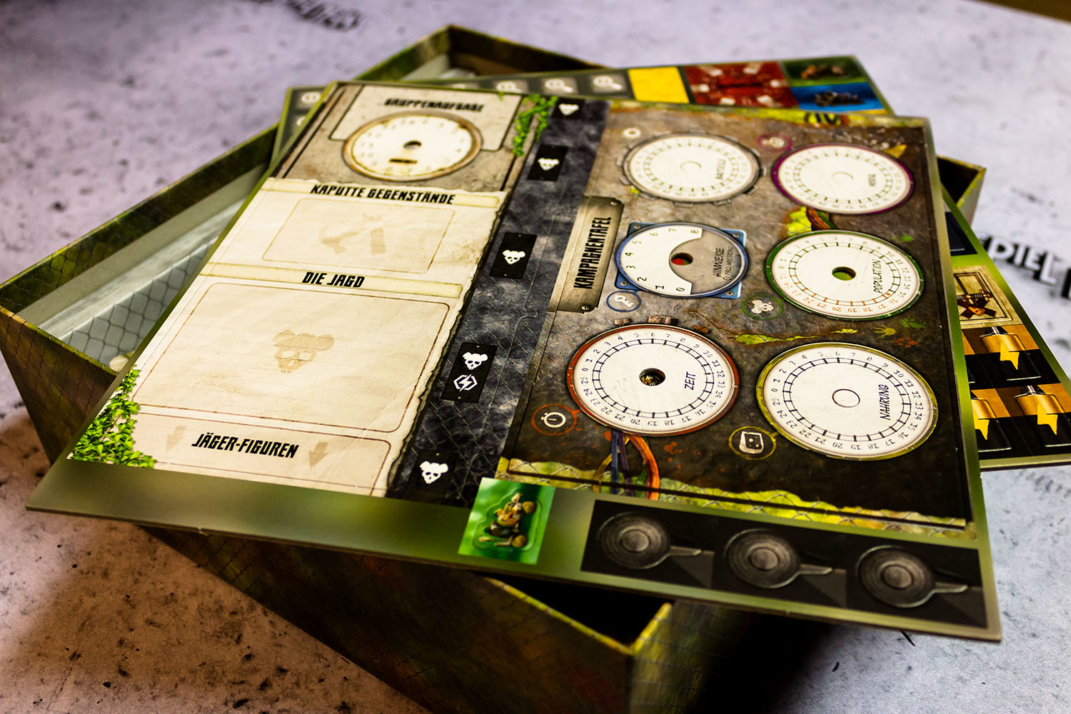 MAUS & MYSTIK habe ich seit Ewigkeiten auf dem Pile of Shame. Wegen des tollen Designs habe ich mir aber weiterhin vorgenommen, es irgendwann zu spielen. Was die Abenteuerspiele von PLAID HAT GAMES anbetrifft, darf ich mich aber durchaus als Veteran rühmen. Ich habe HERR DER TRÄUME gespielt und fand die Idee und Mechaniken interessant, obgleich mir die Anforderungen dann doch deutlich zu seicht waren. KOMANAUTEN hat das Konzept erweitert und auf eine reifere Zielgruppe zugeschnitten. Gefallen hat mir dabei allerdings überhaupt nicht, dass das Spiel im Grunde keine zusammenhängende Geschichte erzählt, sondern am Ende einfach nur eine zufällige Aneinanderreihung von Missionen bot. Umso gespannter war ich auf AFTERMATH, das die wunderschöne MAUS & MYSTHIK Optik in eine postnuklear wirkende Welt steckte, den Spirit von HERR DER TRÄUME einfing und die erwachsene Spieltiefe von KOMANAUTEN versprach.