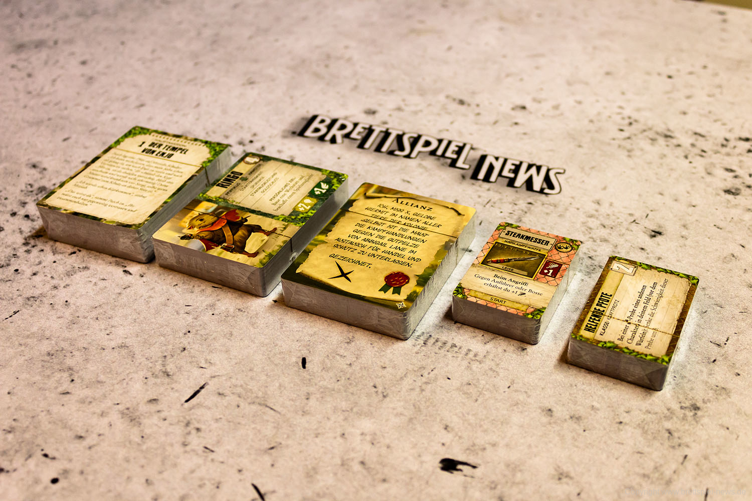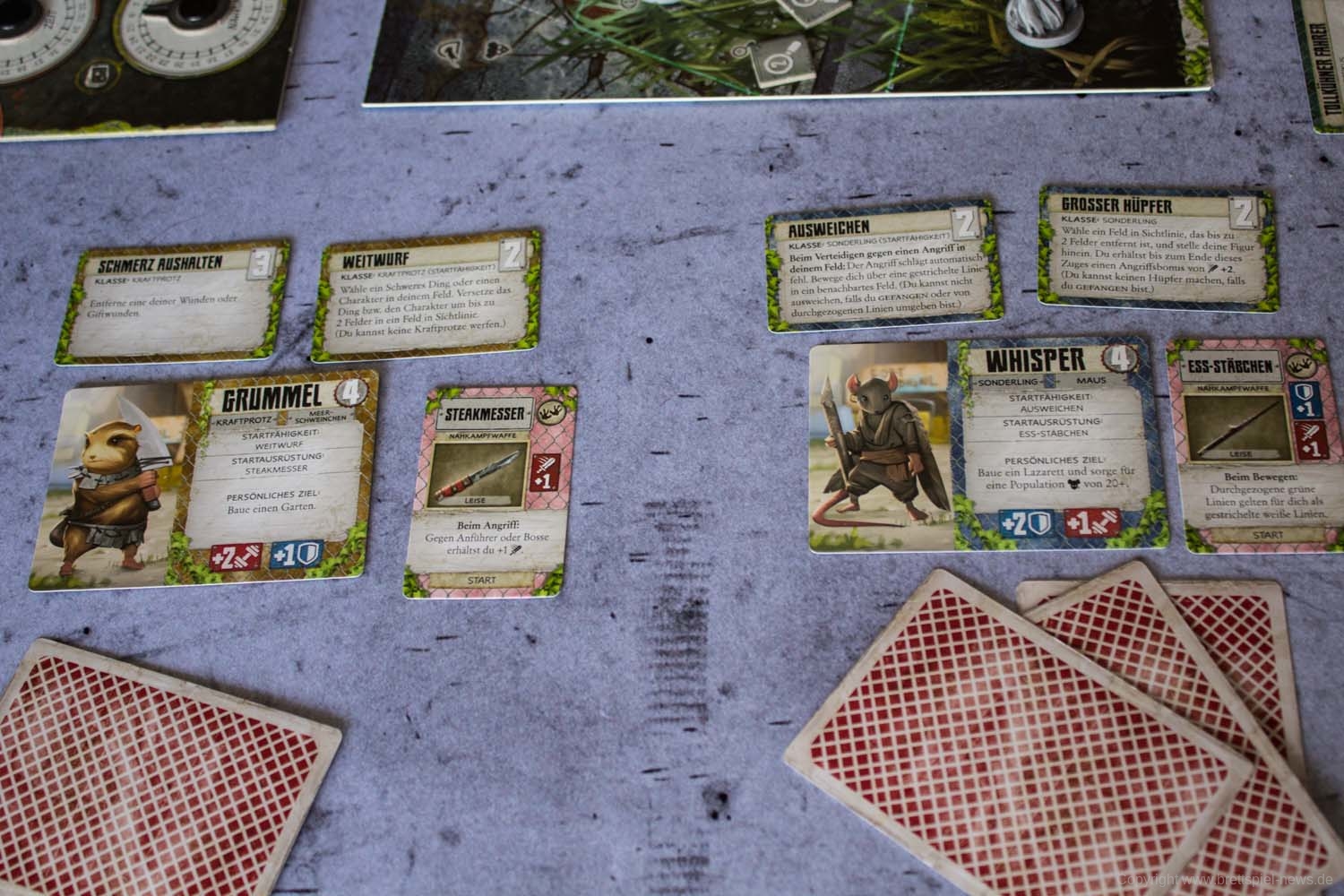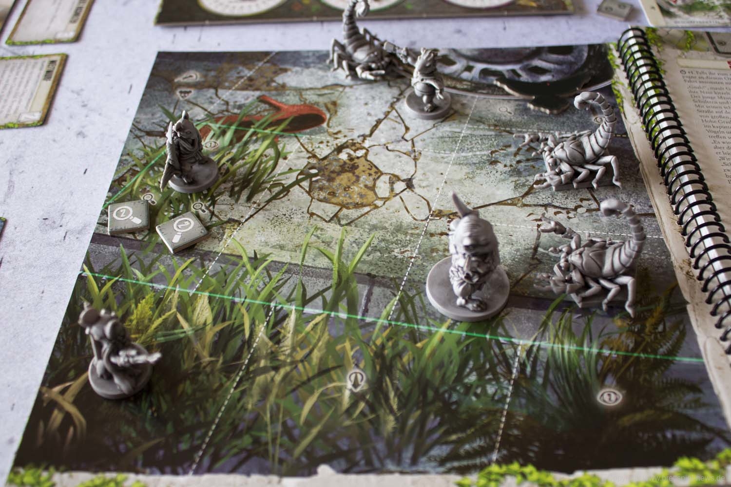 Wer die PLAID HAT GAMES-Abenteuerbuchspiele kennt, der wird gleich zu Beginn bemerken, dass der große Beutel mit Würfeln fehlt. Hat bislang das Ziehen von Würfeln über das Schicksal für den Zug entschieden, ist man nun auf das Wohl beim Ziehen von Karten angewiesen. Die Mechanik hat mir persönlich deutlich besser gefallen, inkl. dem Auslegen der Bedrohungskarten, über die am Ende auch die Aktionen der Gegner im Kampf gesteuert werden. Der Kampf an sich hat dabei allerdings nicht sonderlich an Komplexität gewonnen. Wie gewohnt ist es möglich, auch ohne entsprechende Waffe einen Fernkampf auszulösen bzw. bei fehlenden Karten ist es gar nicht möglich. Wichtig ist weiterhin, wo auf dem Spielfeld die eigene Miniatur abgestellt wird, da es auf ein und demselben Feld eine Sichtlinie zu einem Gegner geben kann oder aber auch nicht. Taktisch bleibt das Spiel somit recht überschaubar. Die gesamte Kampfmechanik ist wie gehabt nicht sonderlich anspruchsvoll, bietet nur wenig taktische Möglichkeiten und kann bestenfalls als solide bezeichnet werden.
